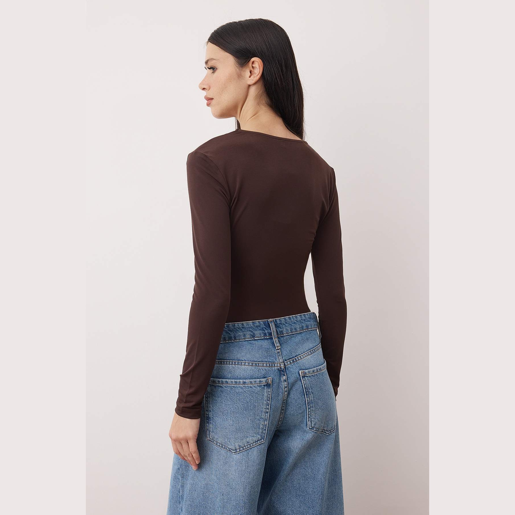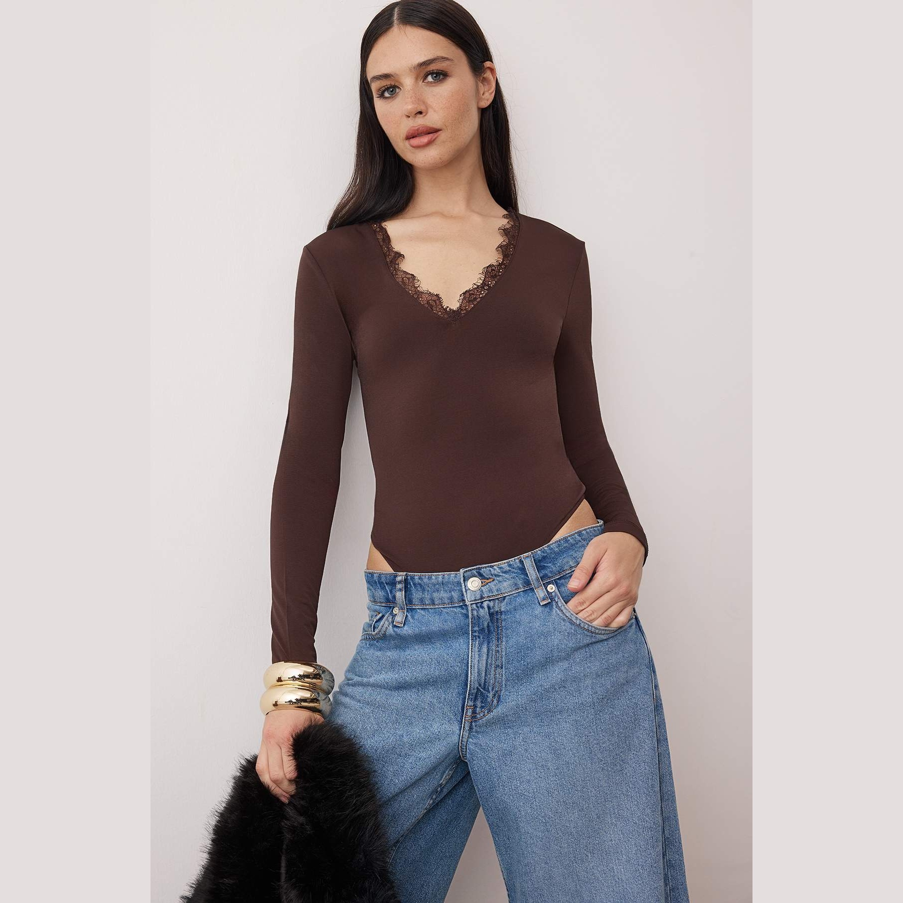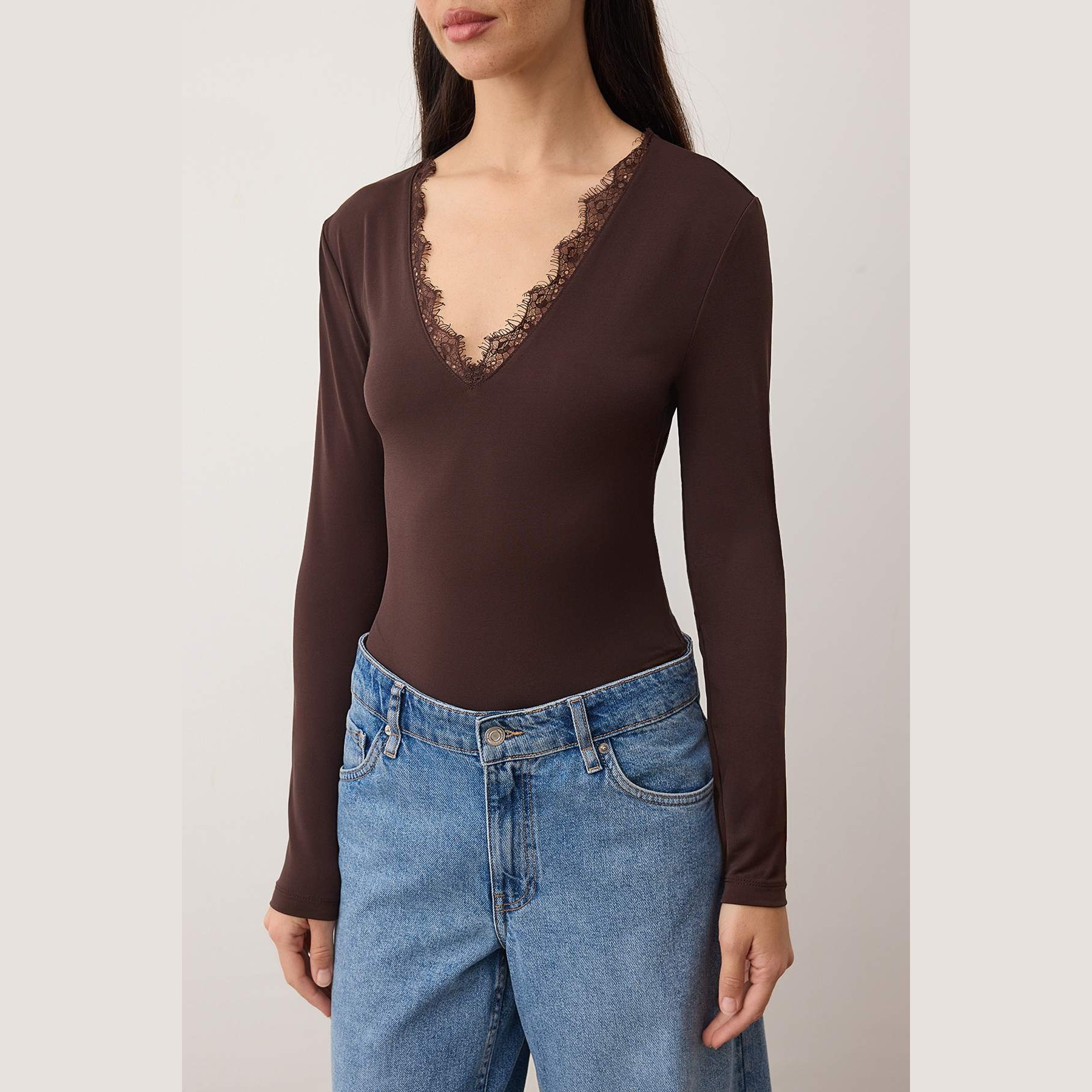 بودي نسائي بلون بني، مصنوع من خامة تريكو مطاطية بتركيبة قطنية مريحة، يتميز بياقة V مزينة بالدانتيل تضيف لمسة أنثوية راقية، مع قصة Fitted تبرز القوام، وإغلاق سفلي بصَفّاطات عملية. تصميم مثالي للإطلالات اليومية أو المسائية المحتشمة.