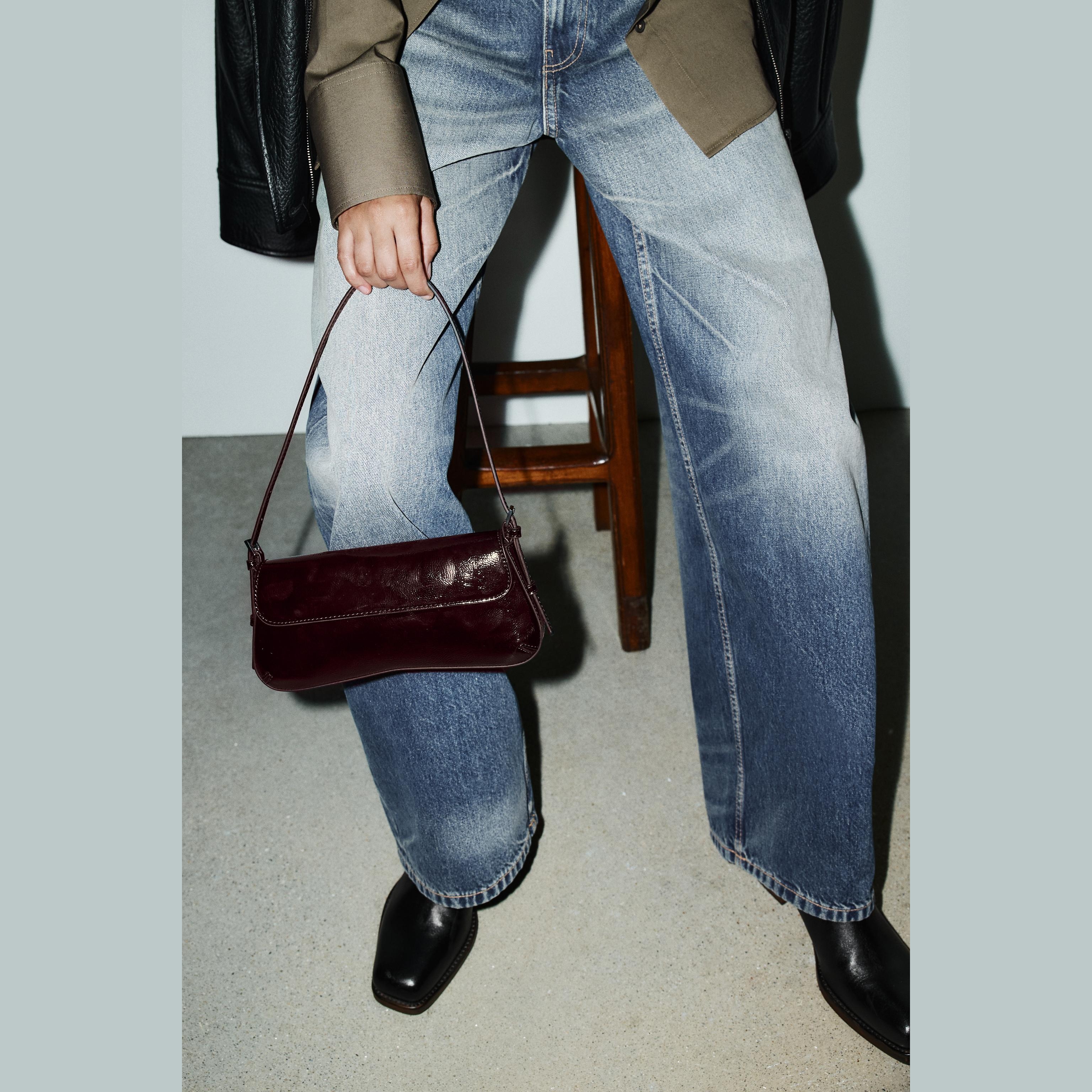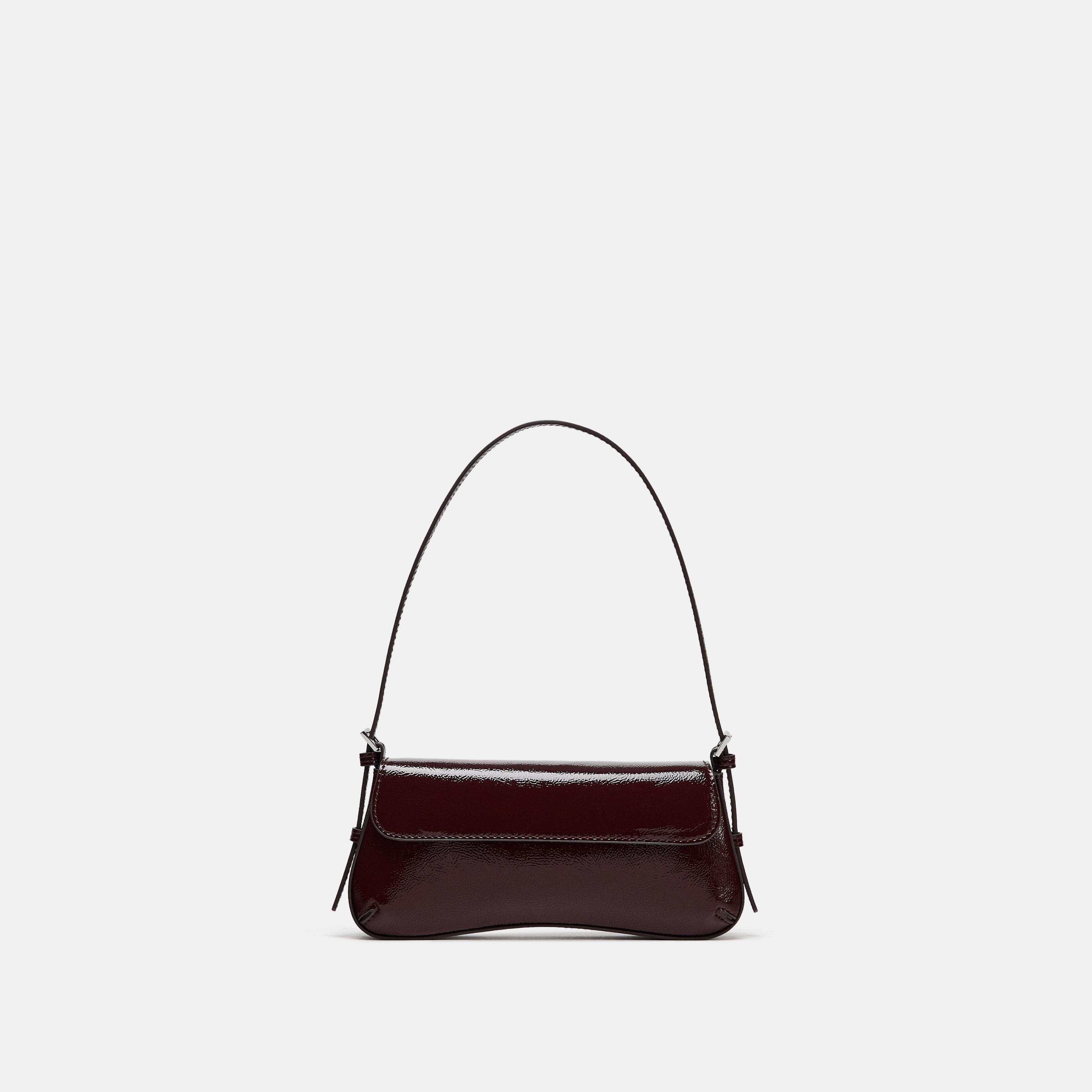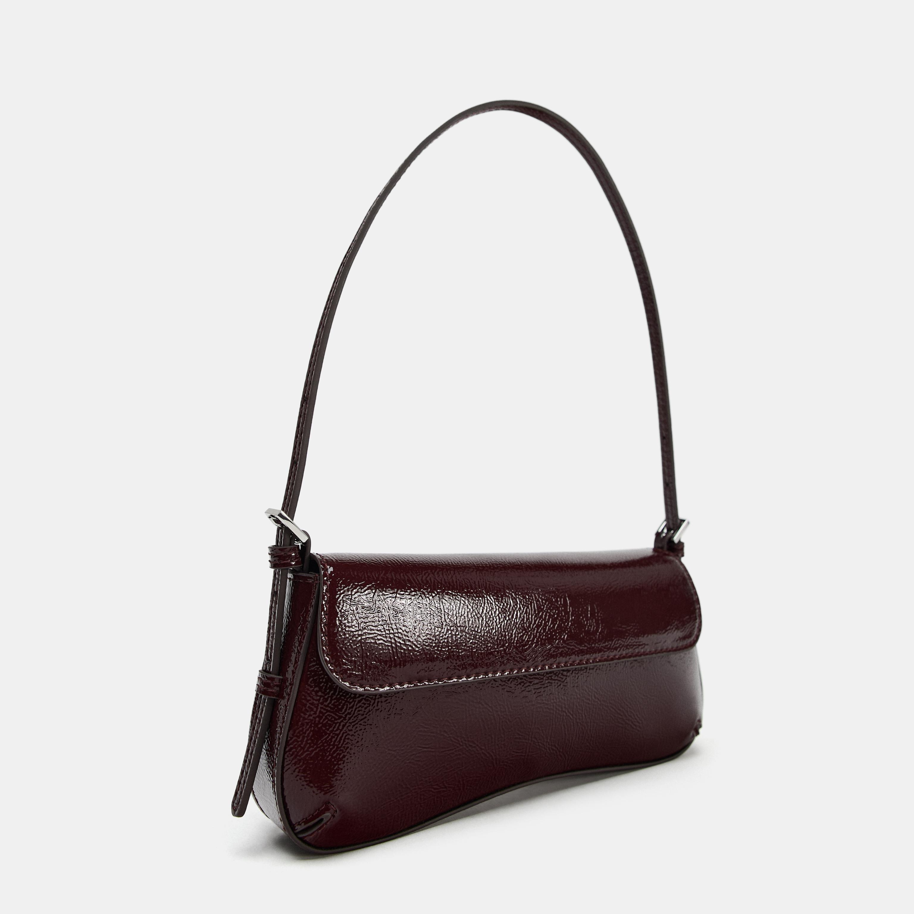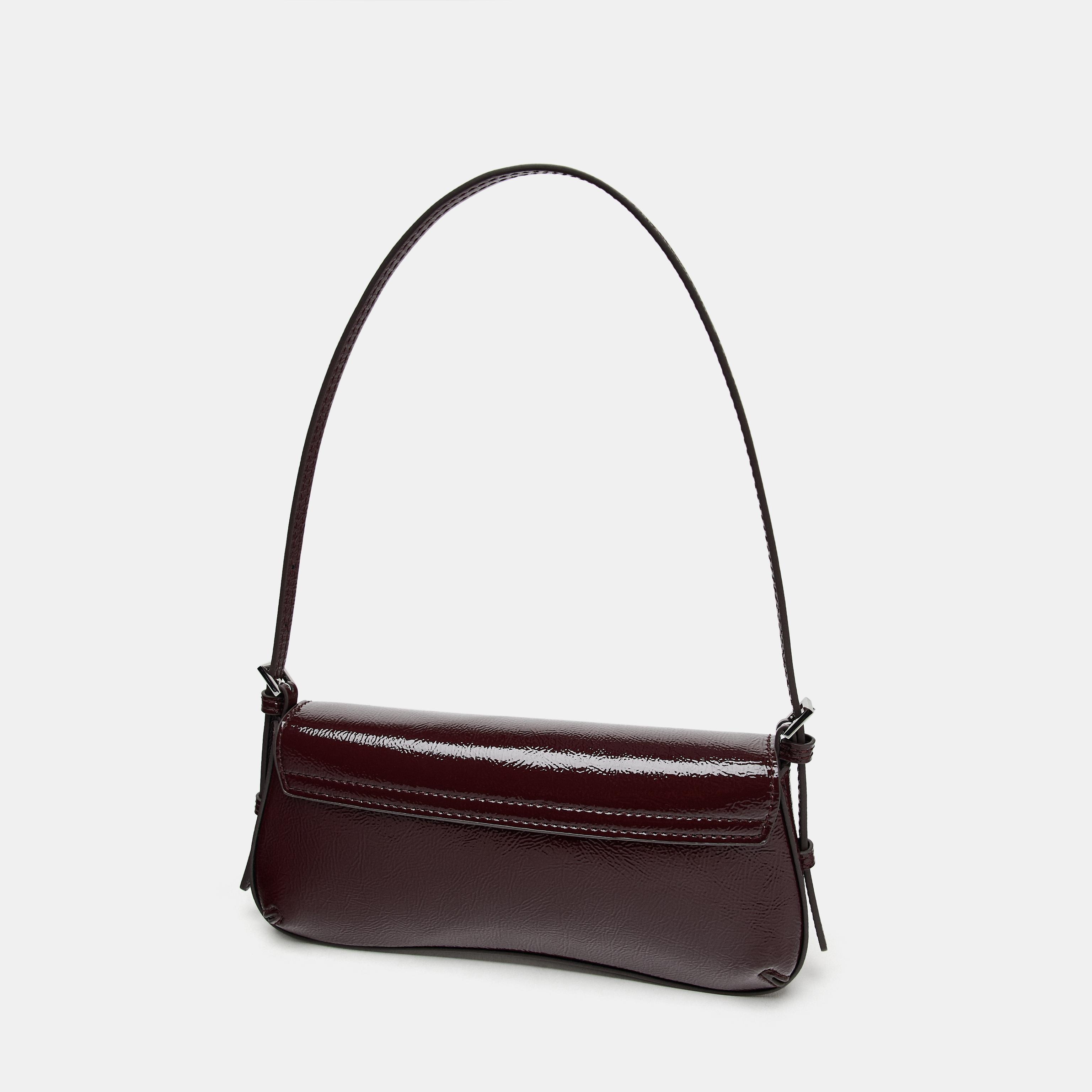 حقيبة كتف صغيرة أنيقة بلون أحمر خمري مميز، مصنوعة من خامة صناعية بلمعة بديعة (Patent Effect)، مزودة بحزام كتف قابل للتعديل لتعدد طرق الحمل. تتميز بغطاء أمامي مع إغلاق مغناطيسي عملي، وتصميم مدمج مثالي للإطلالات اليومية أو المسائية.