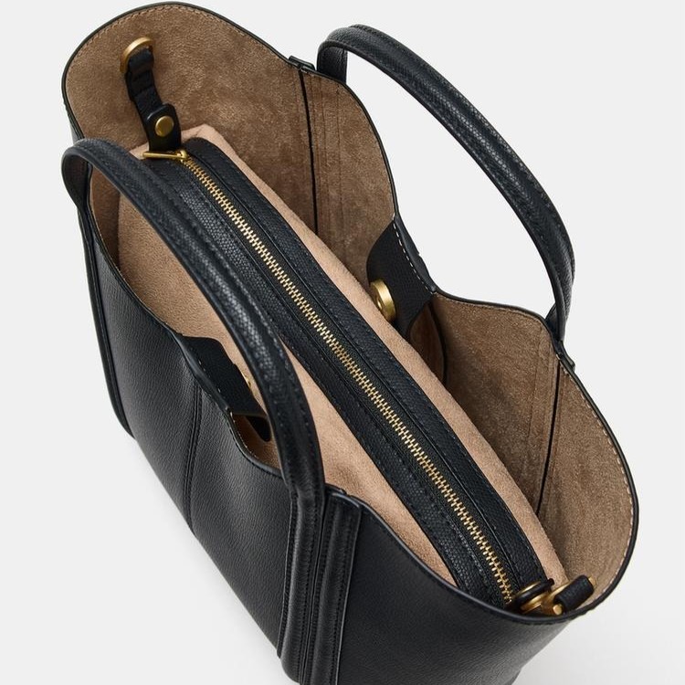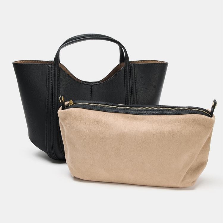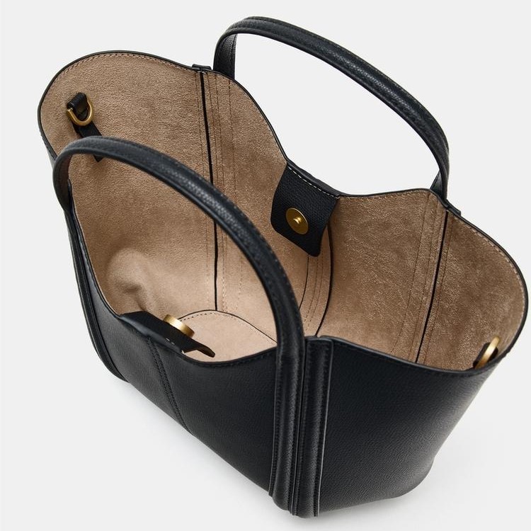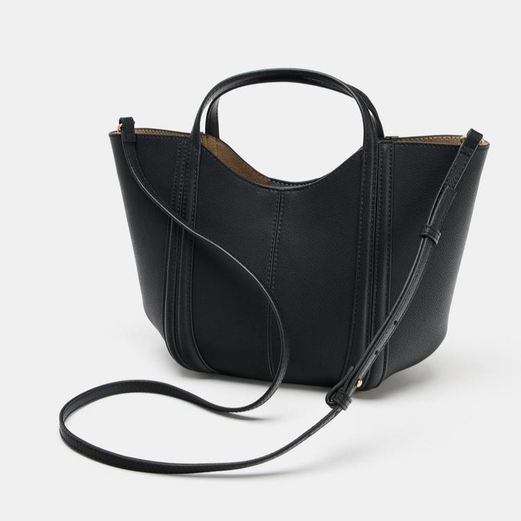 حقيبة صغيرة أنيقة بلون أسود كلاسيكي، مصنوعة من خامة صناعية عالية الجودة مع تفاصيل خياطة بارزة تضيف لمسة عصرية. مزودة بمقبض علوي وحزام كتف طويل قابل للفصل، بالإضافة إلى حقيبة داخلية صغيرة بسحاب. تصميم مثالي للإطلالات اليومية أو الكاجوال العملية.