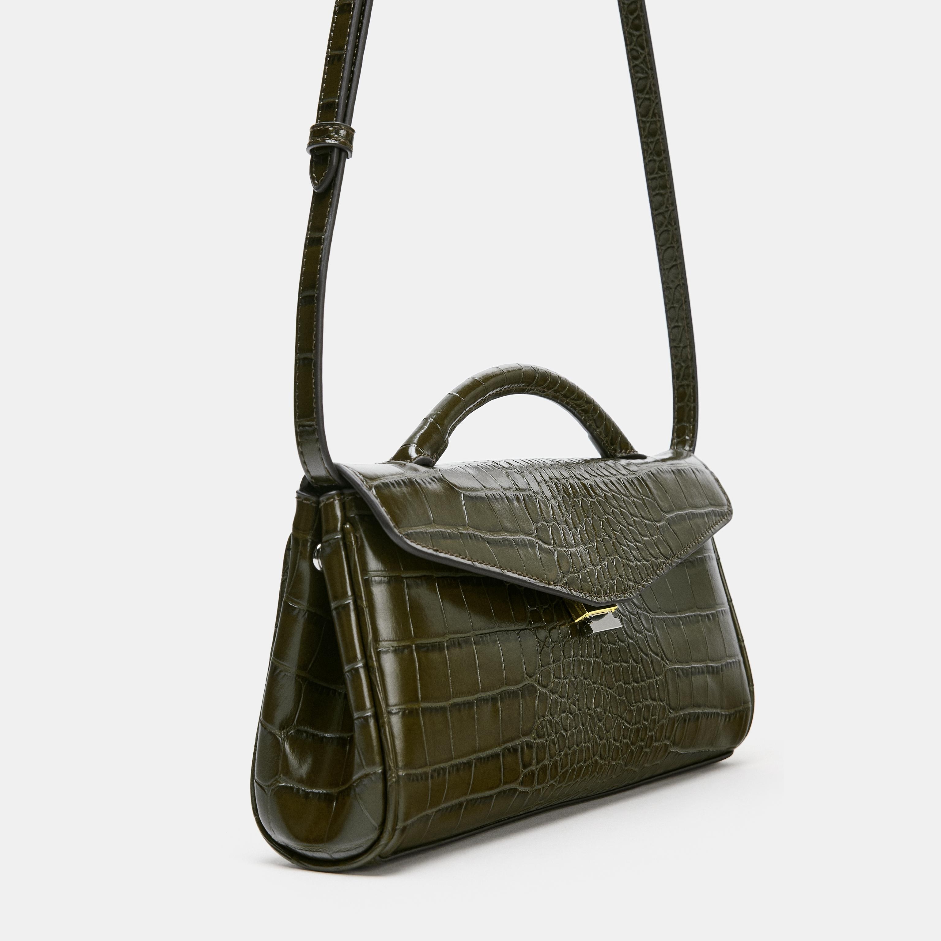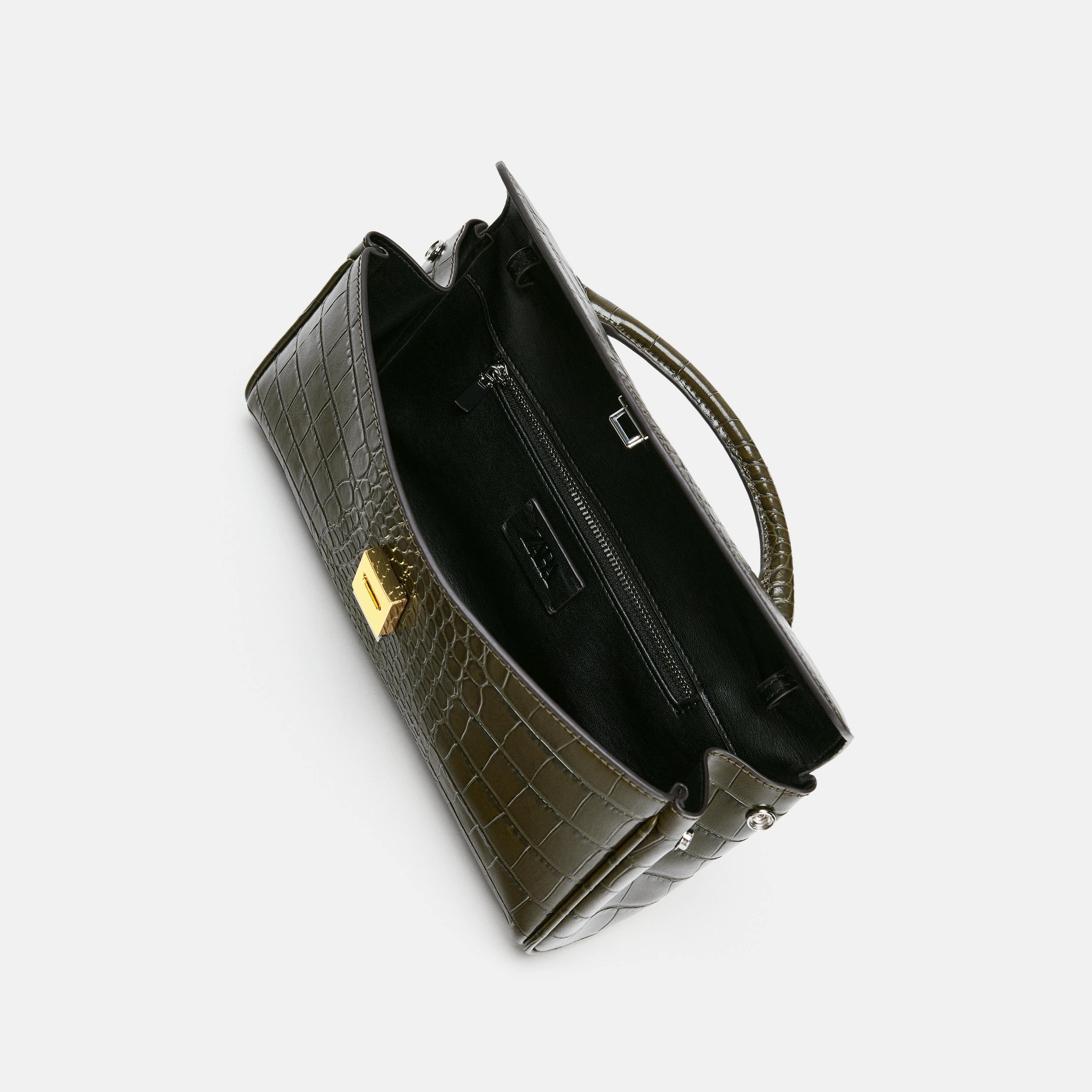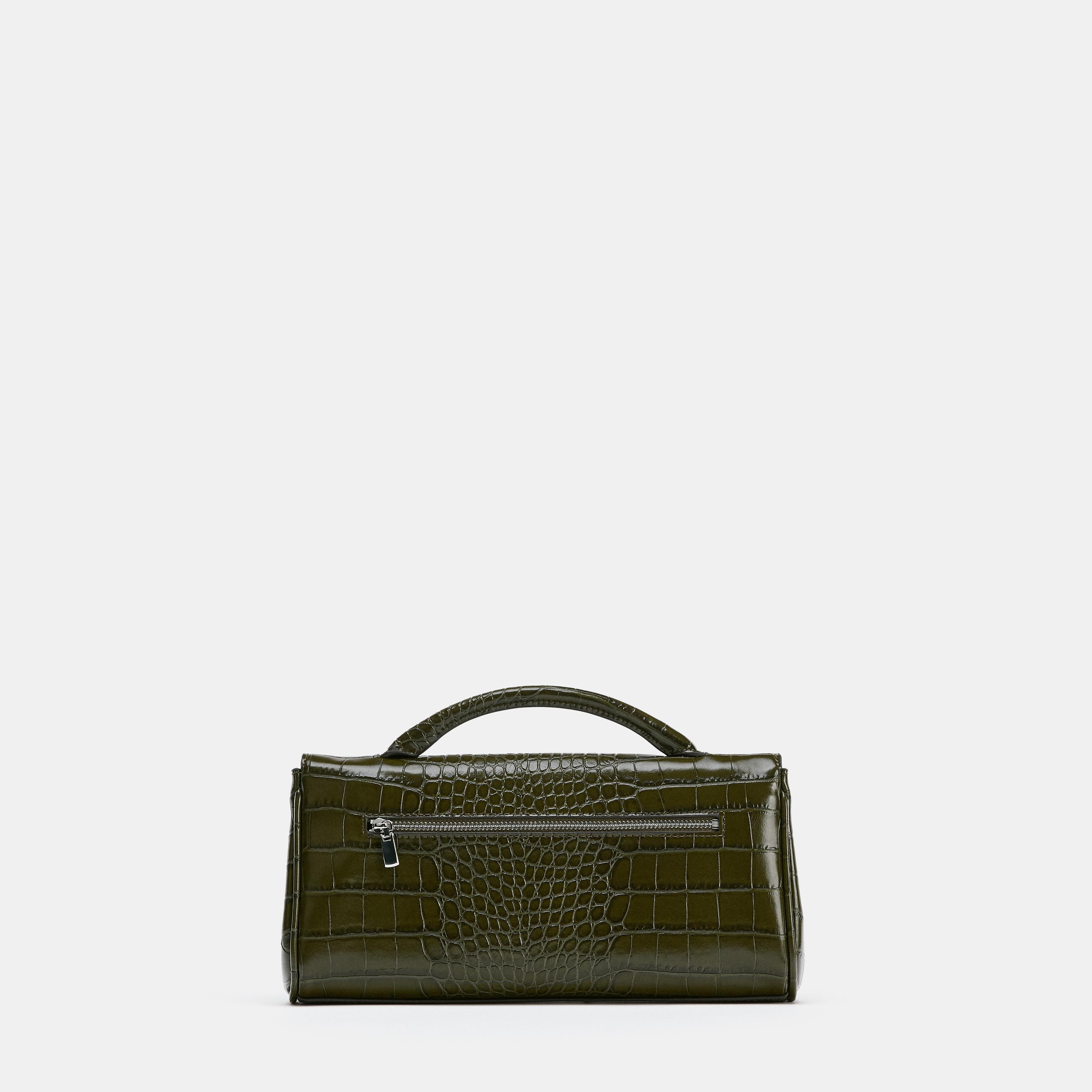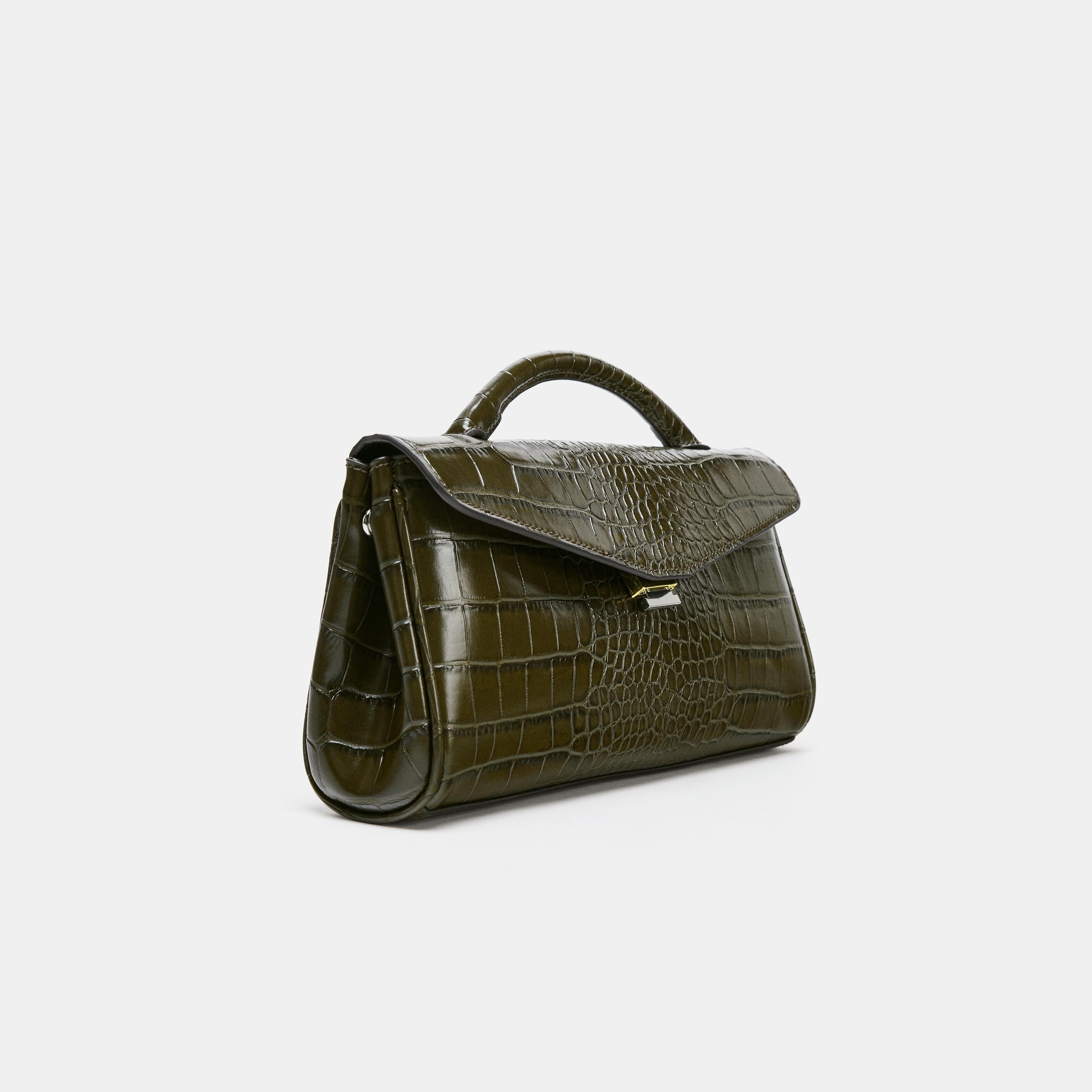 حقيبة يد أنيقة بلون أخضر عصري، مصنوعة من خامة صناعية عالية الجودة بملمس مزخرف. مزودة بمقبض علوي وحزام كتف طويل قابل للفصل، مع جيب داخلي بسحاب وإغلاق أمامي بمشبك معدني. تصميم مثالي للإطلالات اليومية أو الكاجوال العملية.