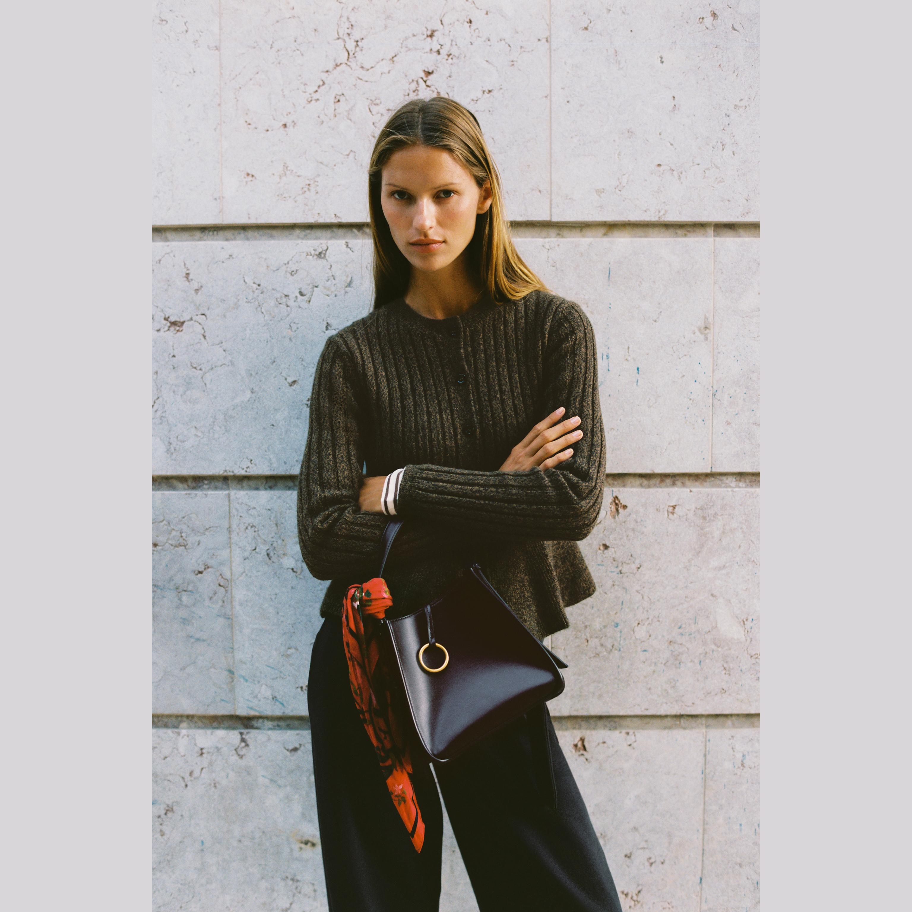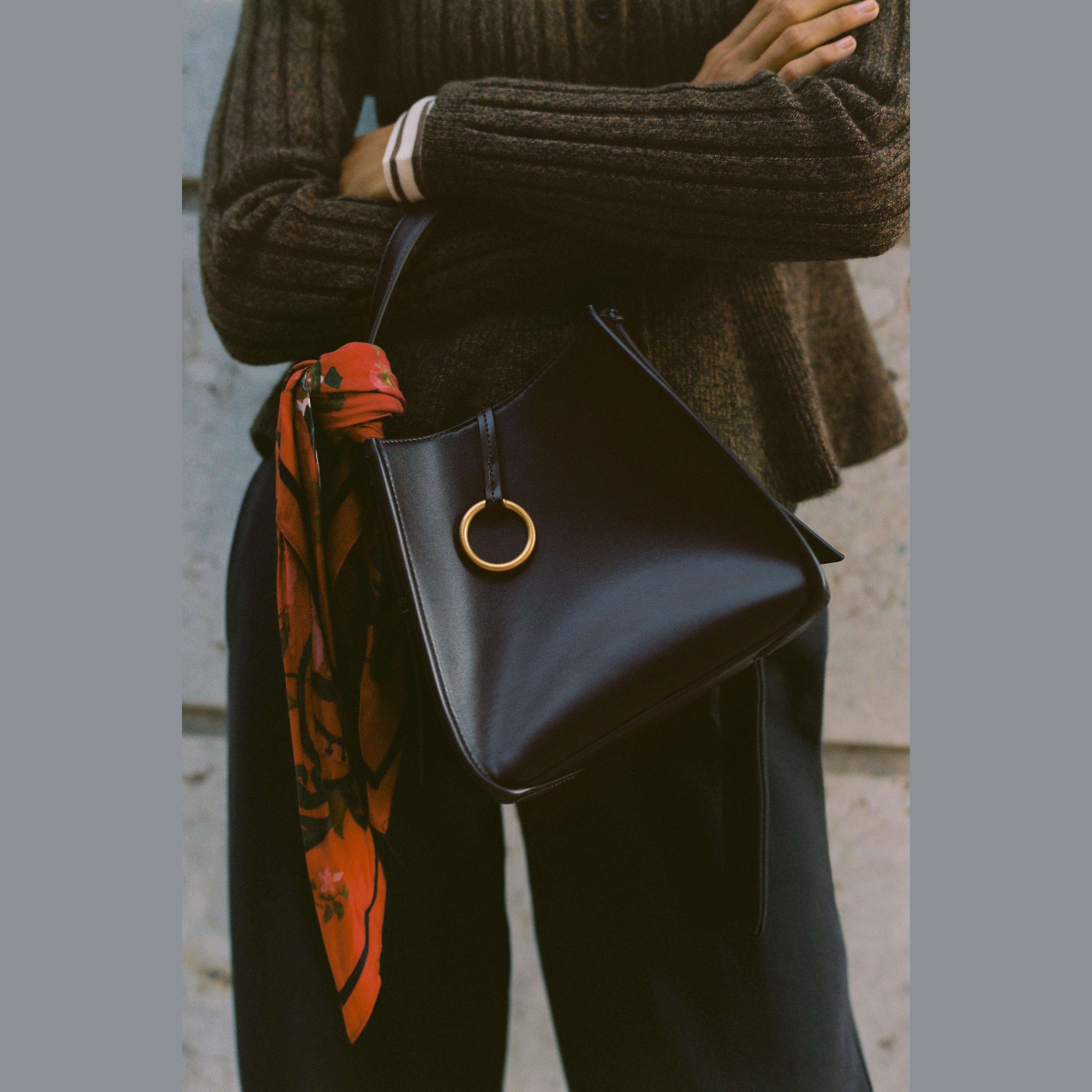 - التصميم: حقيبة باكيت صغيرة (Mini Bucket Bag) مع حلقة معدنية أمامية