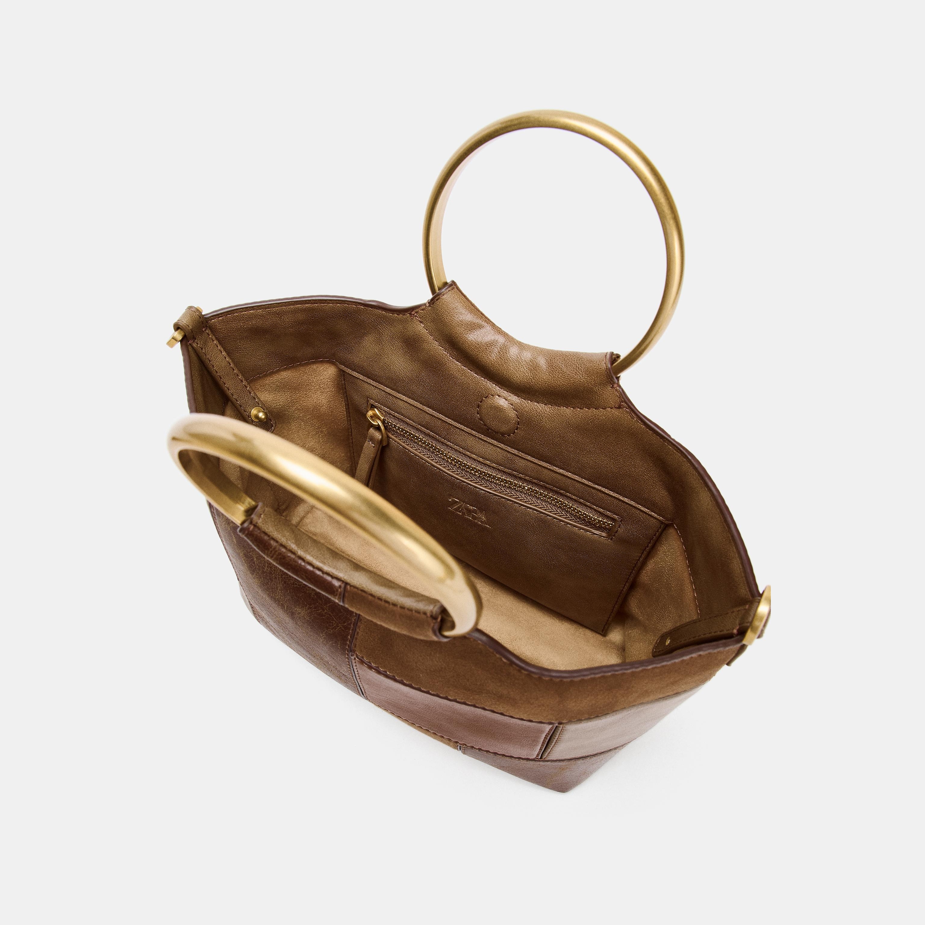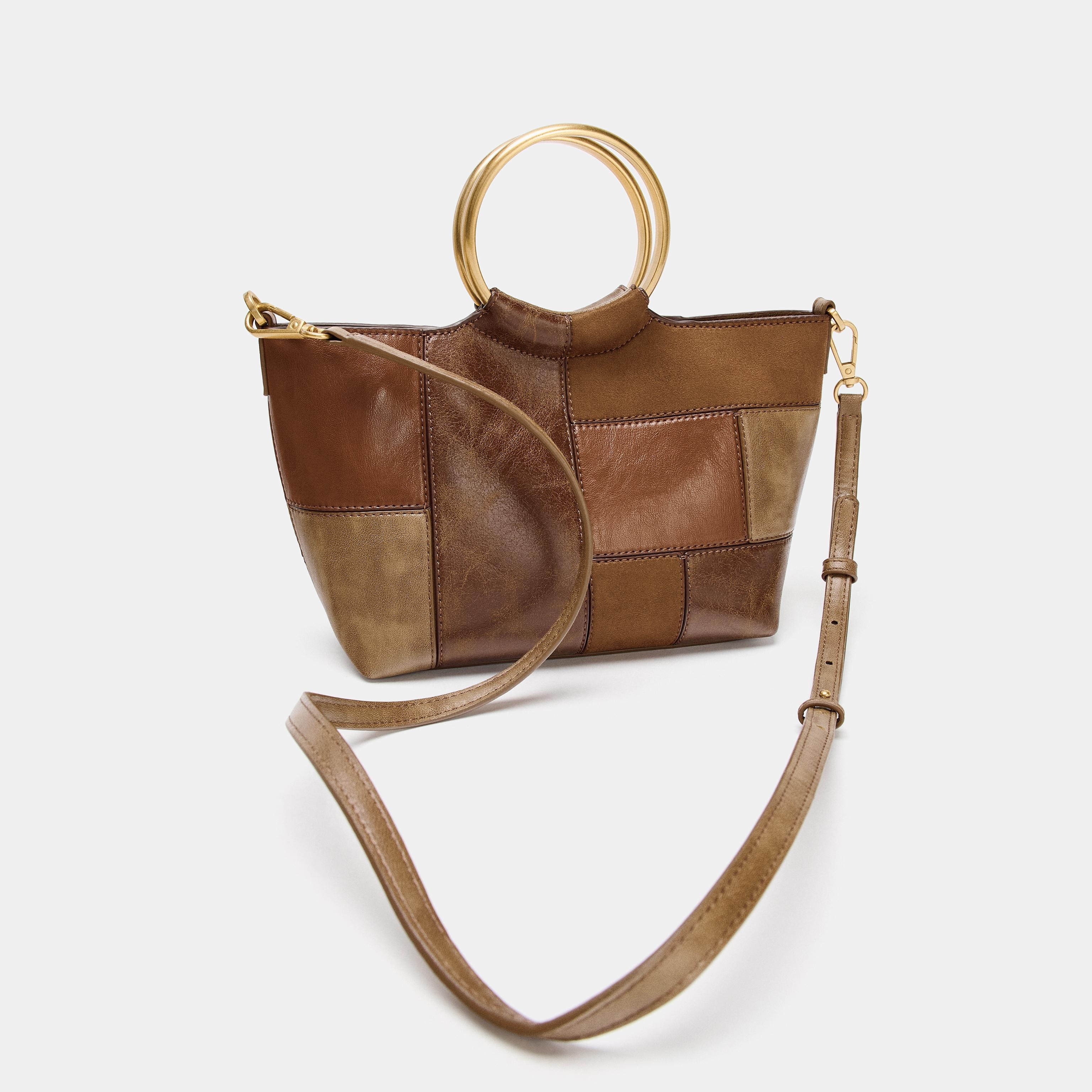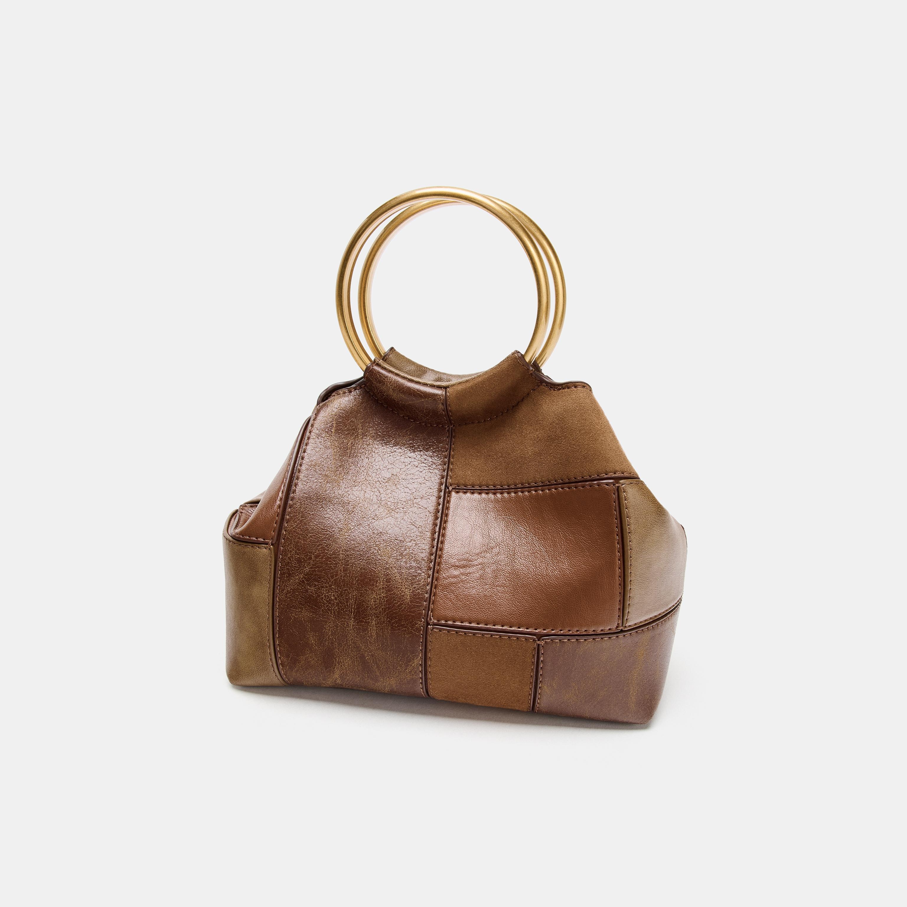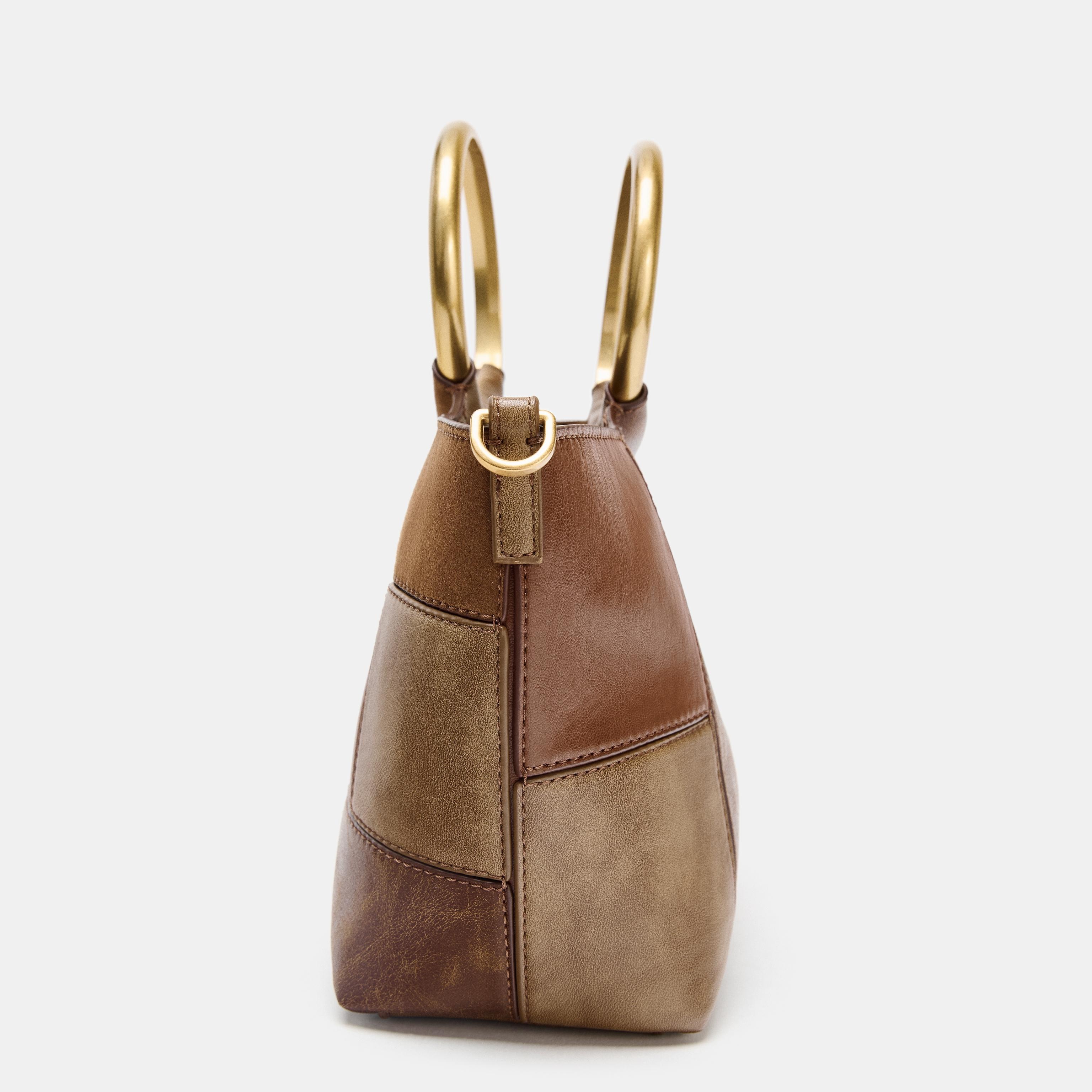 حقيبة باكيت صغيرة – متعددة الألوان، بتصميم باتشوورك ومقابض معدنية صلبة (Patchwork Mini Bucket Bag with Rigid Handles)