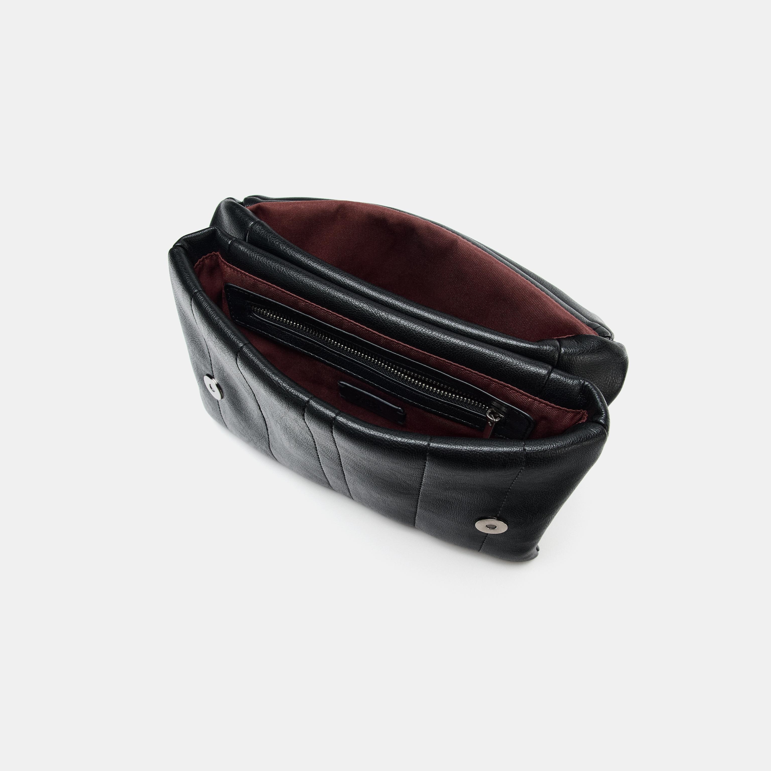 حقيبة كروس أنيقة بلون أسود كلاسيكي، مصنوعة من خامة صناعية عالية الجودة، بتصميم مبطن عصري مع سلسلة كتف معدنية مزينة بتعليقات أنيقة. مزودة بثلاثة أقسام داخلية عملية وإغلاق أمامي بغطاء مع مشبك مغناطيسي، لتمنحك مزيجًا مثاليًا من الأناقة والوظيفية في الاستخدام اليومي أو المناسبات.