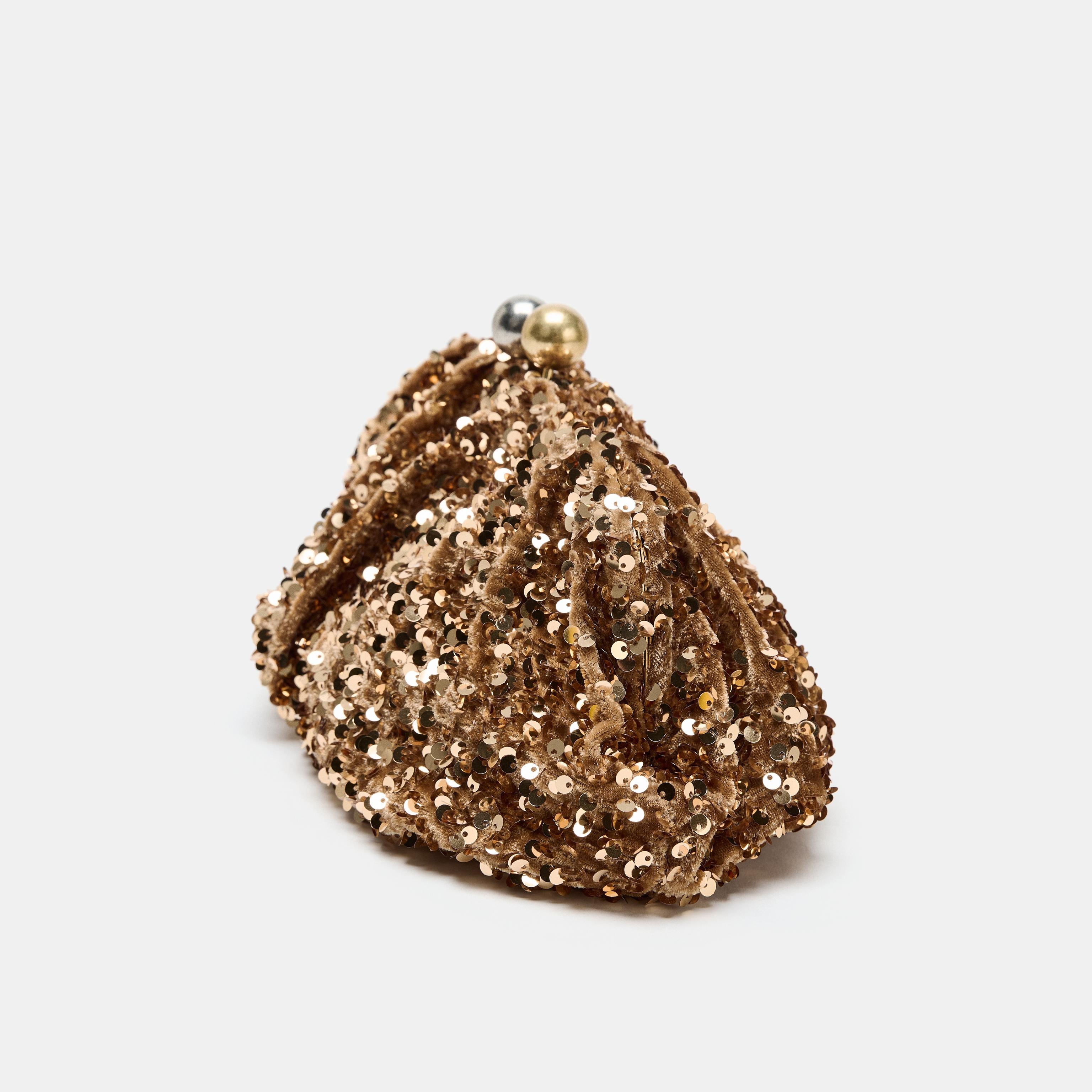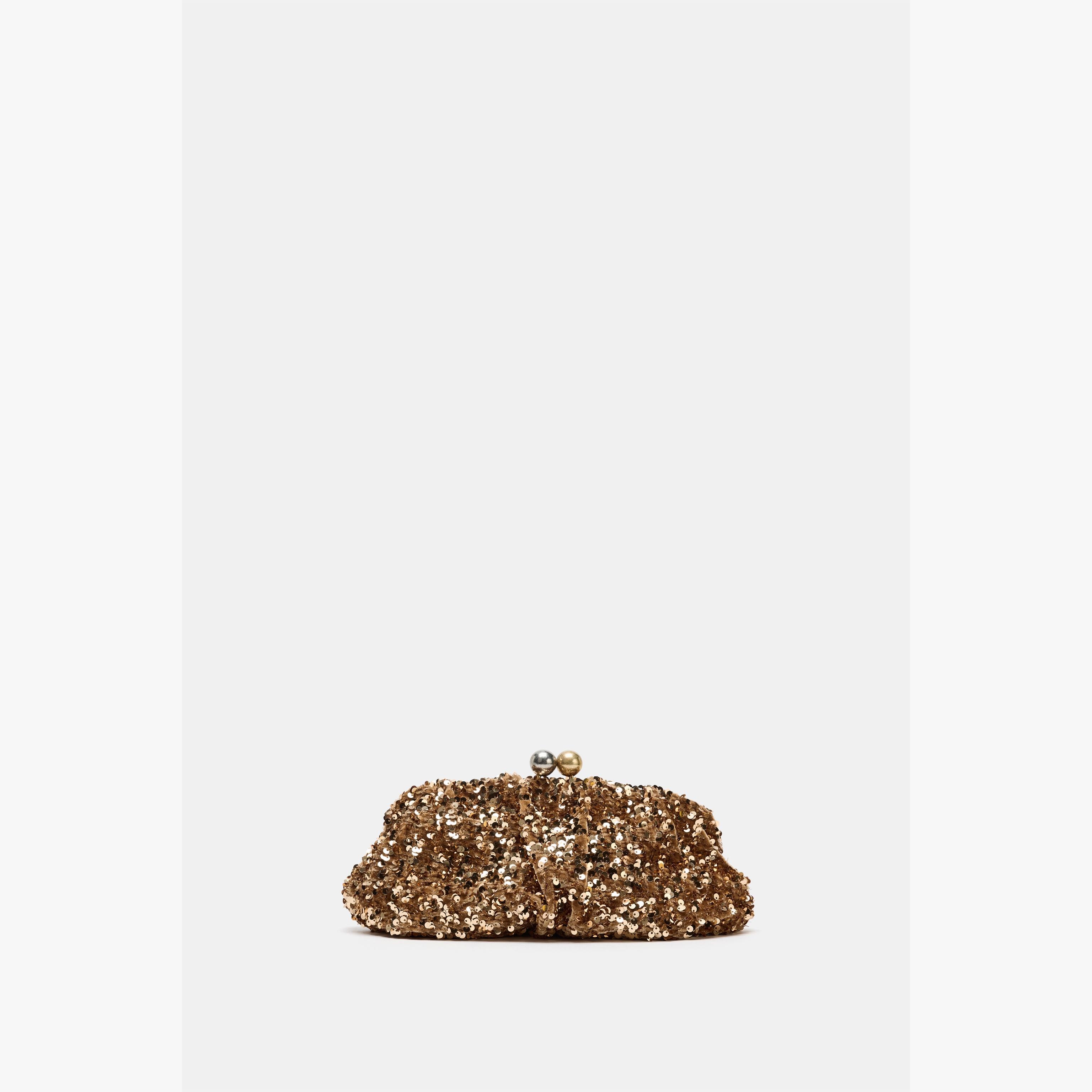 حقيبة كلاتش نسائية – ذهبي، بترتر لامع وسلسلة كتف معدنية قابلة للفصل (Sequin Clutch Bag)
