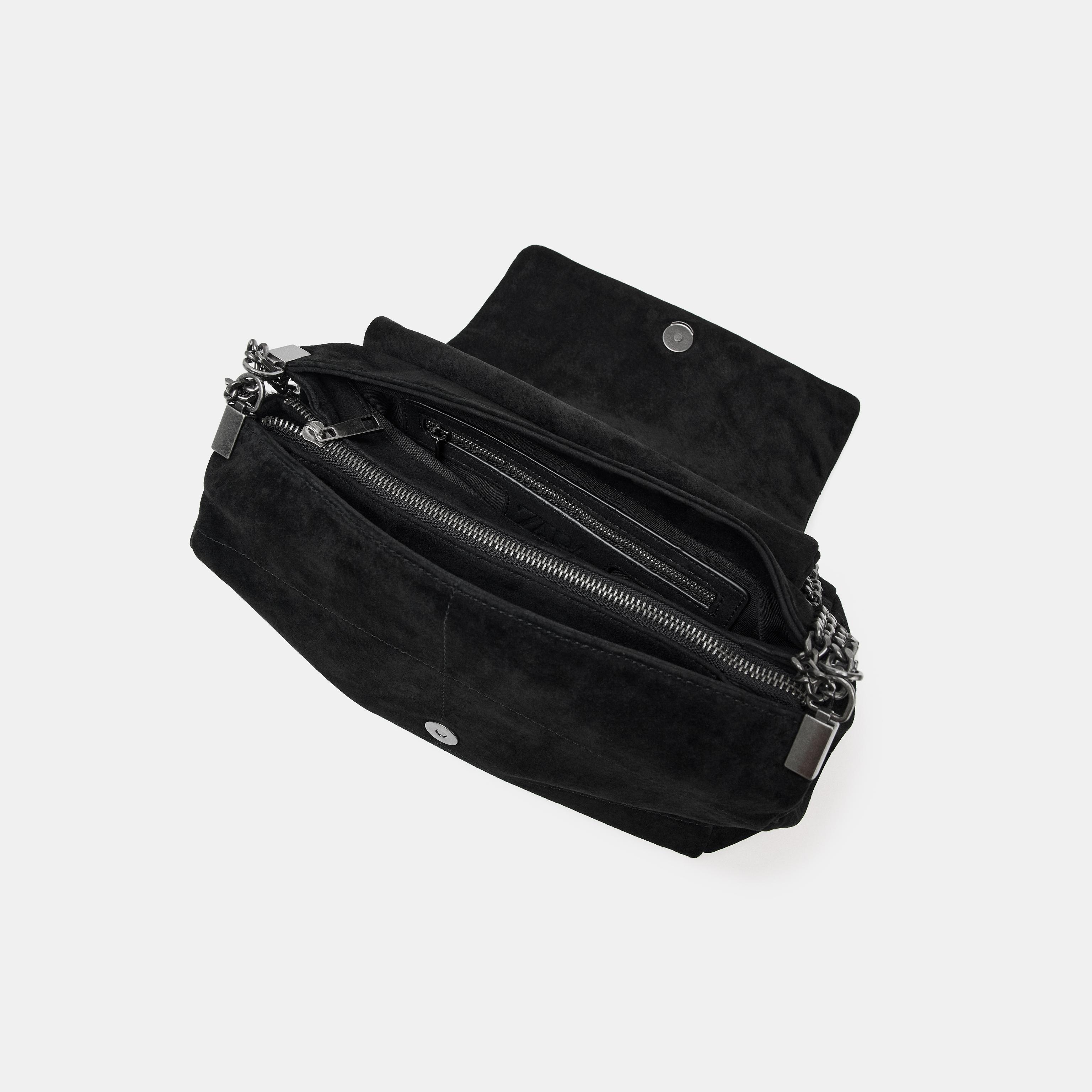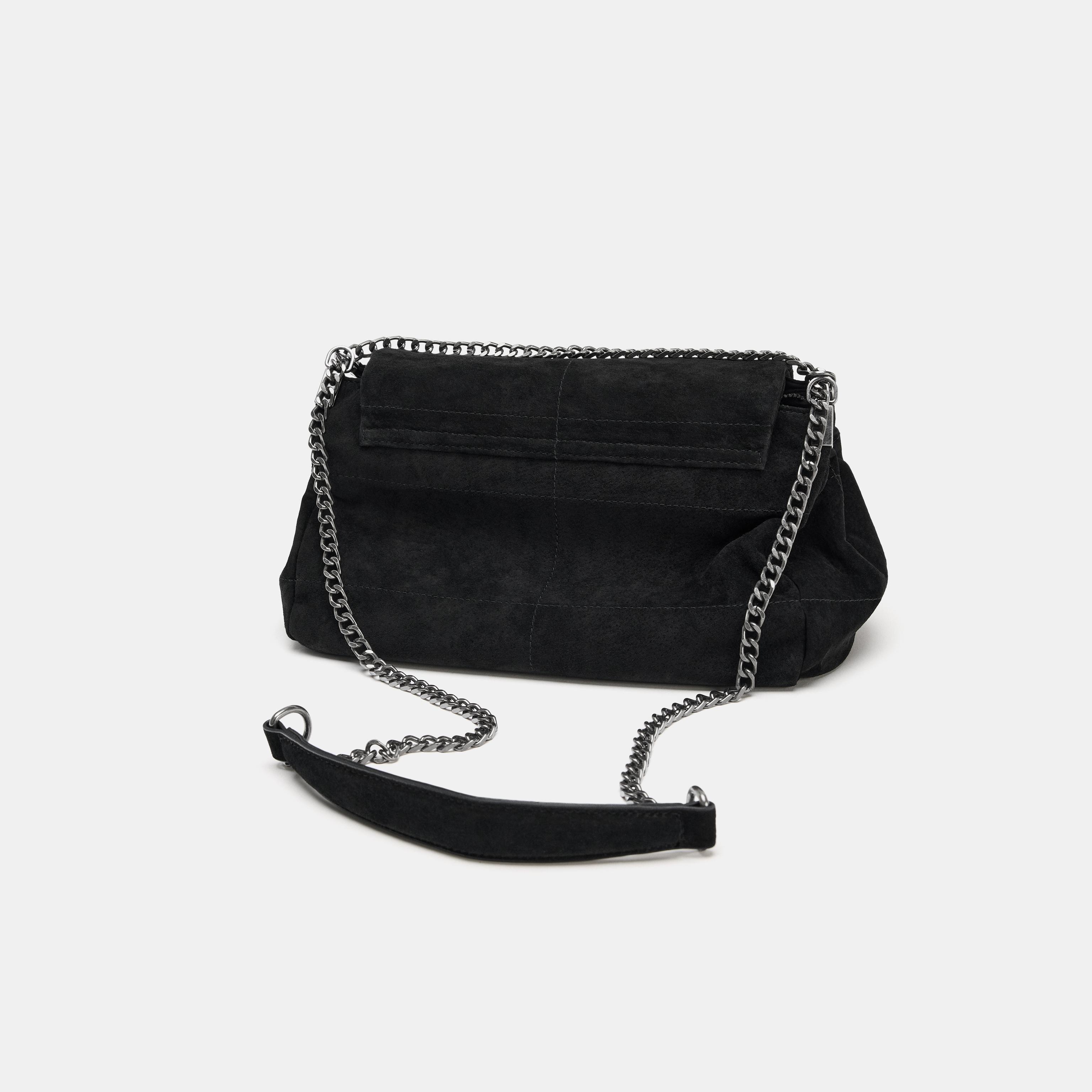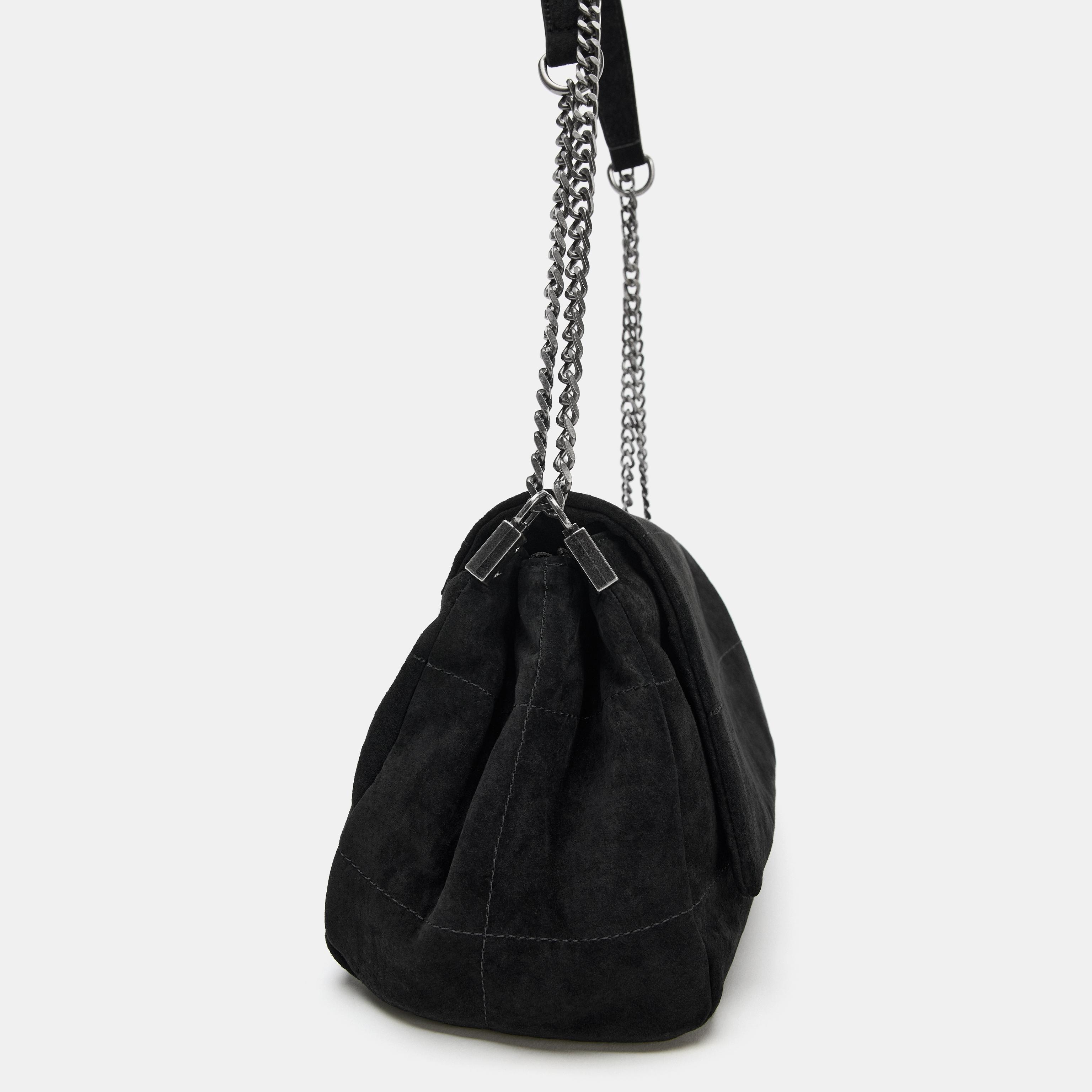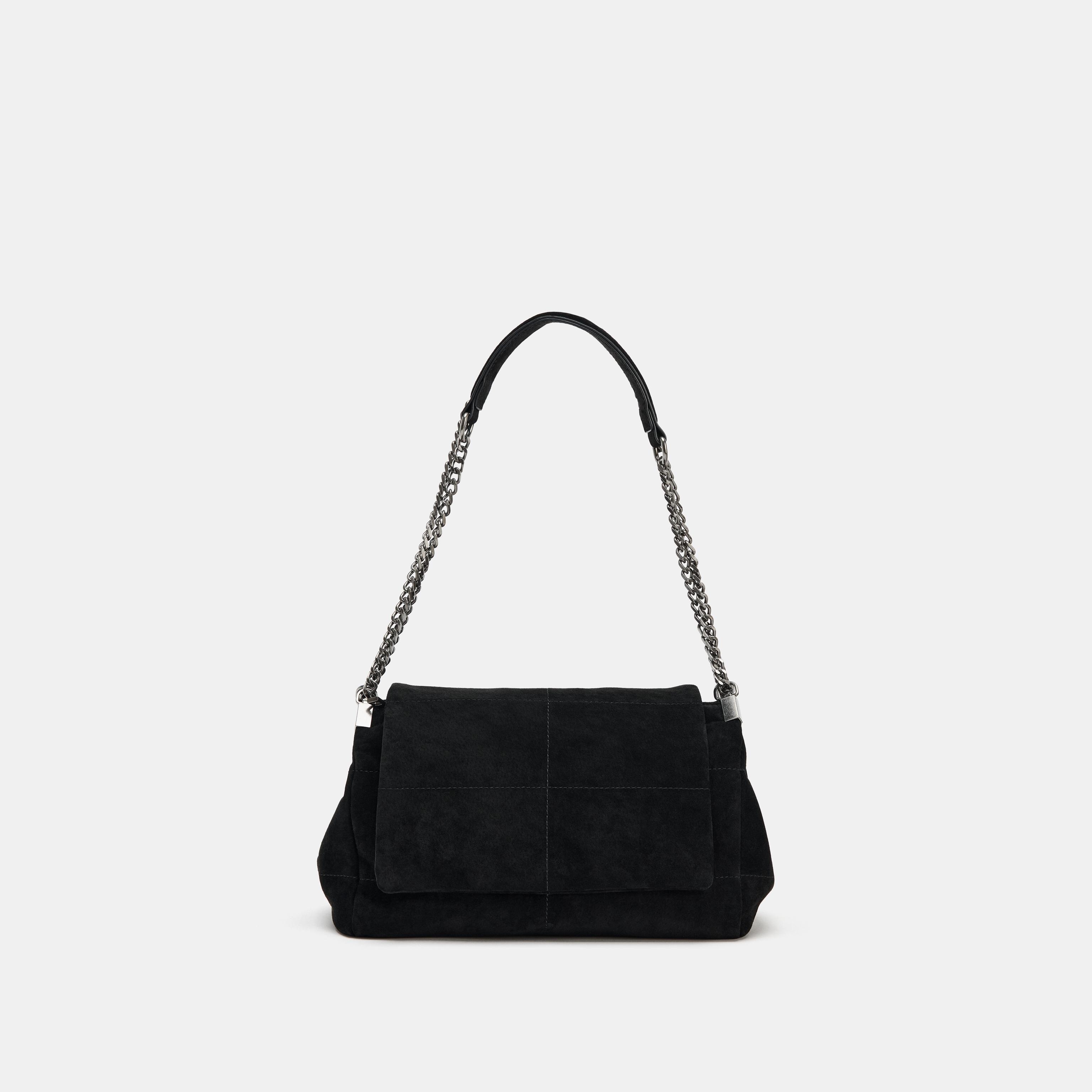 حقيبة كتف أنيقة بلون أسود كلاسيكي، مصنوعة من جلد طبيعي عالي الجودة مع تفاصيل معدنية تضيف لمسة فاخرة. مزودة بحزام كتف معدني مع لمسات زخرفية، وجيوب متعددة بسحّاب معدني، مع إغلاق مغناطيسي وغطاء أمامي. تصميم مثالي للإطلالات اليومية أو المناسبات الخاصة.