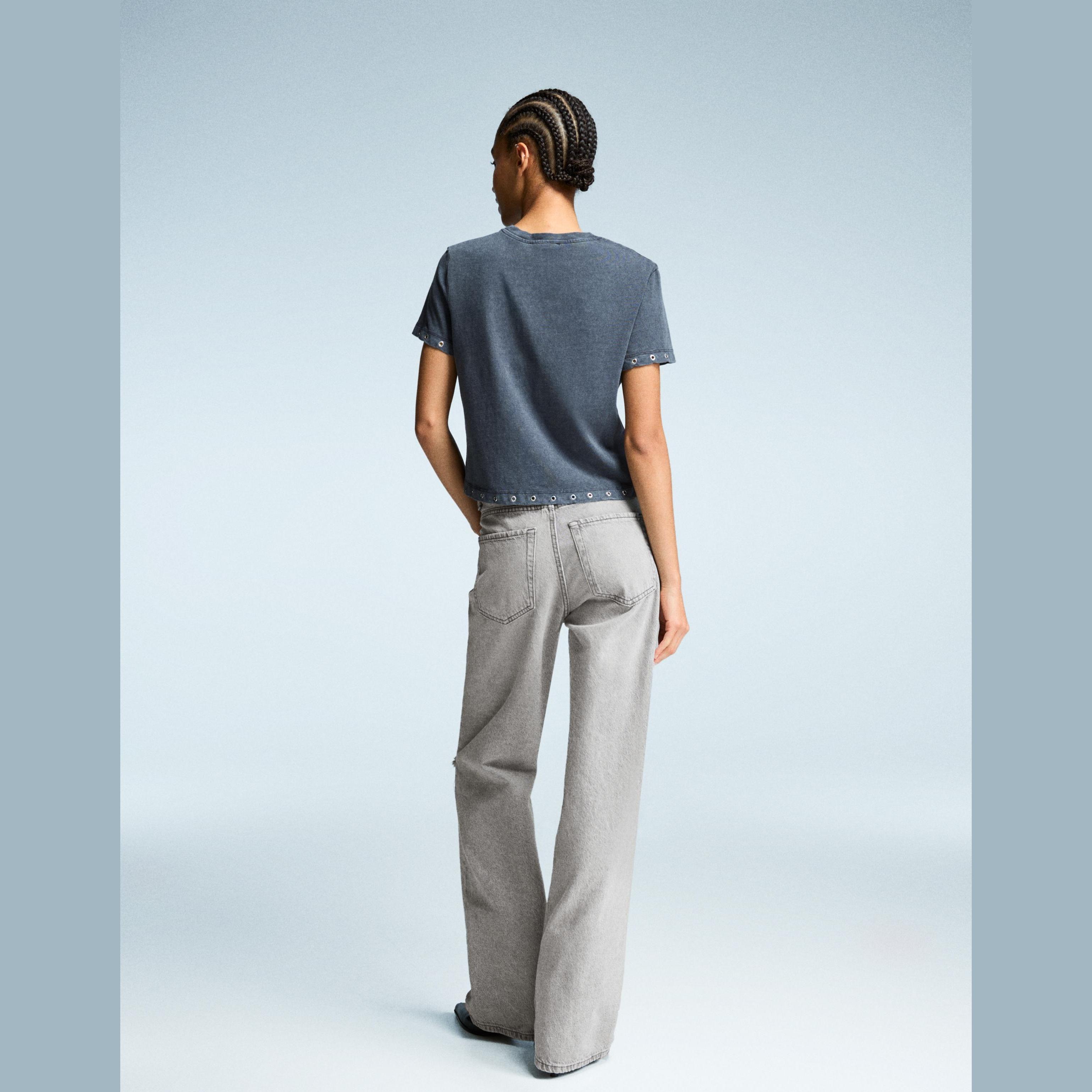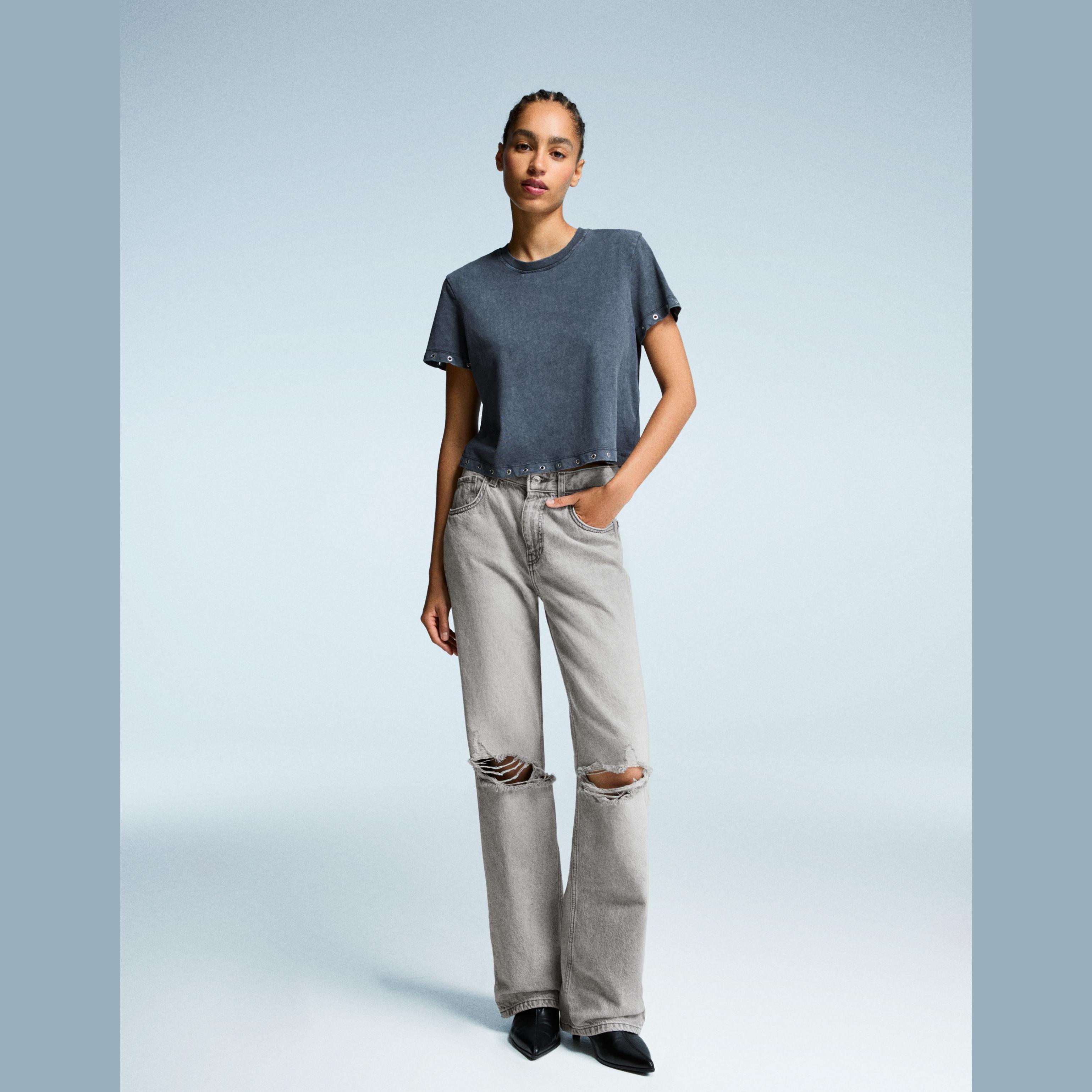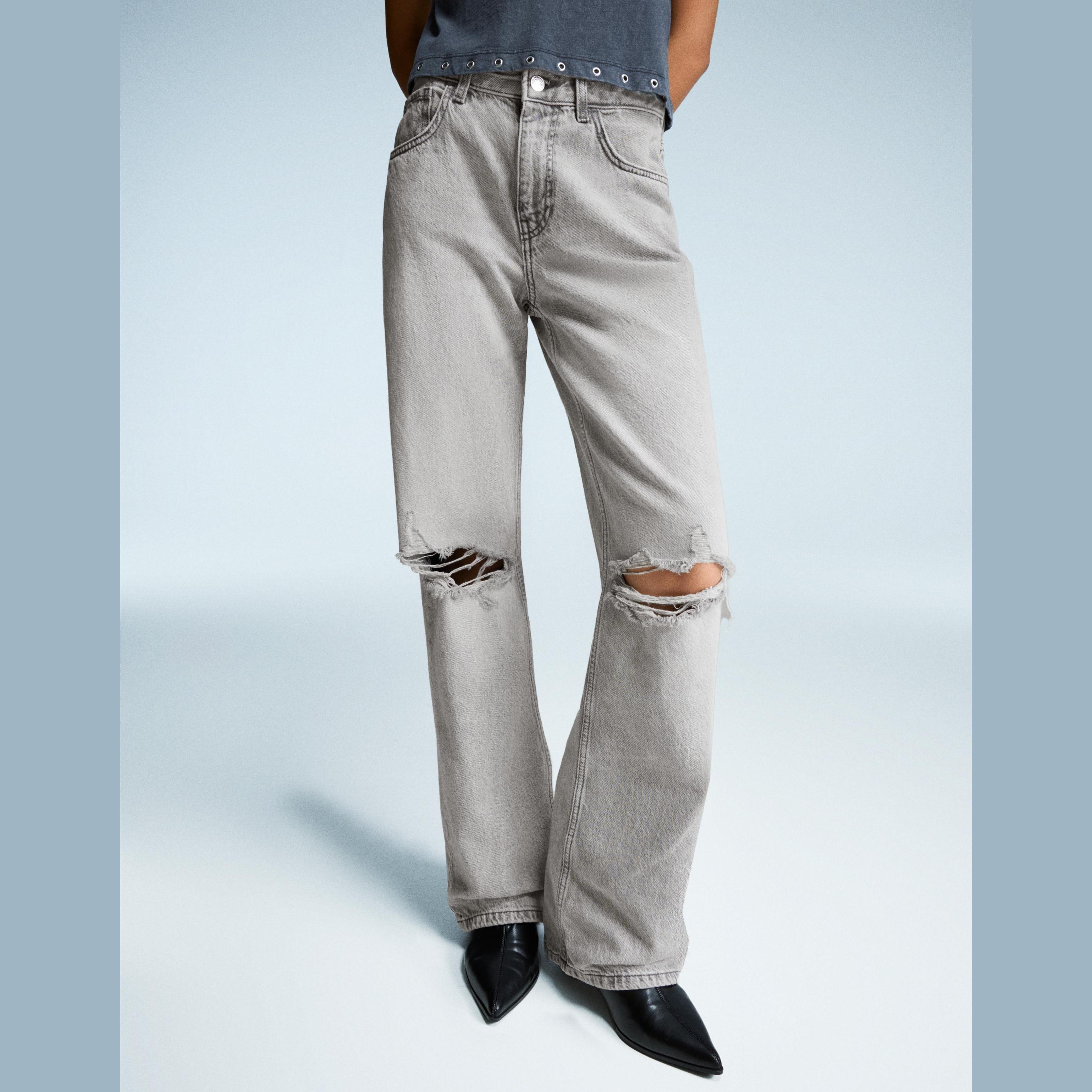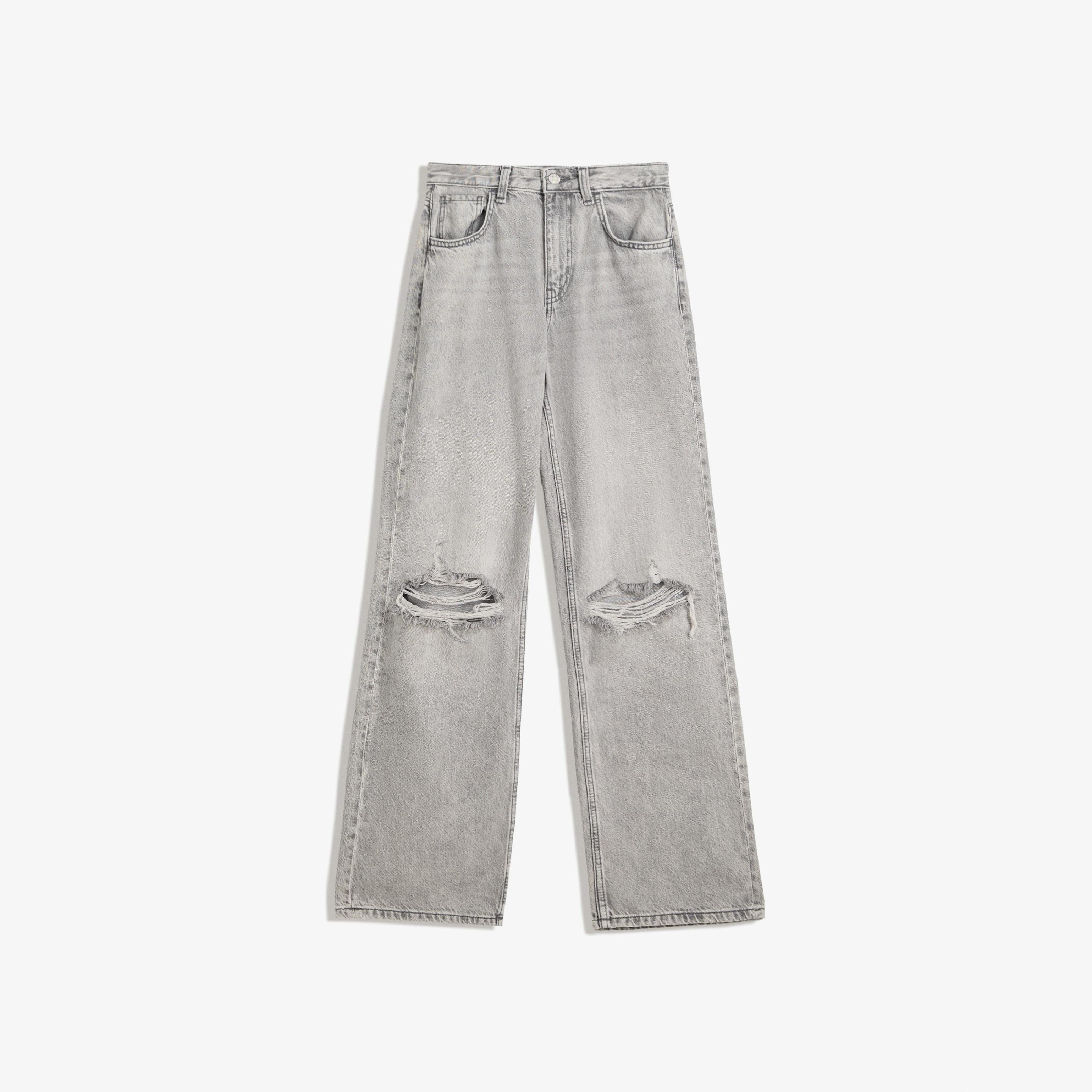 Bershka – جينز واسع الساق بتمزيقات للفتيات بلون رمادي داكن