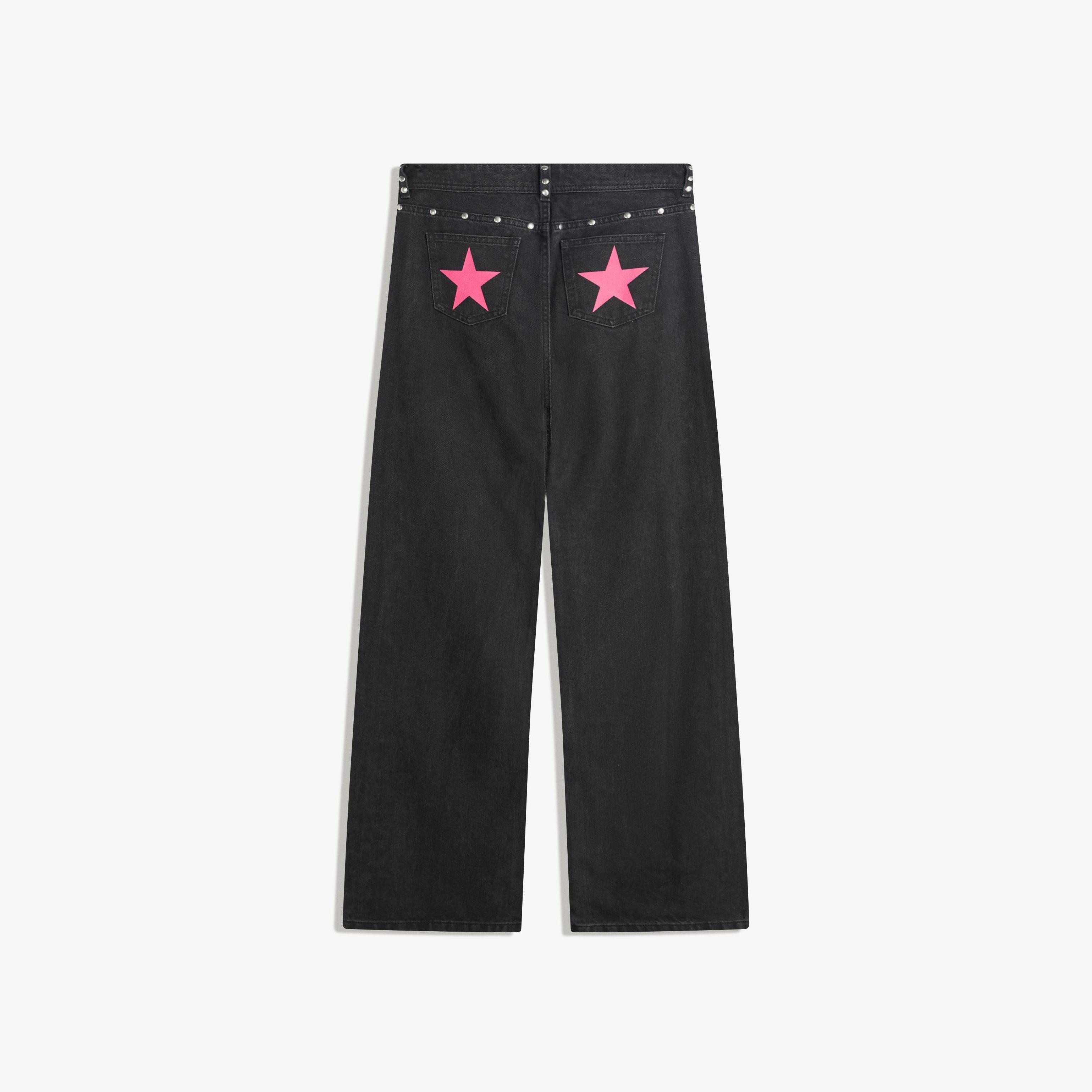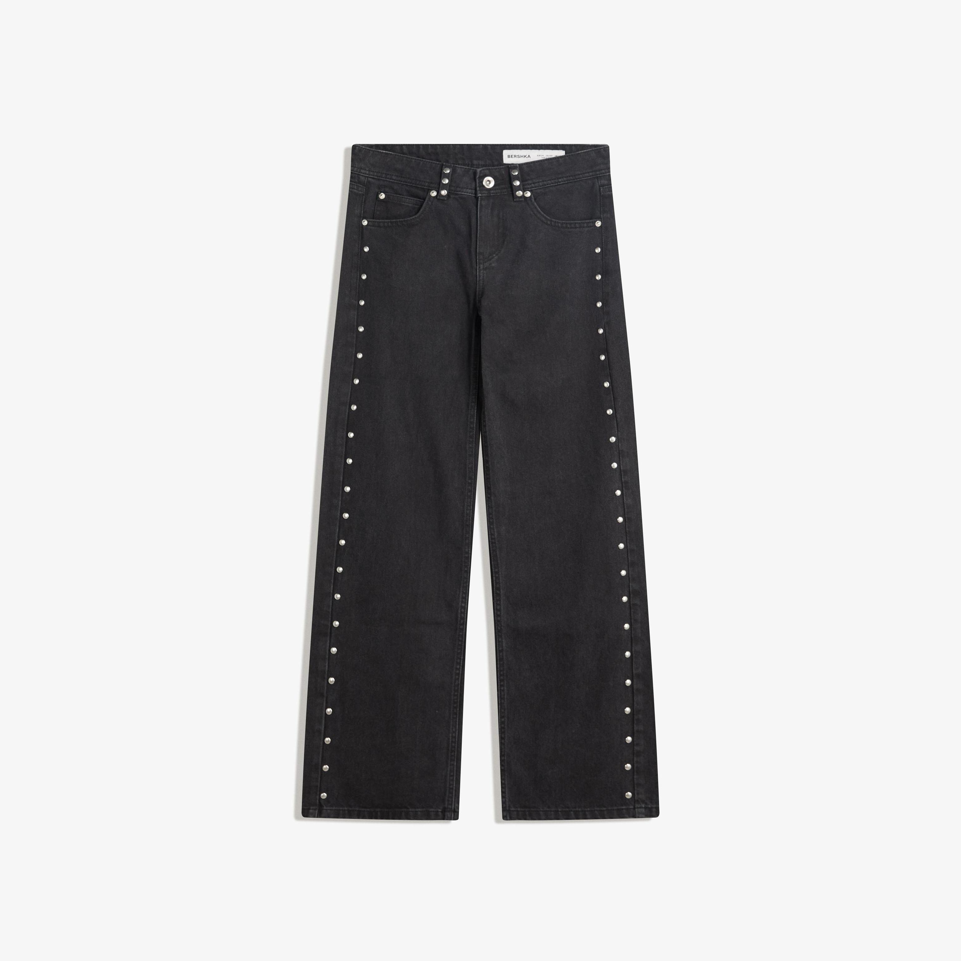 Bershka – جينز Baggy بتفاصيل نجمات ومسامير للفتيات بلون أسود