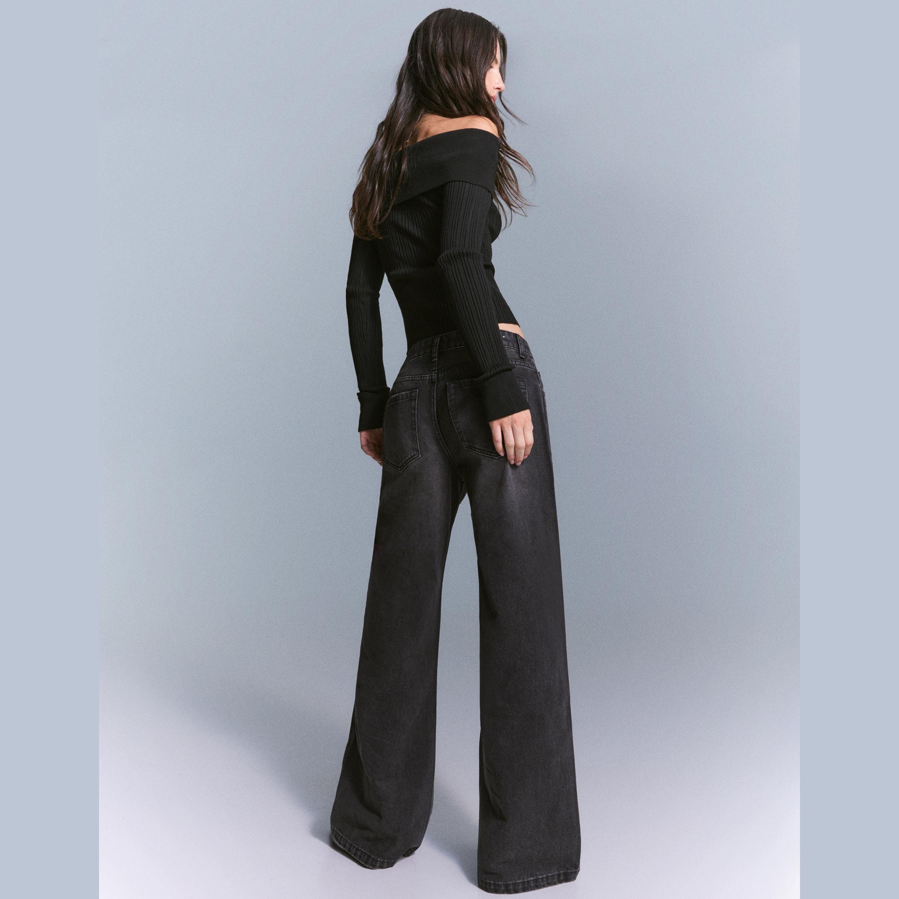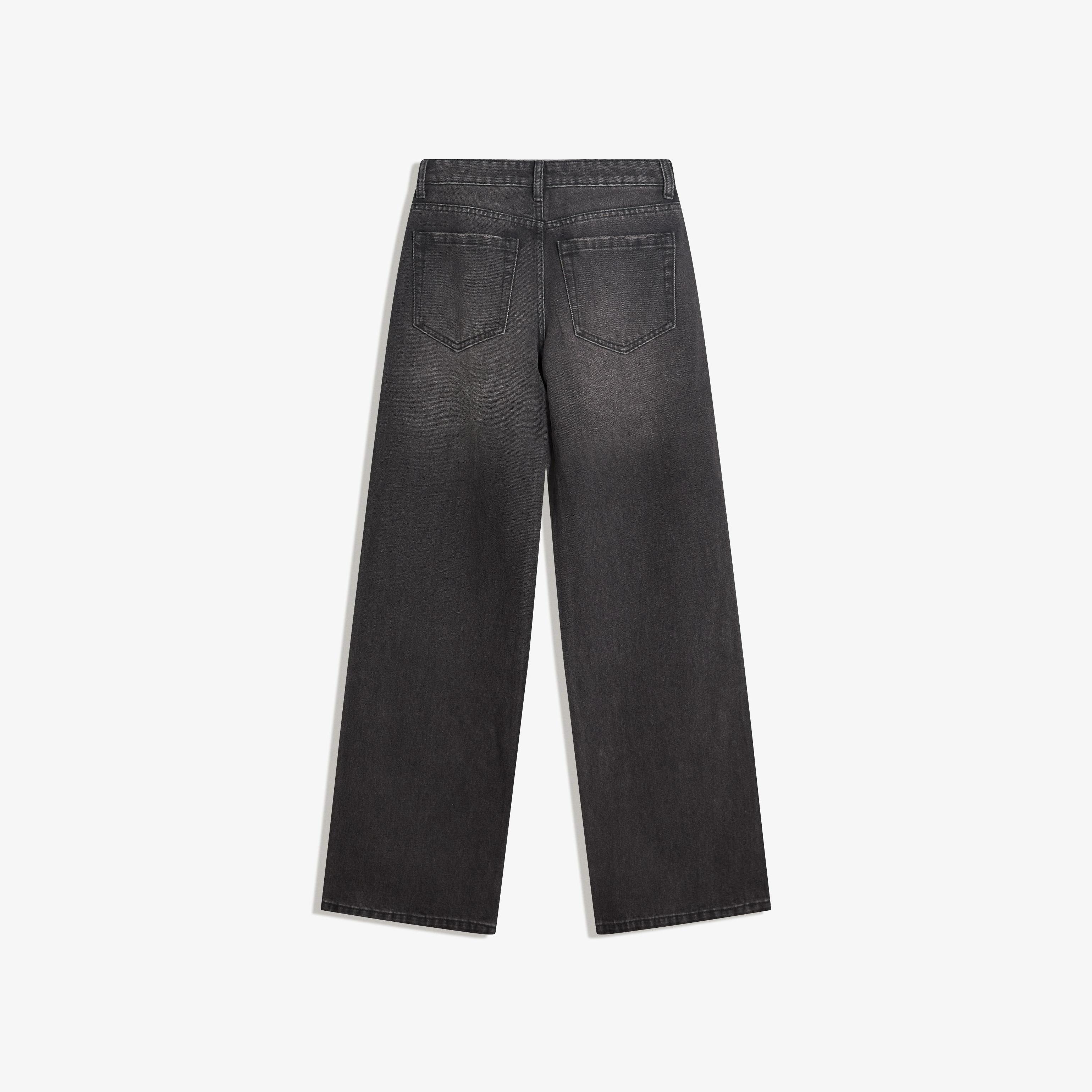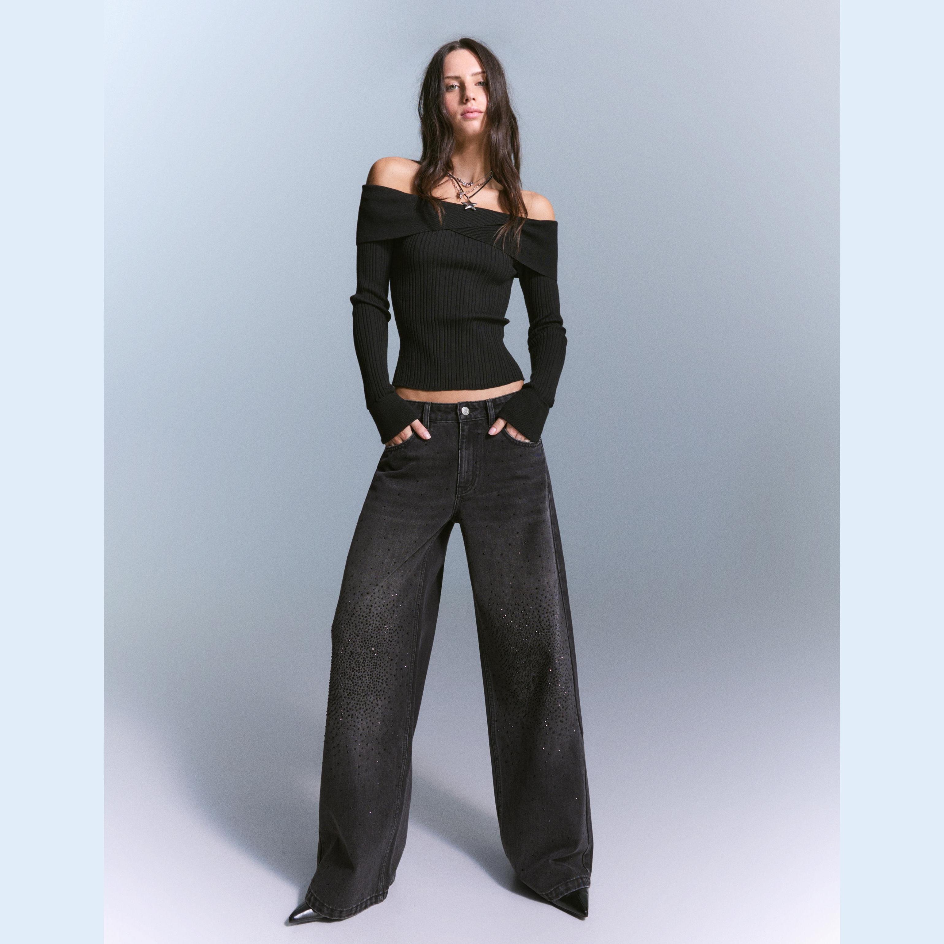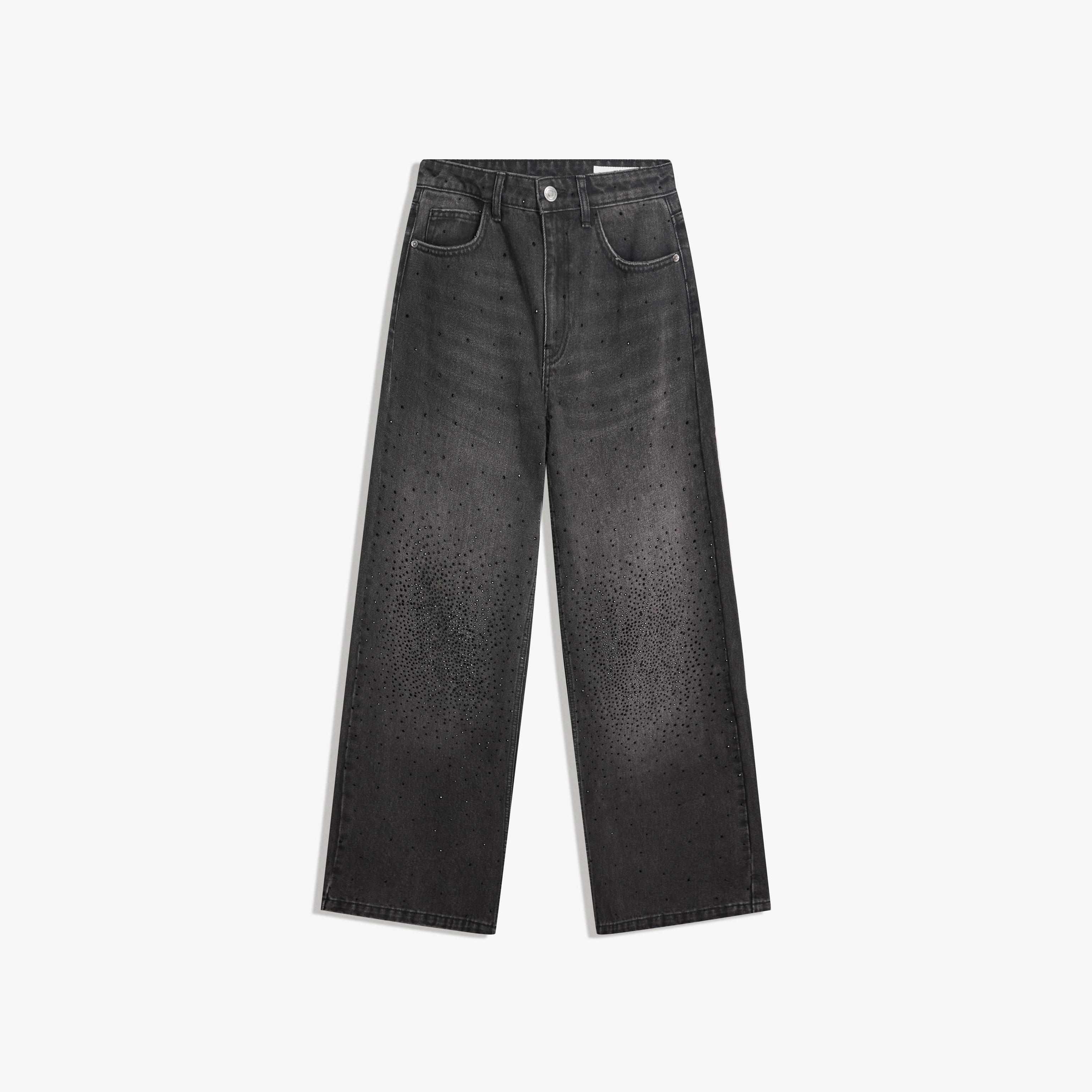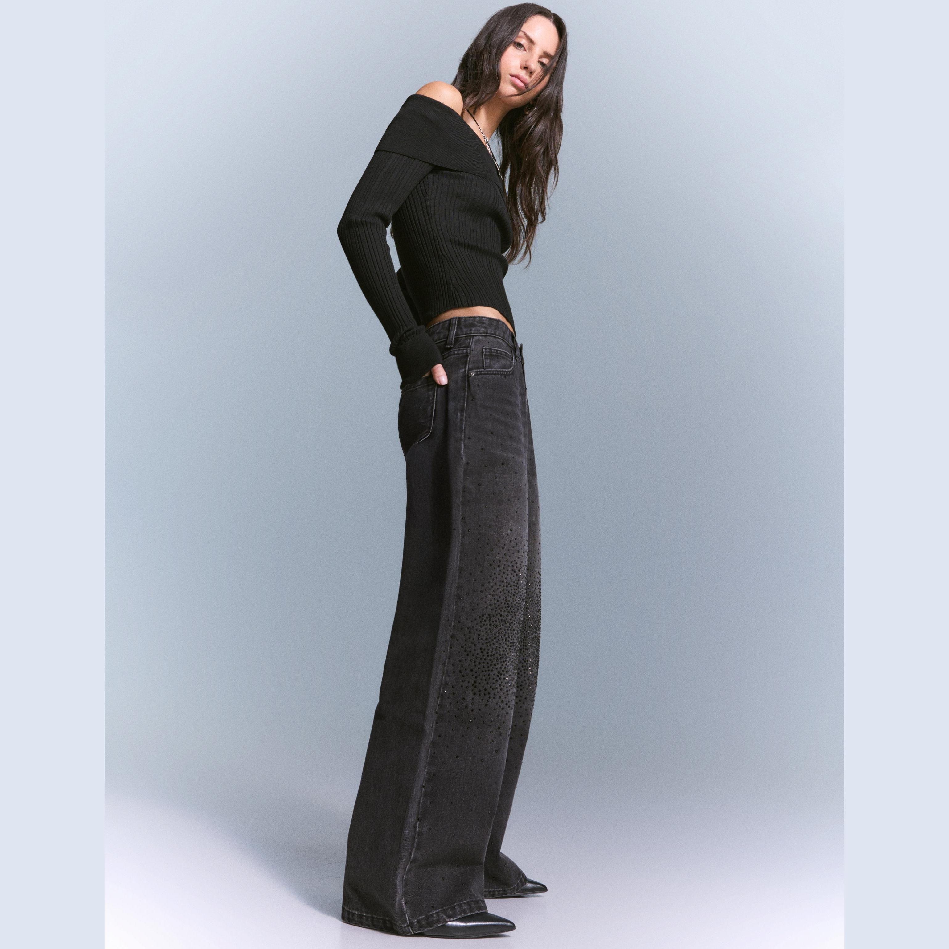 Bershka – جينز مستقيم بتفاصيل أحجار لامعة للفتيات بلون أسود
