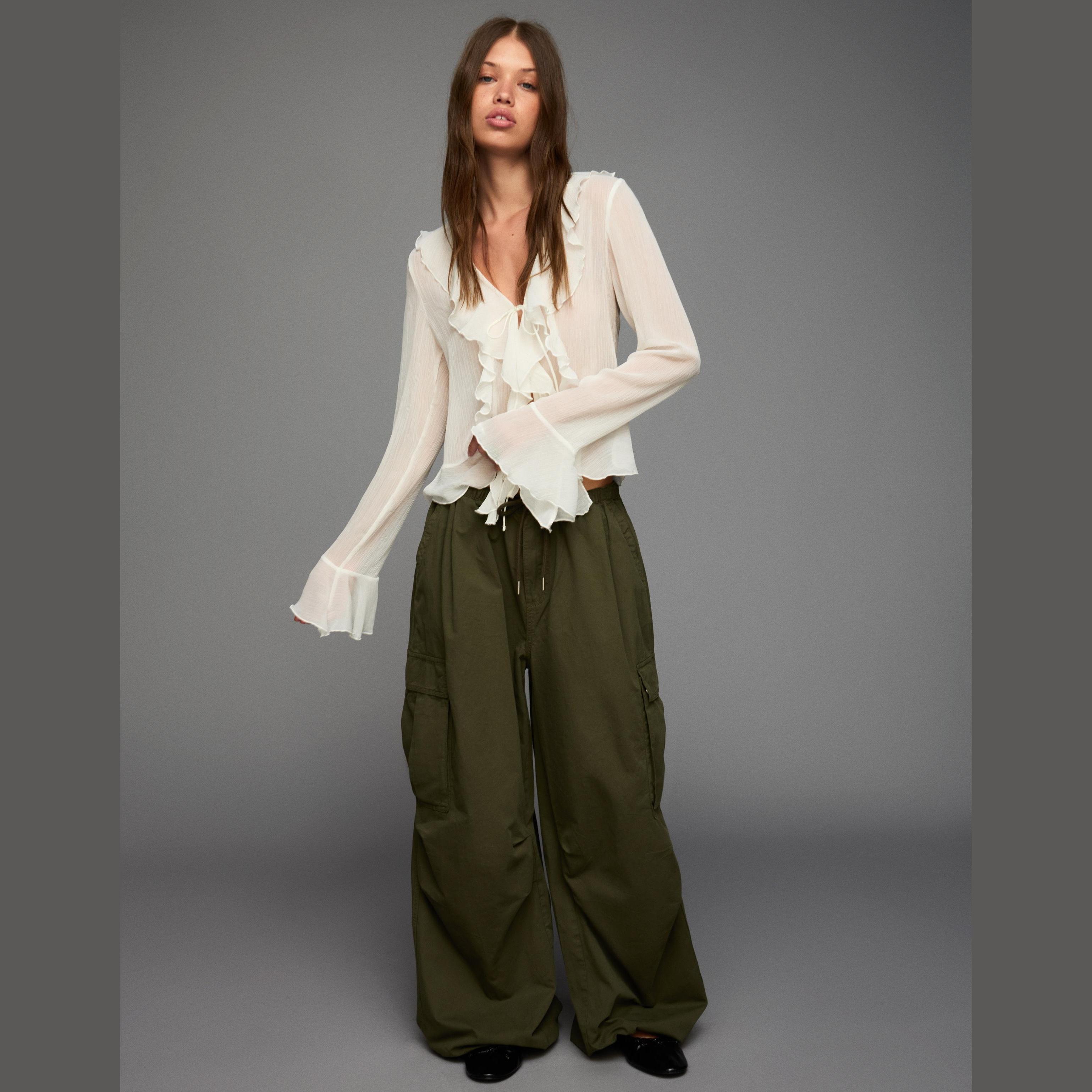 تميّزي بإطلالة عملية وعصرية مع بنطلون Parachute Cargo بلونه الكاكي من Bershka. تصميمه الفضفاض مع الجيوب الجانبية يمنحك مظهرًا مستوحى من أزياء الشارع، مثالي للتنسيقات اليومية أو الإطلالات الكاجوال الجريئة.