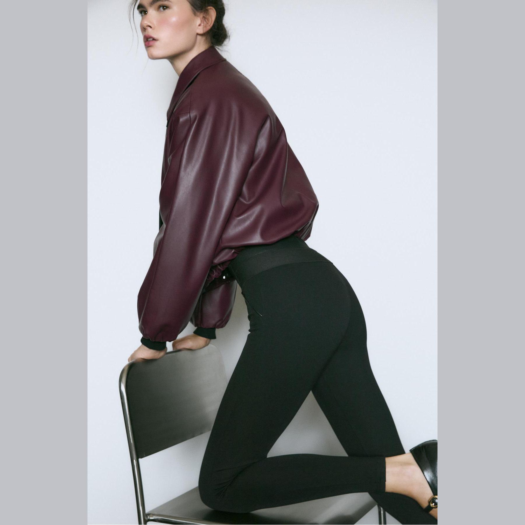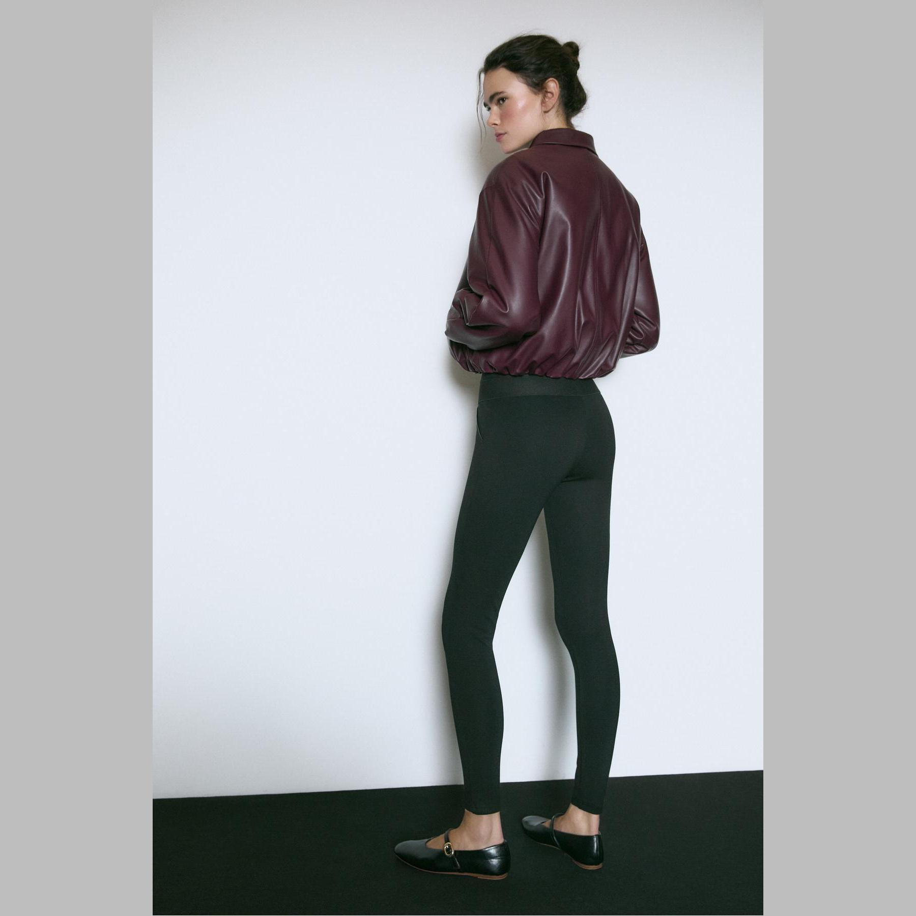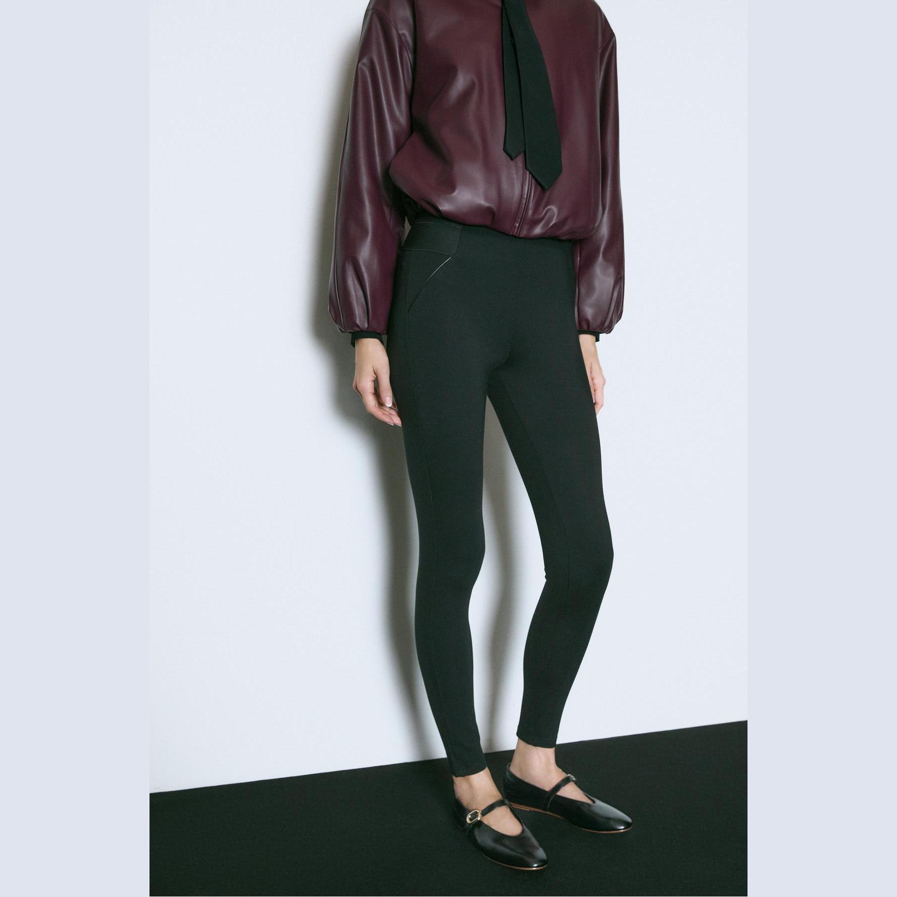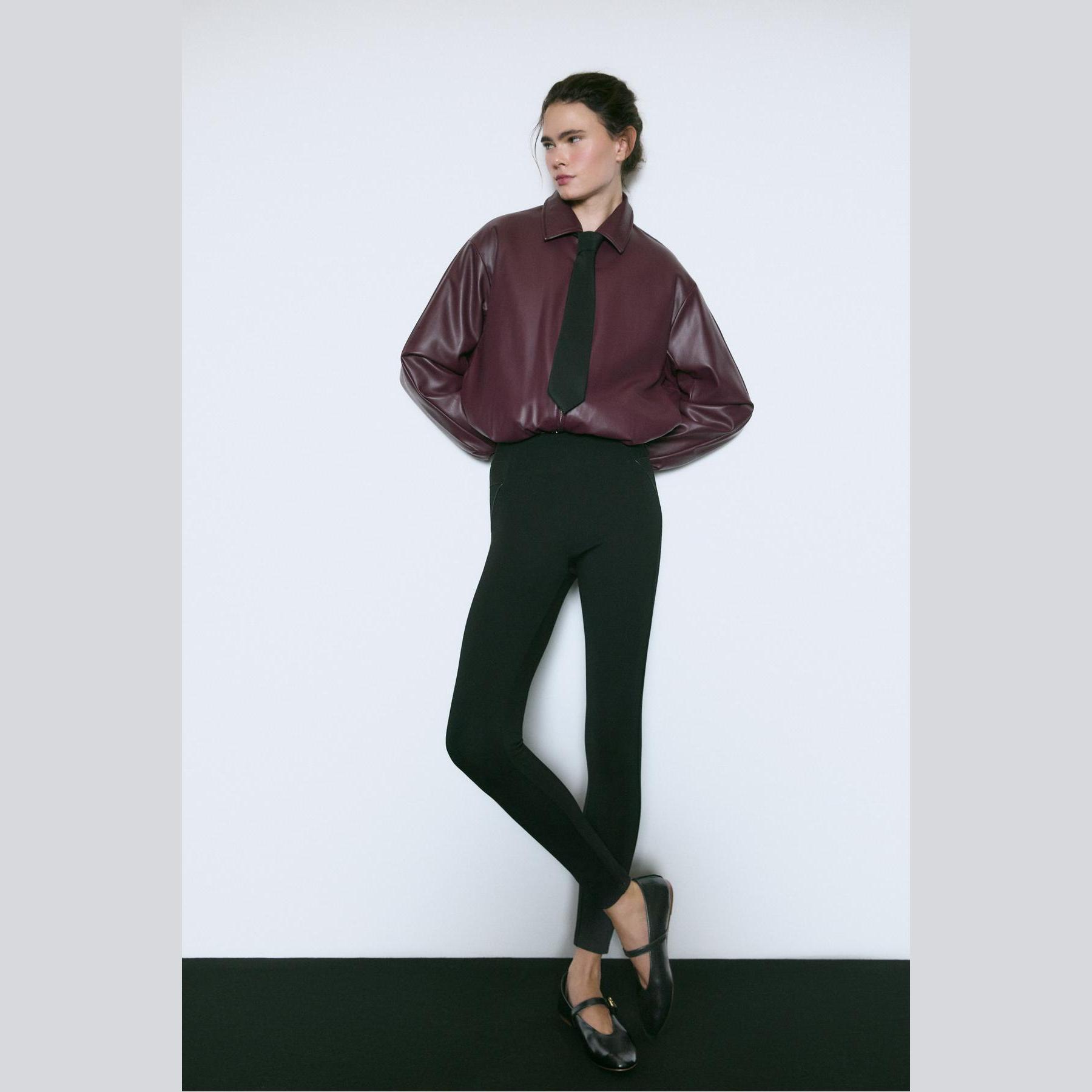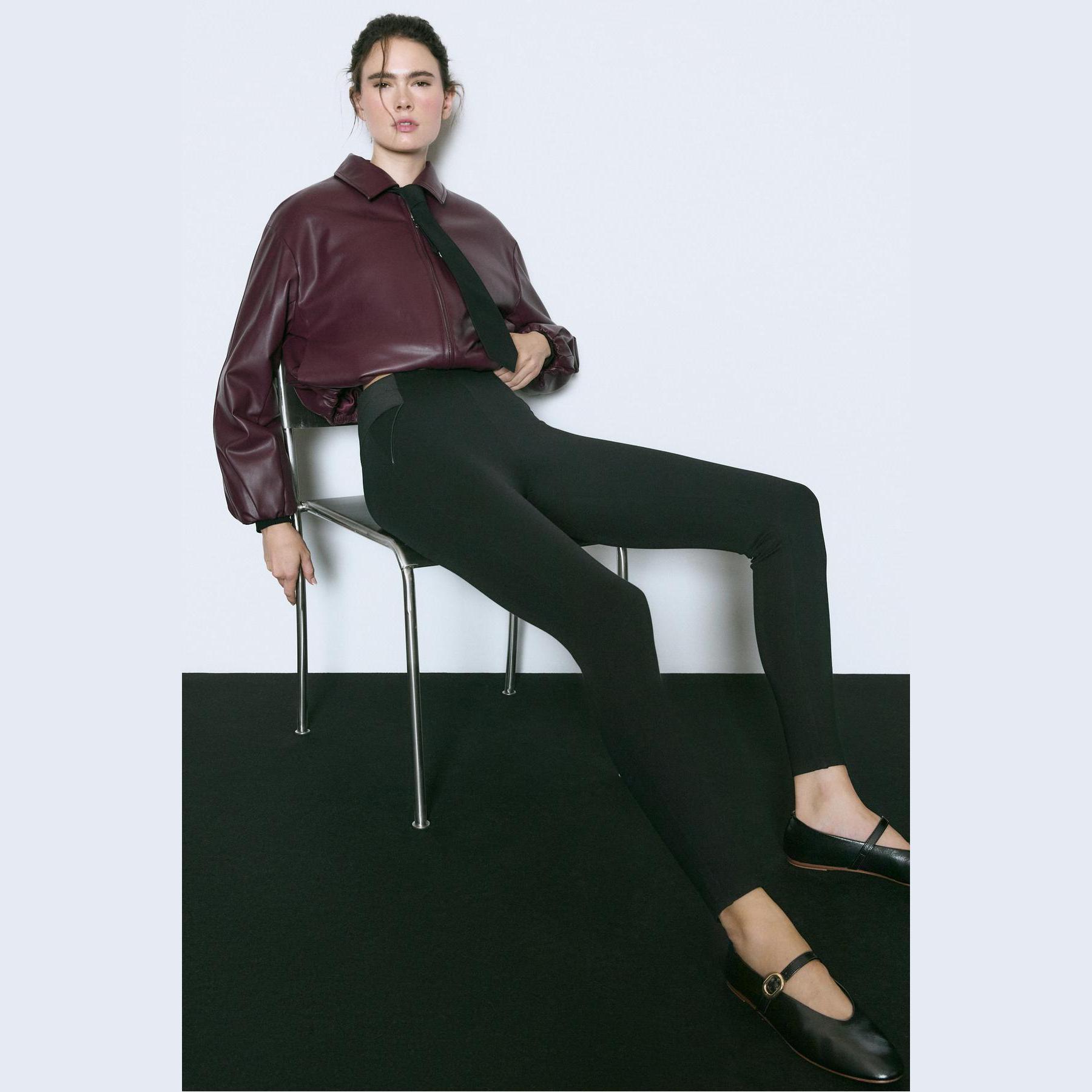 بنطال ليغينغ من Stradivarius مصنوع من خامة فسكوز مرنة، بتصميم ضيق وبطول الكاحل، مزود بحزام مطاطي مدمج بلون متناسق وتفاصيل أمامية تضيف لمسة أنيقة، مثالي للإطلالات اليومية أو الكاجوال.