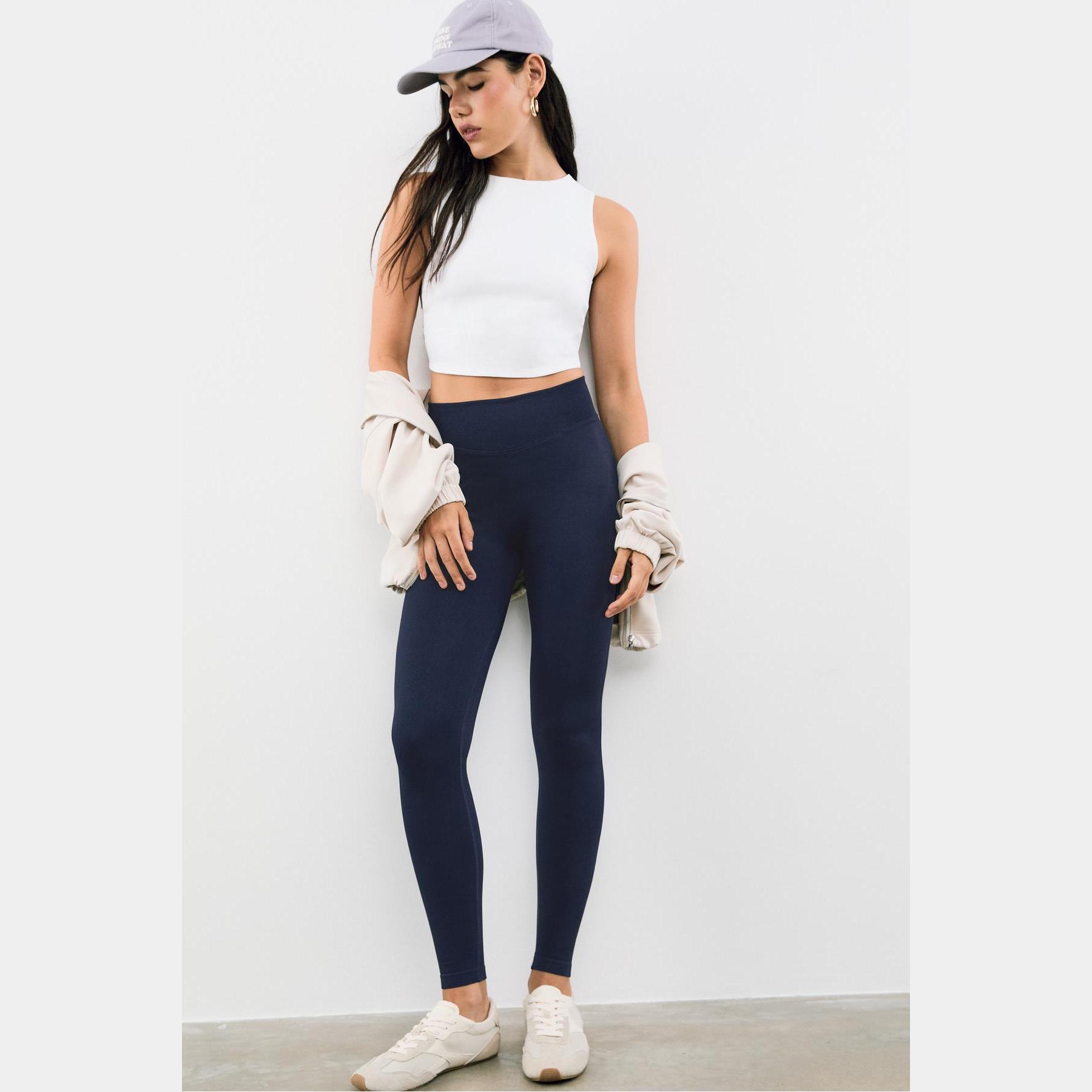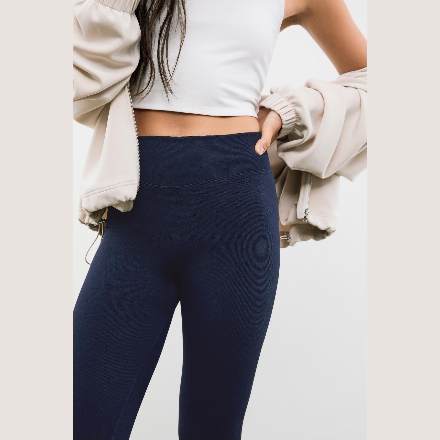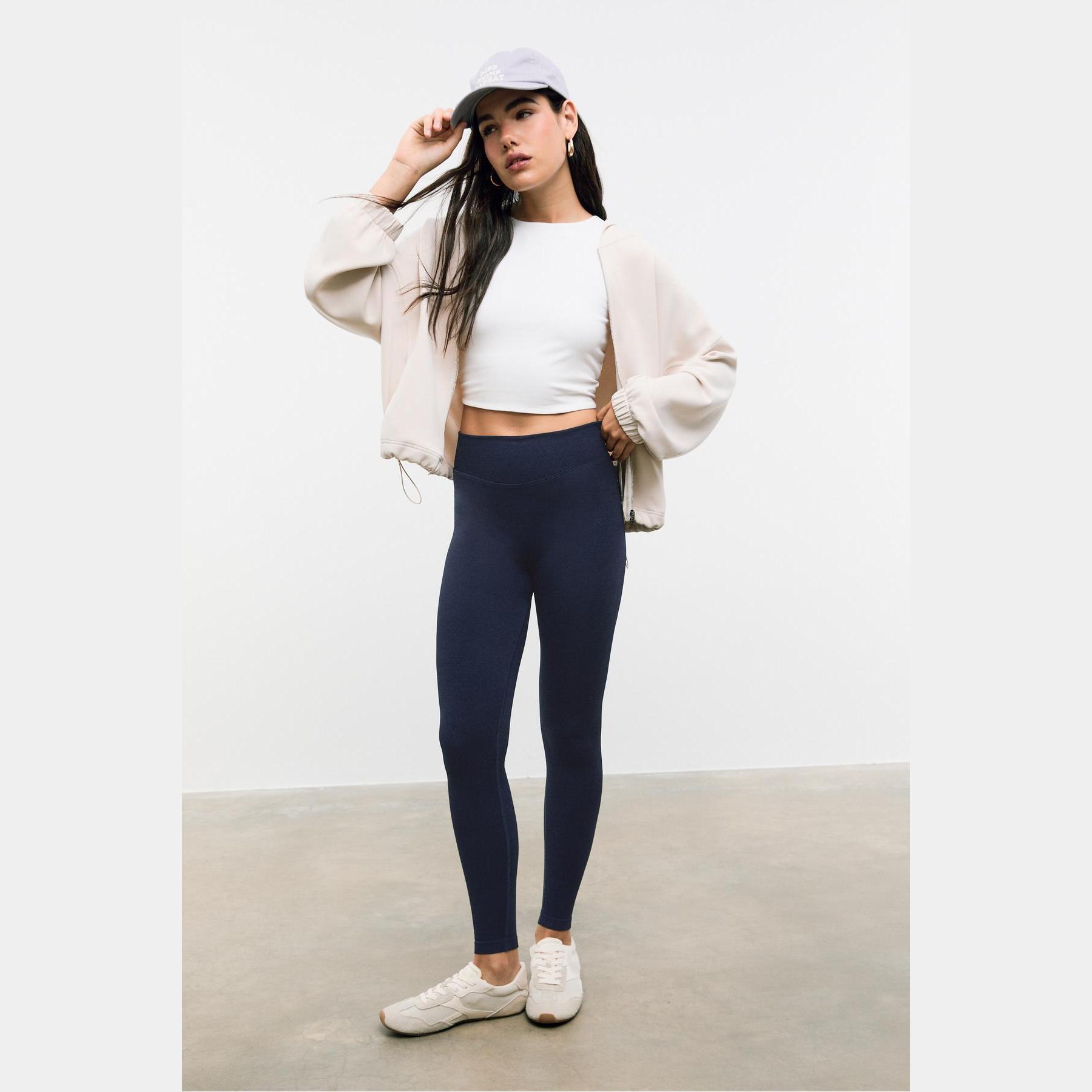 بنطال ليغينغ عالي الخصر بقماش ناعم وشكل محدد – كحلي من Stradivarius