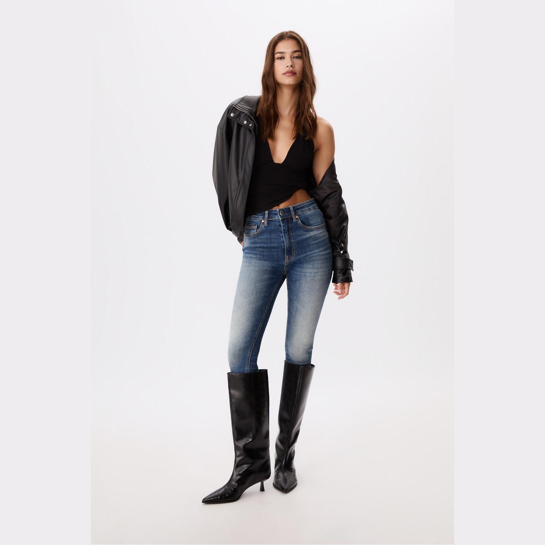 بنطال جينز أنيق من Stradivarius بلون أزرق كلاسيكي، مصنوع من خامة دينم مطاطية بتركيبة غنية بالقطن والبوليستر، يتميز بقصة ضيقة (Super Skinny Fit) وخصر فائق الارتفاع، مزود بإغلاق أمامي بسحاب وزر معدني، 5 جيوب عملية، وأطراف ضيقة عند الكاحل، مثالي للتنسيق مع توبات قصيرة أو جاكيتات لإطلالة كاجوال مريحة وعصرية.