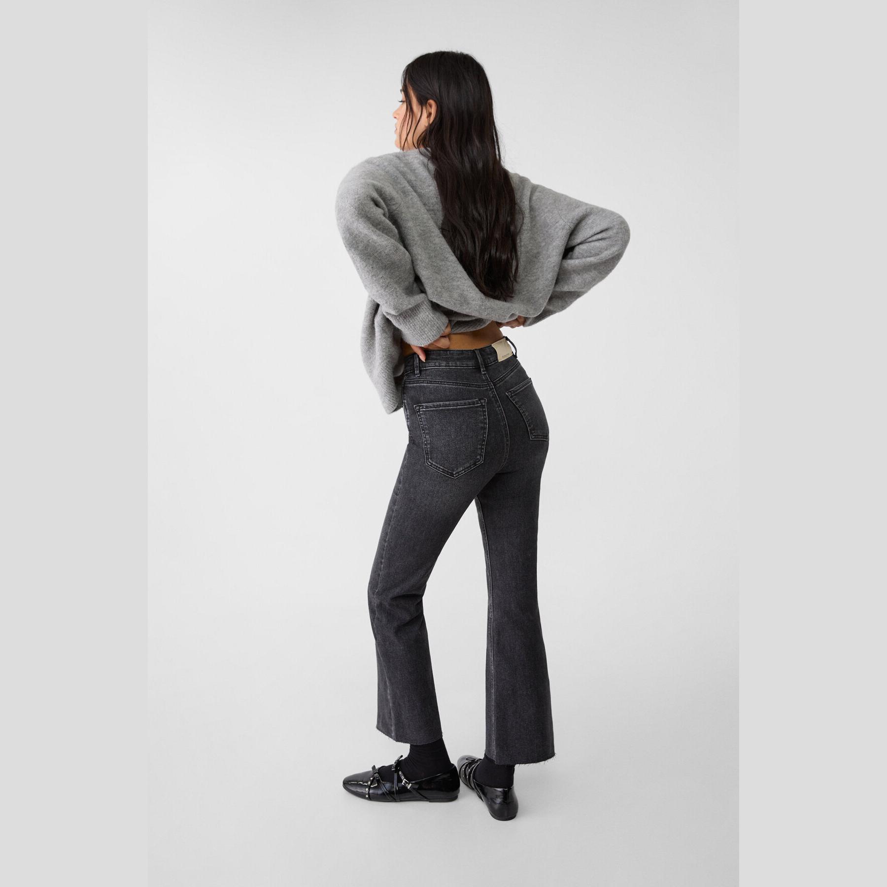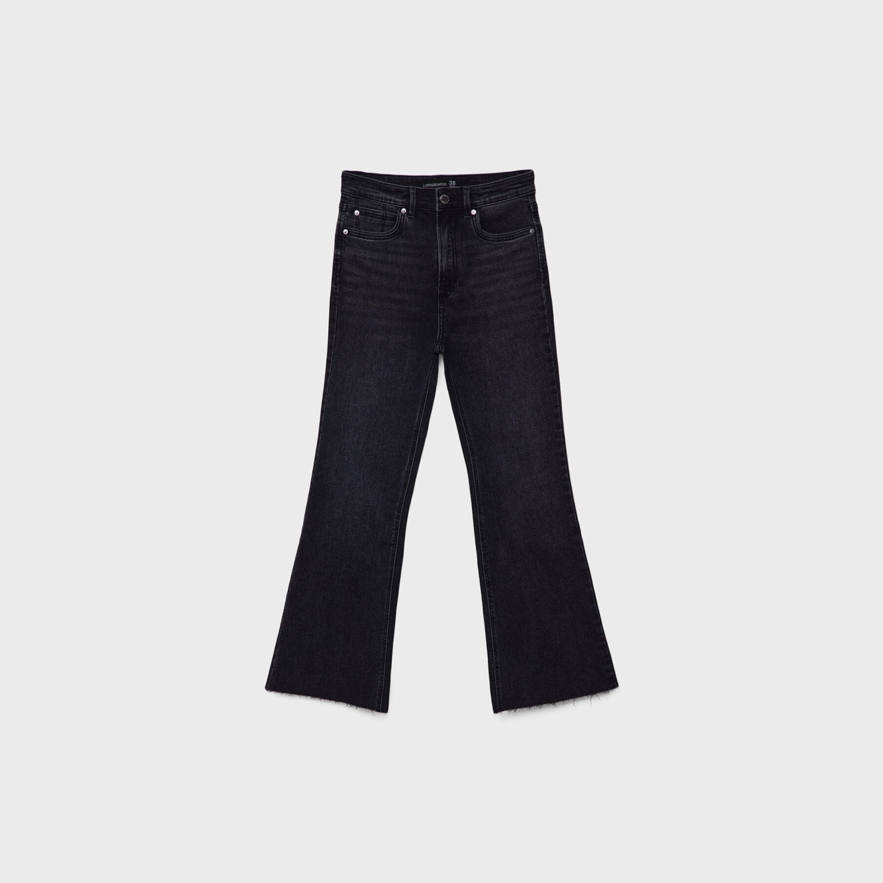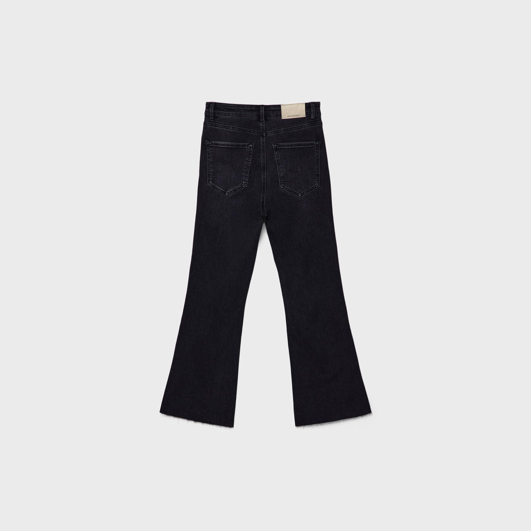 بنطال جينز أنيق من Stradivarius بلون أسود، مصنوع من خامة دينم قطنية بتركيبة مرنة، يتميز بقصة واسعة من الأسفل (Wide Leg) وقصة قصيرة عند الكاحل (Crop)، بخصر عالي يمنحك ثباتًا وأناقة، مزود بإغلاق أمامي بسحاب وزر معدني، 5 جيوب عملية، بدون حزام، مثالي للتنسيق مع توبات قصيرة أو جاكيتات لإطلالة كاجوال مريحة وعصرية.