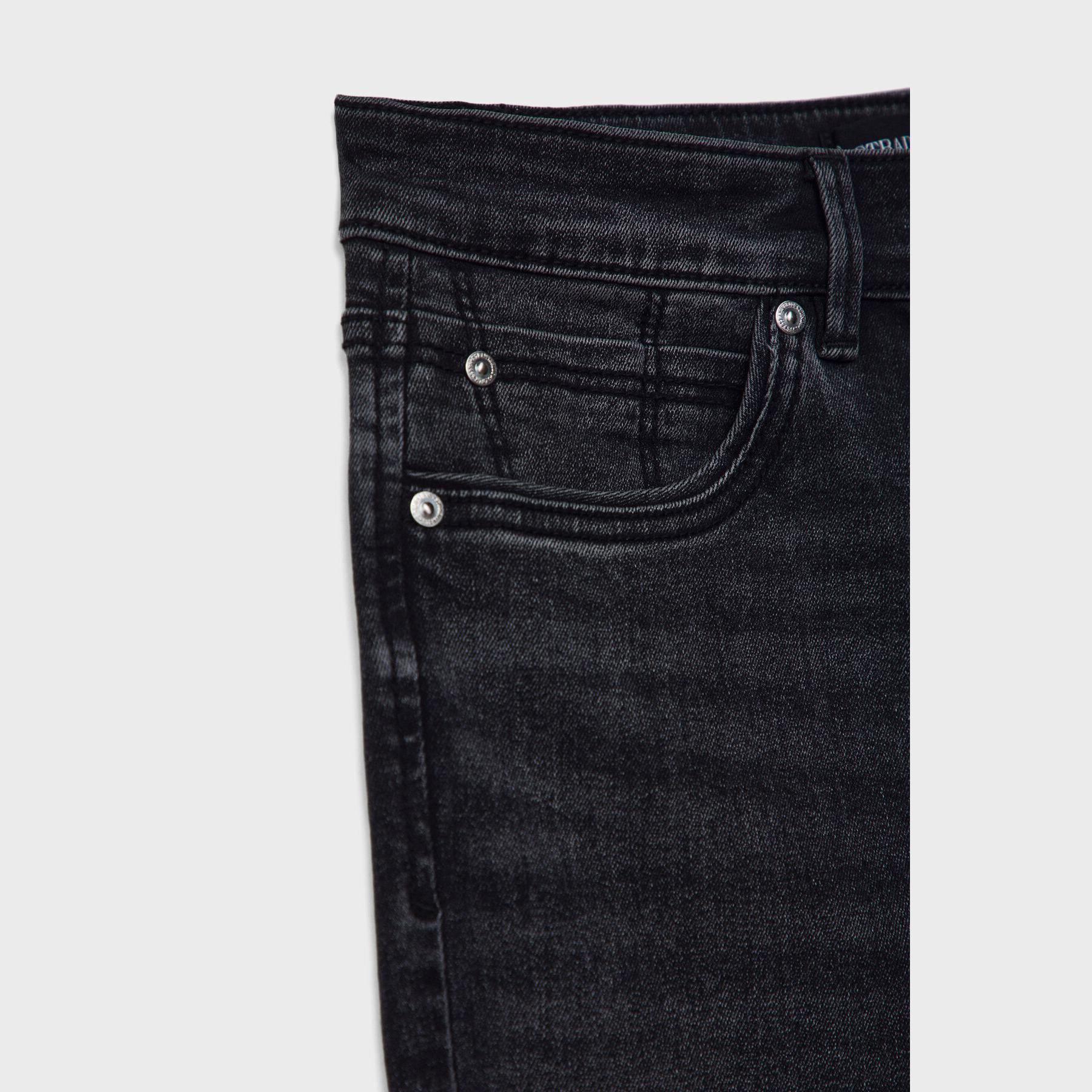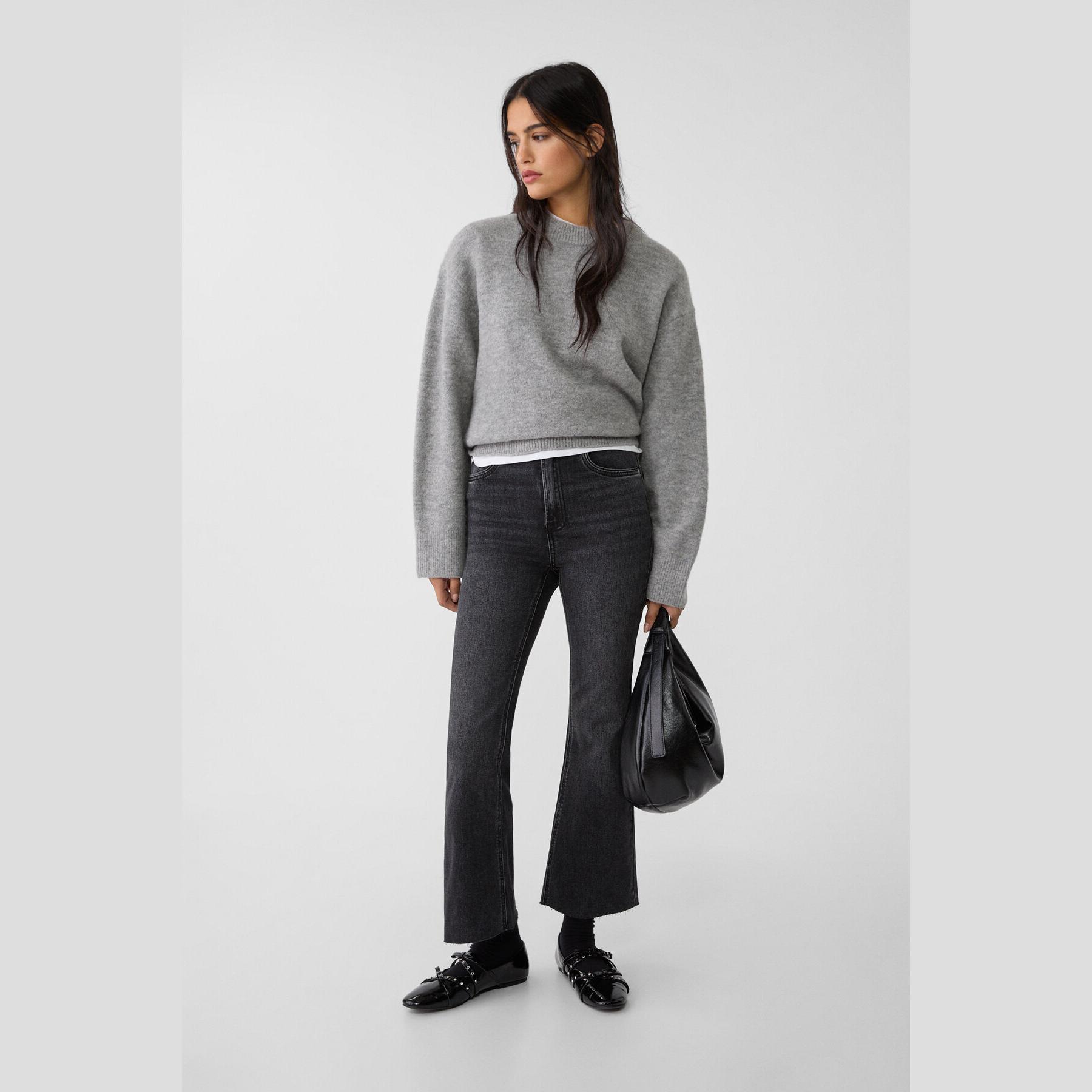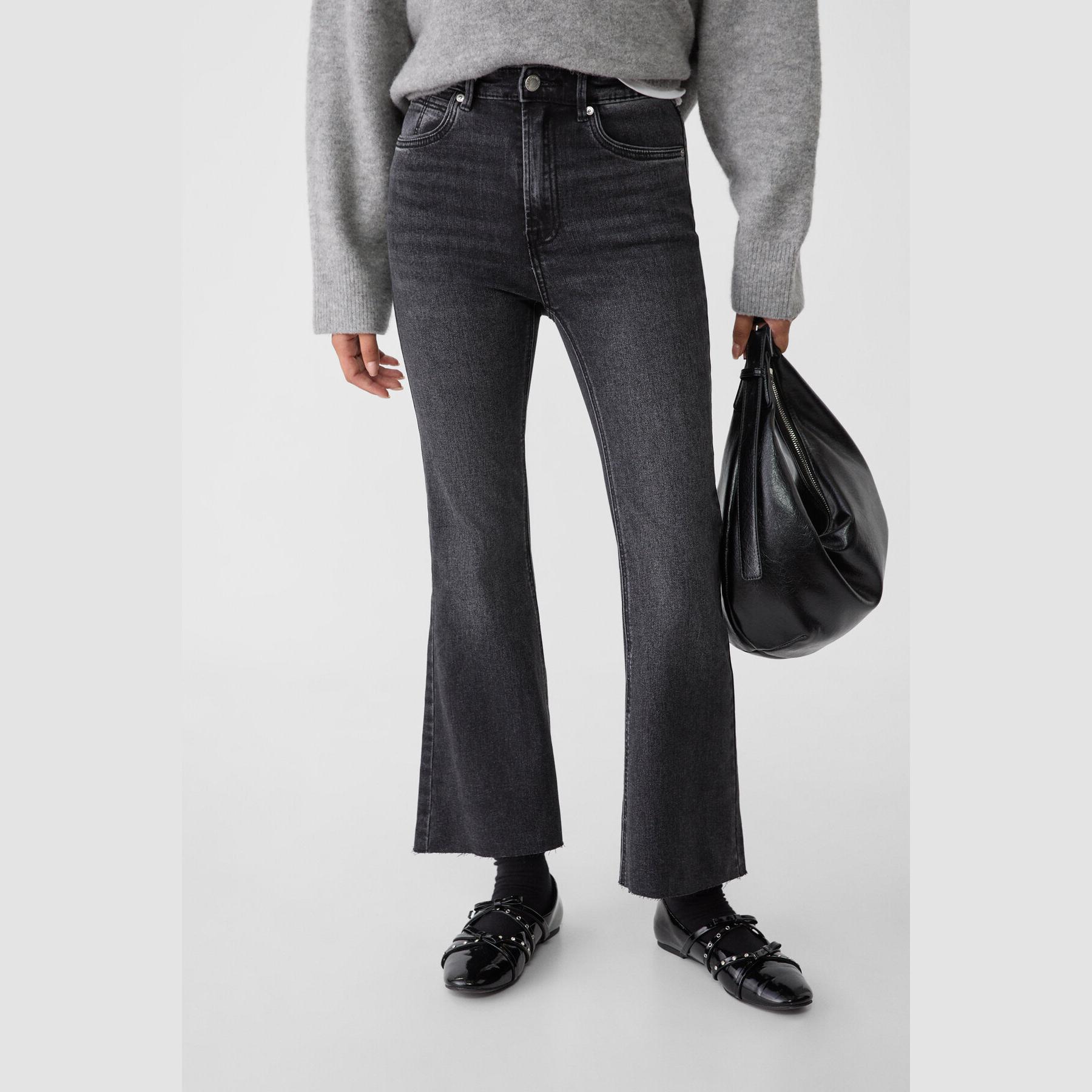 بنطال جينز أنيق من Stradivarius بلون أسود، مصنوع من خامة دينم قطنية بتركيبة مرنة، يتميز بقصة واسعة من الأسفل (Wide Leg) وقصة قصيرة عند الكاحل (Crop)، بخصر عالي يمنحك ثباتًا وأناقة، مزود بإغلاق أمامي بسحاب وزر معدني، 5 جيوب عملية، بدون حزام، مثالي للتنسيق مع توبات قصيرة أو جاكيتات لإطلالة كاجوال مريحة وعصرية.
