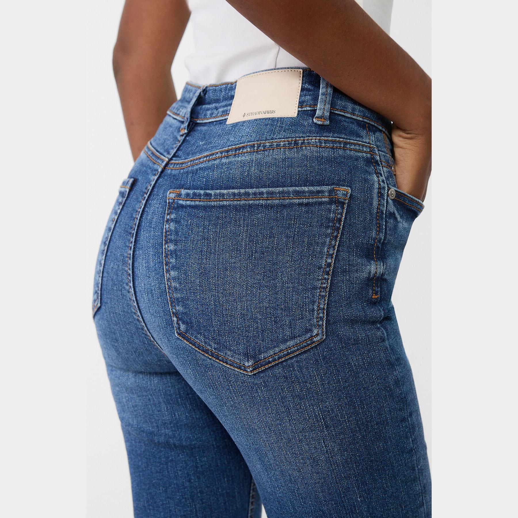 بنطال جينز أنيق من Stradivarius بلون أزرق دنيم، مصنوع من خامة قطنية مرنة بتركيبة عالية الجودة، يتميز بقصة Crop قصيرة عند الكاحل وقصة إسبانيول واسعة من الأسفل، بخصر عالي يمنحك ثباتًا وأناقة، مزود بإغلاق أمامي بسحاب وزر، وجيوب جانبية مزدوجة، مثالي للتنسيق مع توبات قصيرة أو جاكيتات لإطلالة كاجوال مريحة وعصرية.