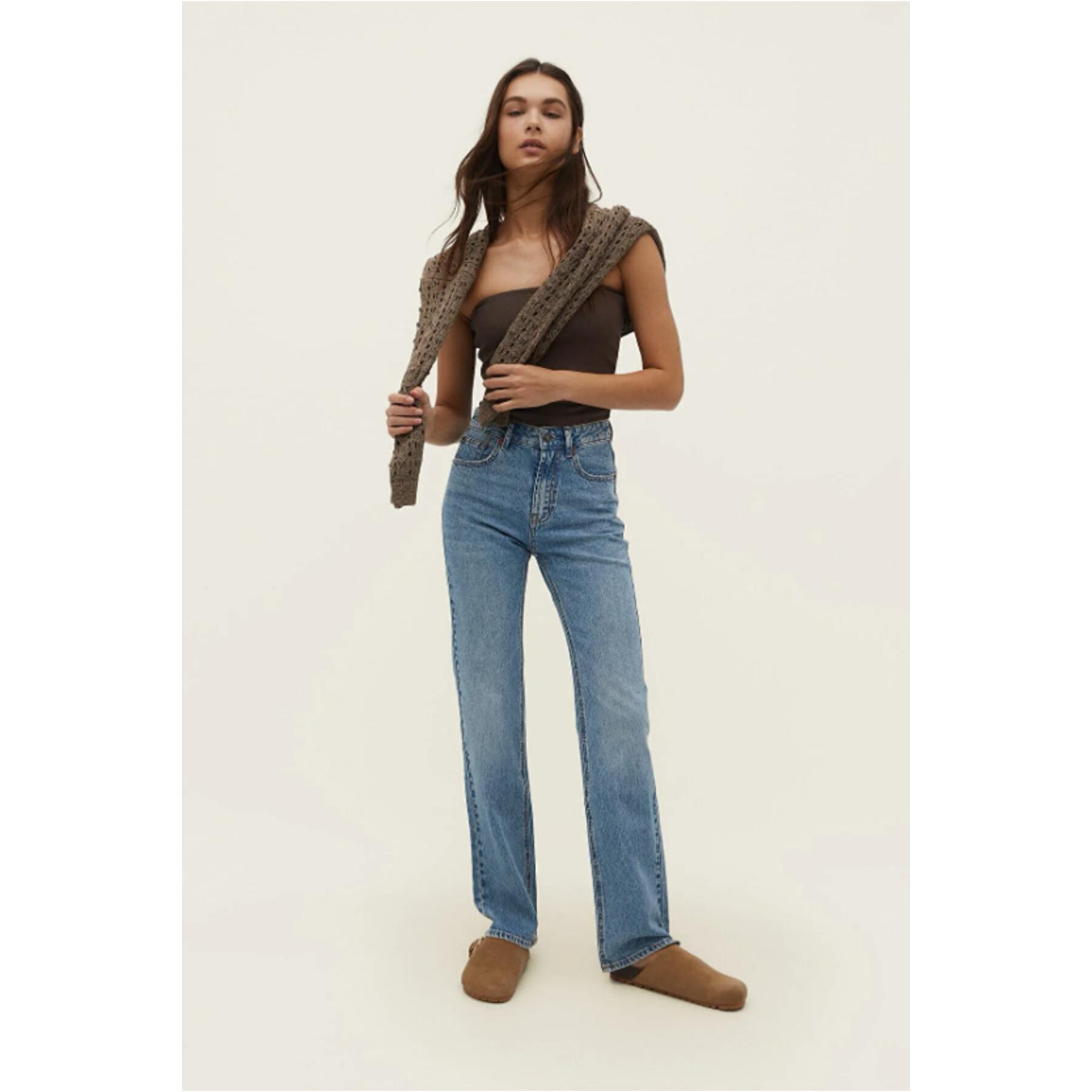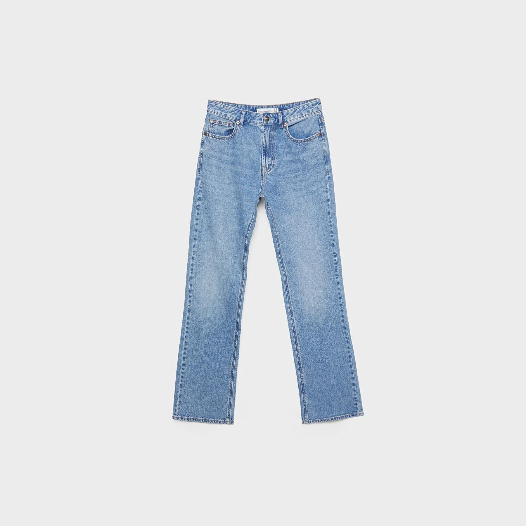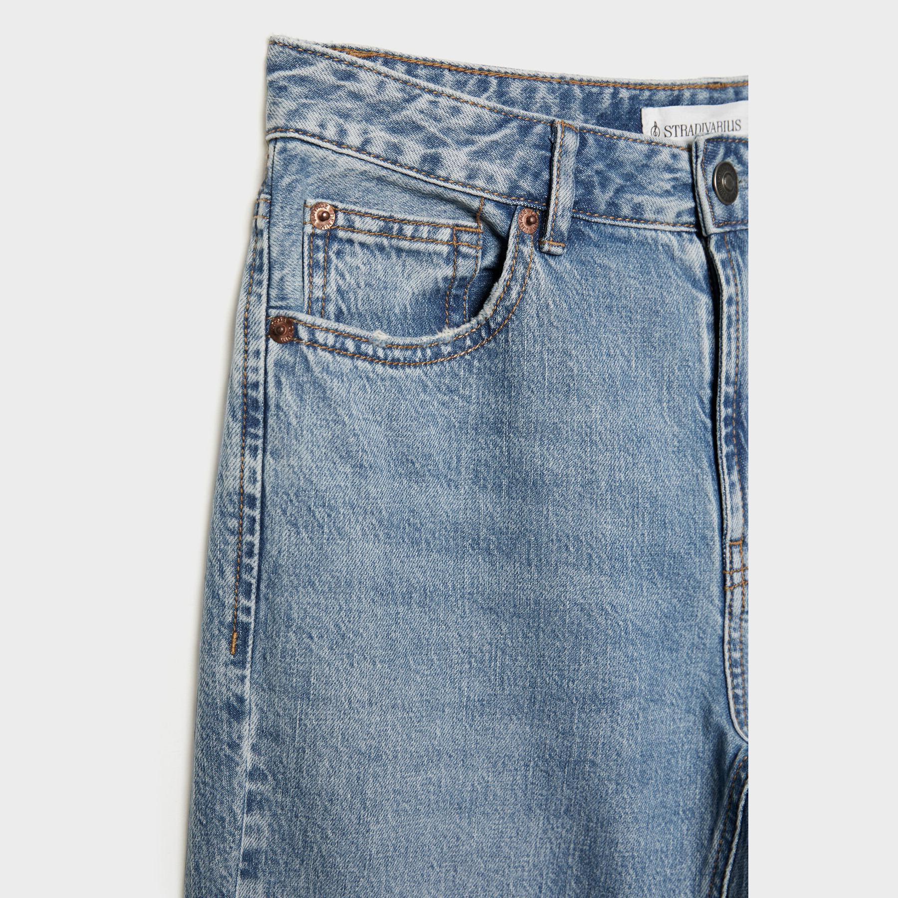 بنطال جينز أنيق من Stradivarius بلون أزرق دنيم، مصنوع من خامة قطنية مرنة بلمسة Vintage، يتميز بقصة مستقيمة (Straight Fit) وخصر متوسط الارتفاع، مزود بإغلاق أمامي بسحاب وزر معدني، تصميم بخمسة جيوب عملية، بدون حزام، مثالي للتنسيق مع توبات قصيرة أو جاكيتات لإطلالة كاجوال مريحة وعصرية.