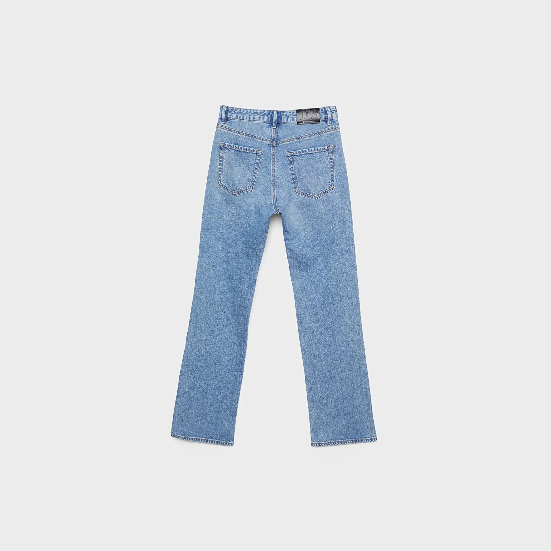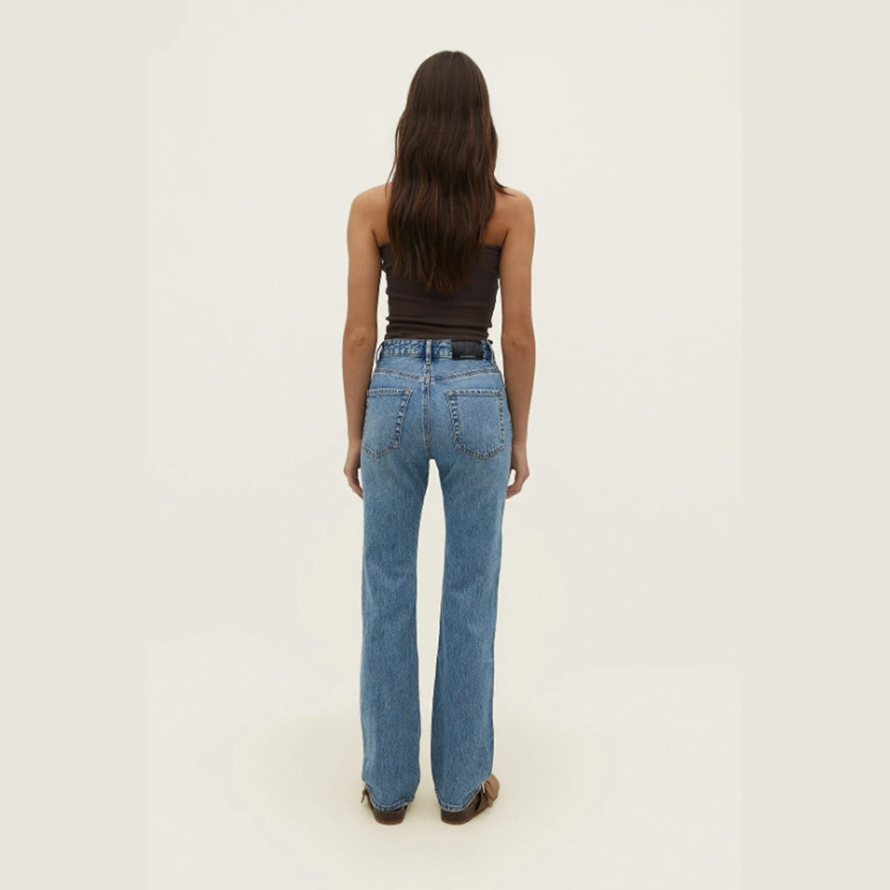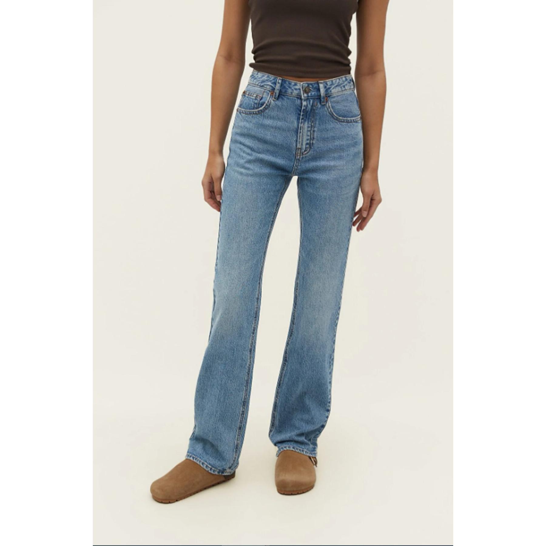 بنطال جينز أنيق من Stradivarius بلون أزرق دنيم، مصنوع من خامة قطنية مرنة بلمسة Vintage، يتميز بقصة مستقيمة (Straight Fit) وخصر متوسط الارتفاع، مزود بإغلاق أمامي بسحاب وزر معدني، تصميم بخمسة جيوب عملية، بدون حزام، مثالي للتنسيق مع توبات قصيرة أو جاكيتات لإطلالة كاجوال مريحة وعصرية.