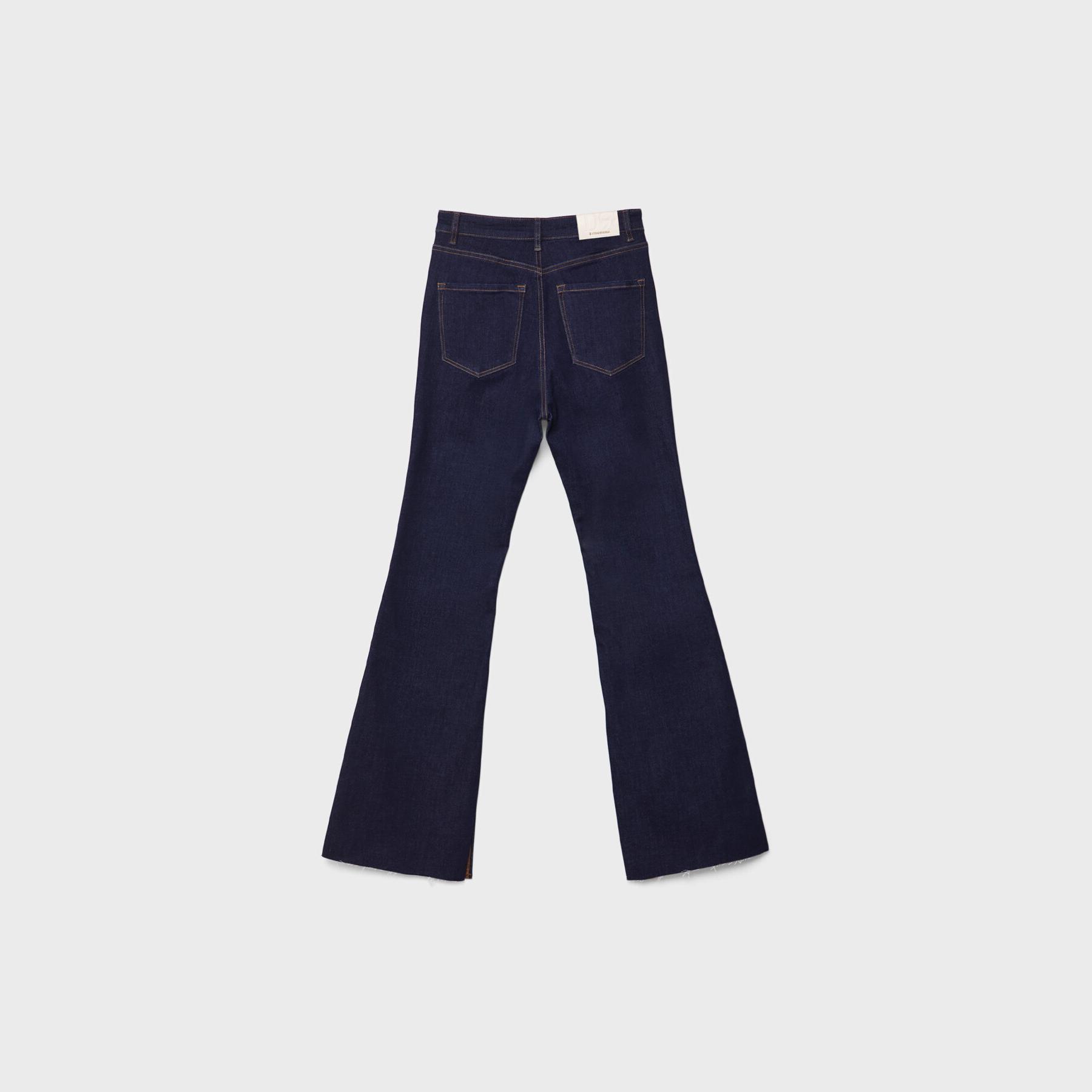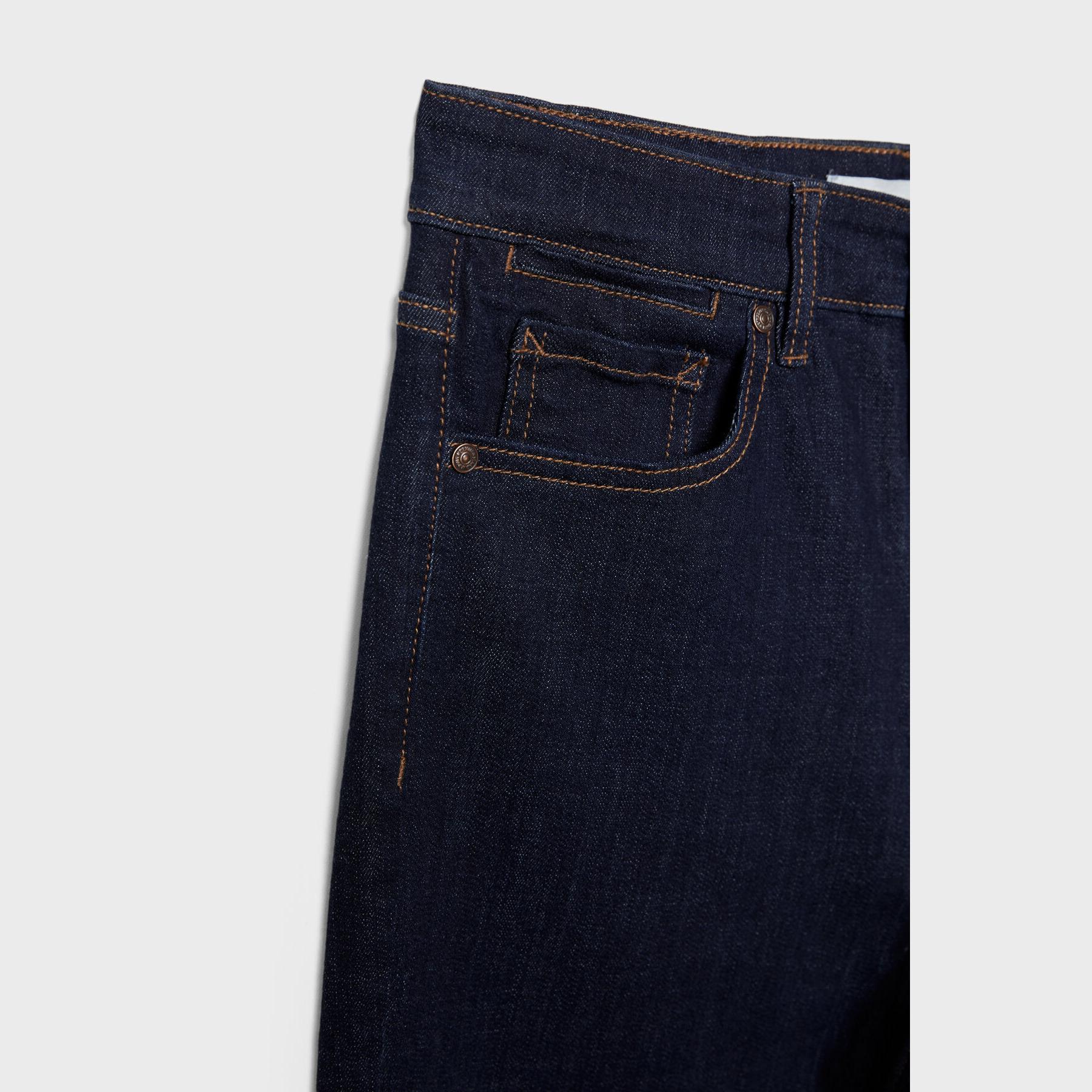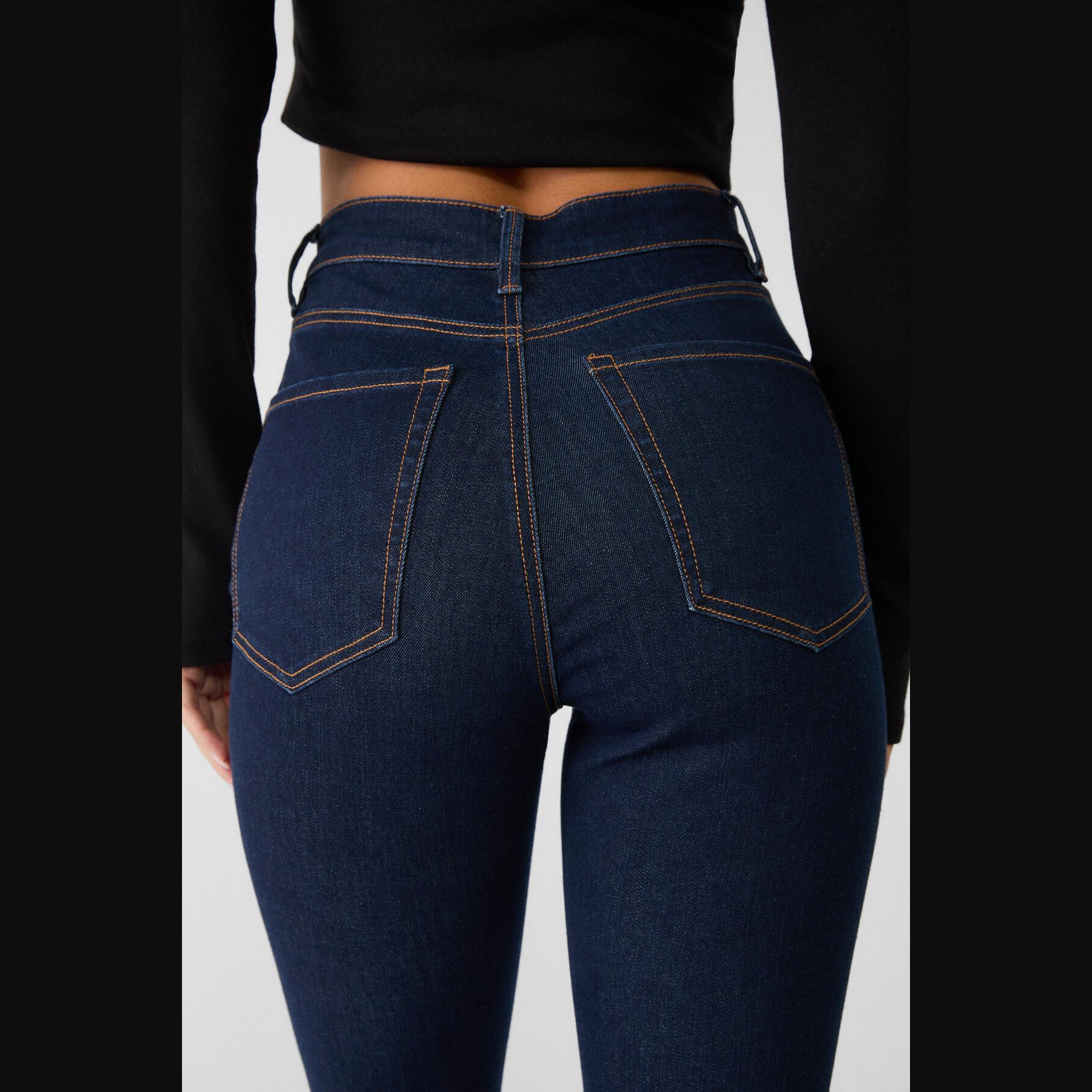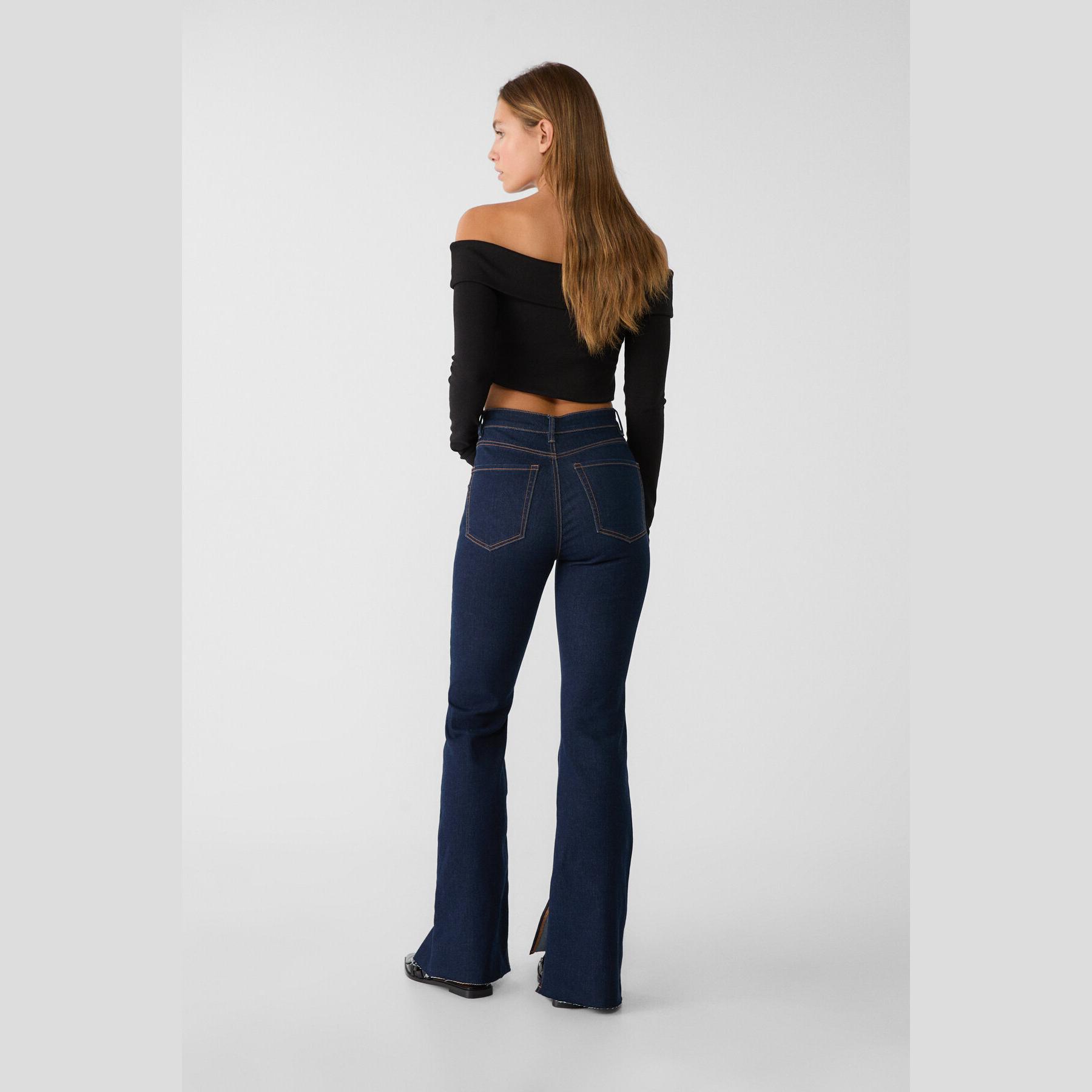 بنطال جينز أنيق من Stradivarius بلون أزرق دنيم، مصنوع من خامة قطنية مرنة بتركيبة عالية الجودة، يتميز بقصة Slim Fit تلتف حول الورك والفخذ وتنسدل بقصة إسبانيول واسعة من الأسفل، بخصر عالي يغطي منطقة السرة، مزود بإغلاق أمامي بسحاب وزر معدني، تصميم بخمسة جيوب عملية، بدون حزام، مثالي للتنسيق مع توبات قصيرة أو جاكيتات لإطلالة كاجوال مريحة وعصرية.