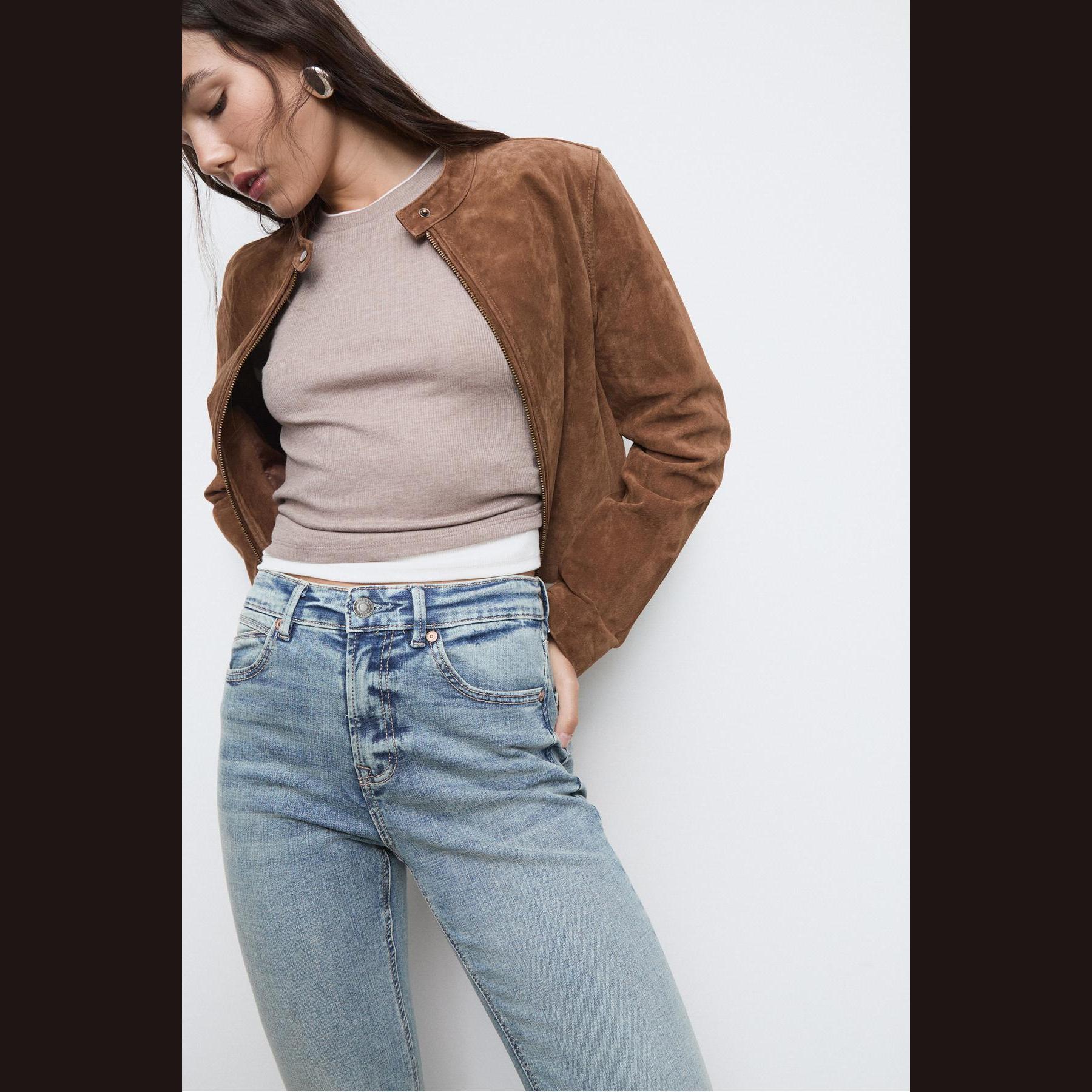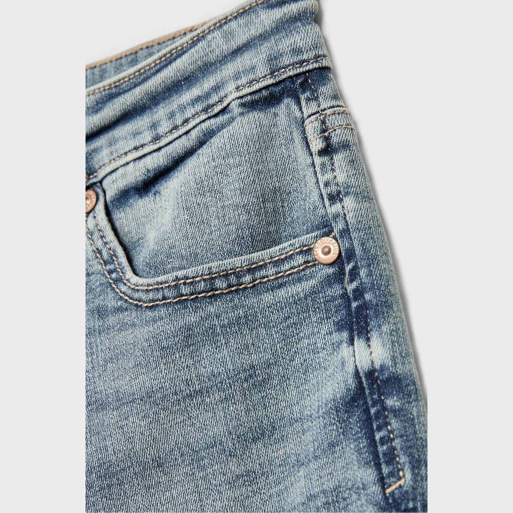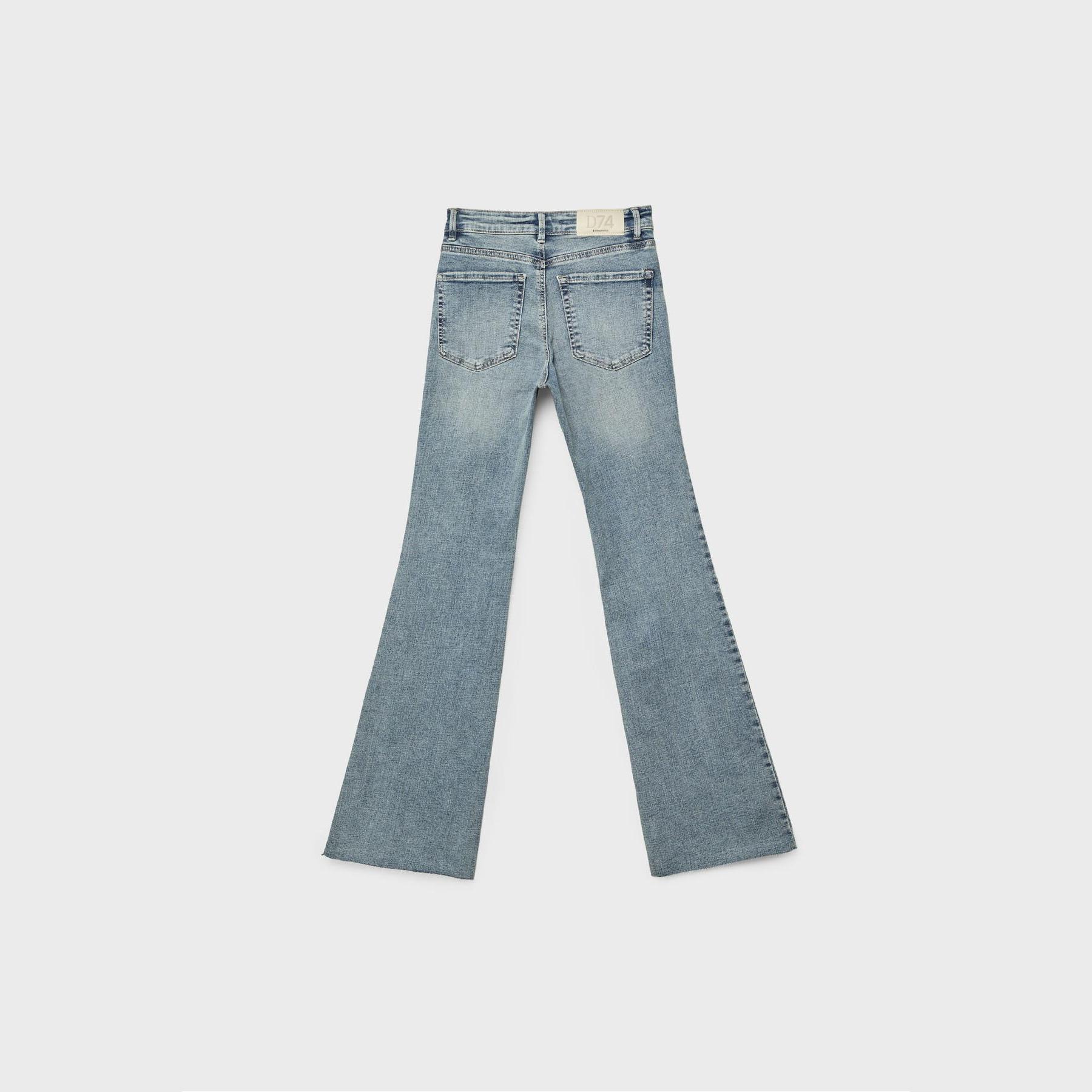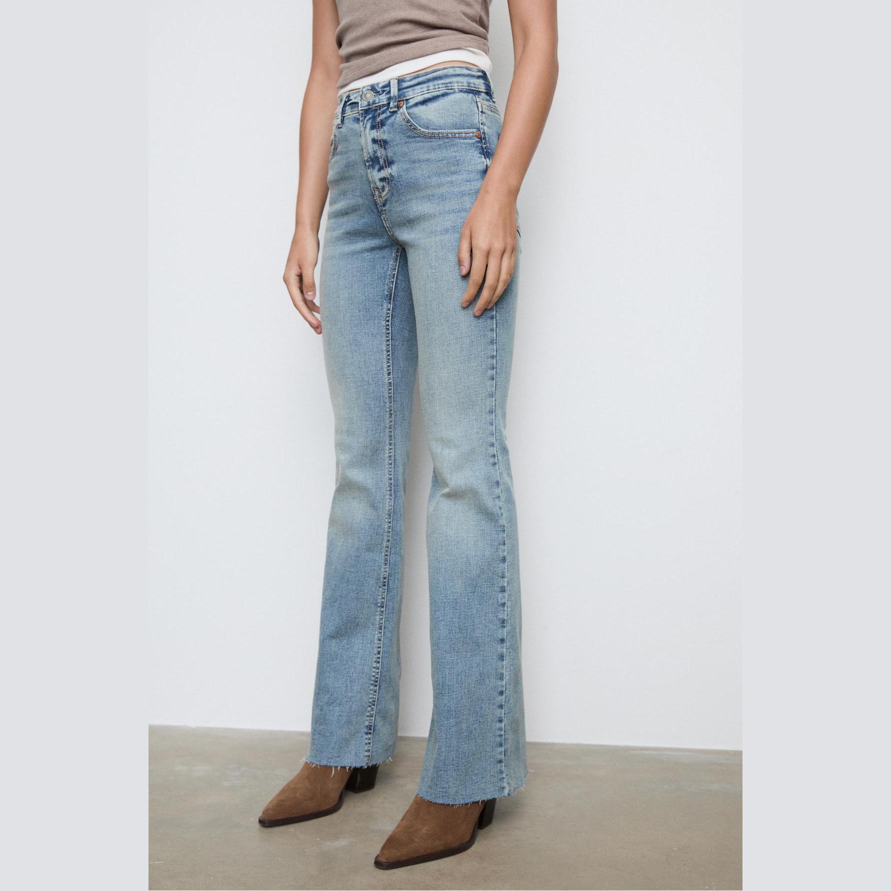 بنطال جينز أنيق من Stradivarius بلون أزرق دنيم، مصنوع من خامة Power Stretch Denim بتركيبة مرنة عالية الجودة، يتميز بقصة Slim Fit تلتف حول الفخذ وتنسدل بقصة إسبانيول واسعة من الأسفل، بخصر عالي يغطي منطقة السرة، مزود بإغلاق أمامي بسحاب وزر معدني، تصميم بخمسة جيوب عملية، بدون حزام، وأطراف داخلية مشقوقة تضيف لمسة عصرية.