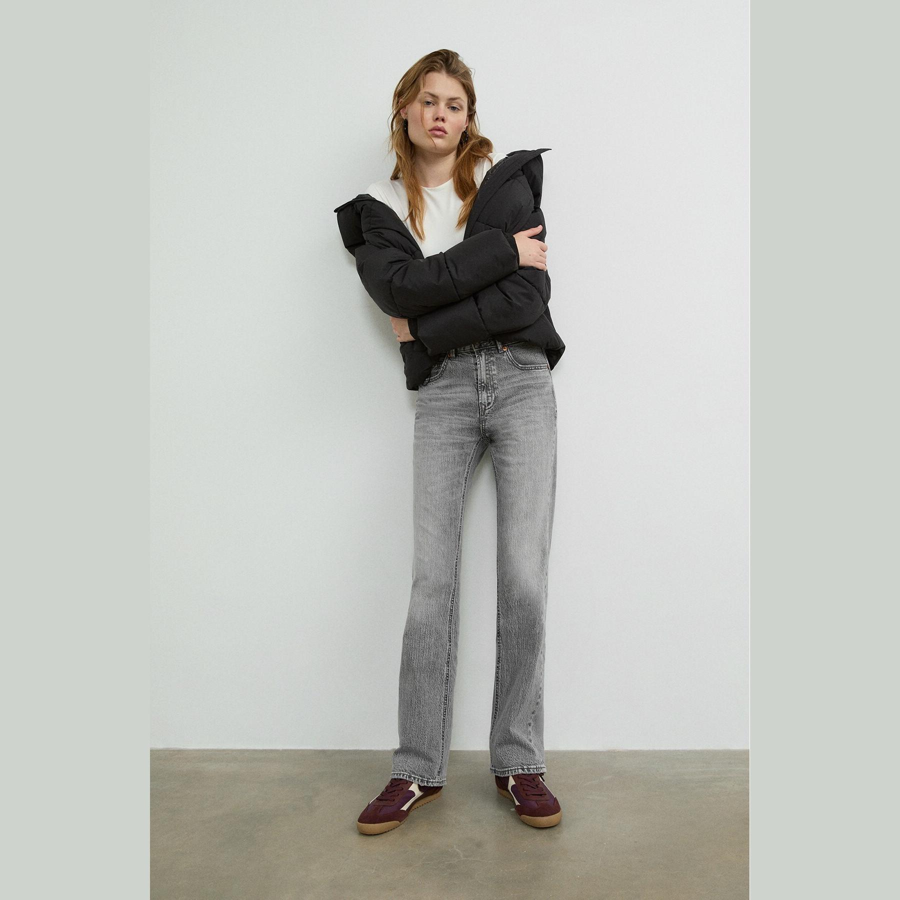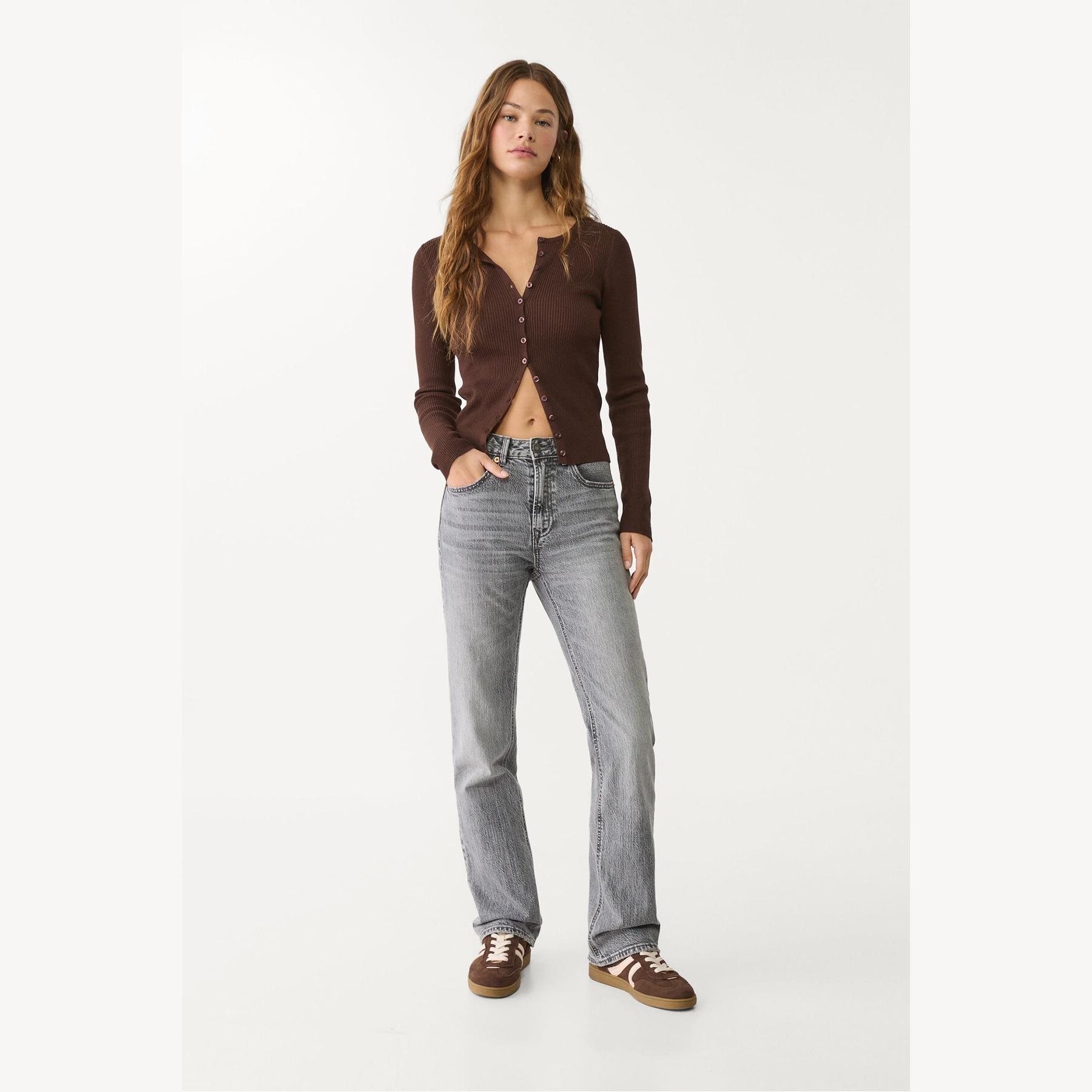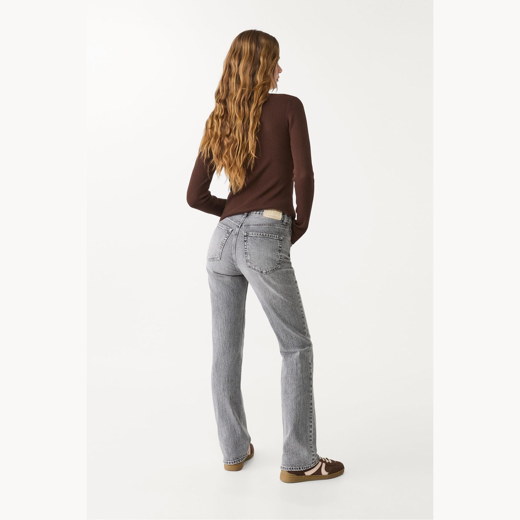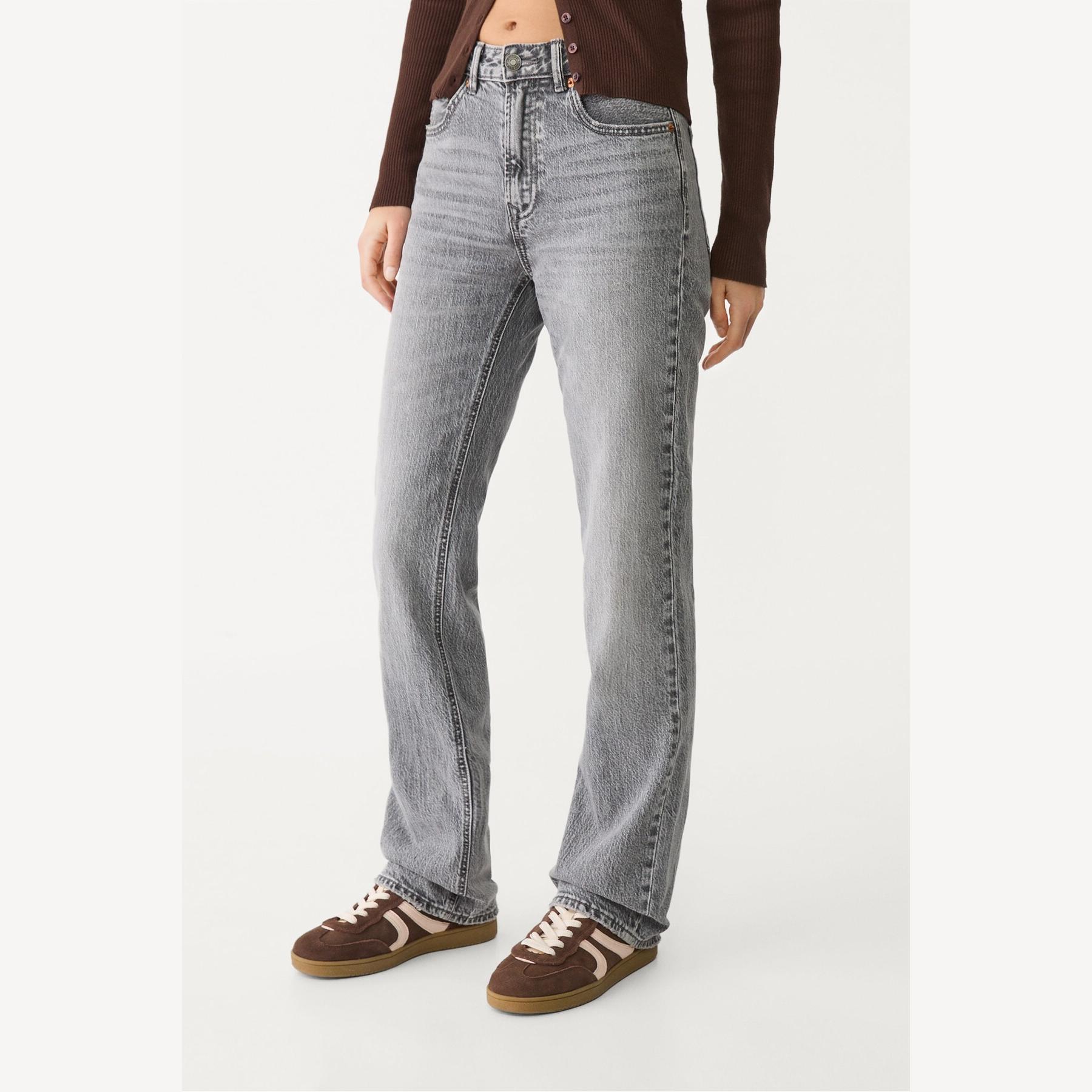 بنطال جينز أنيق من Stradivarius بلون رمادي بلمسة مغسولة، مصنوع من خامة قطنية مريحة، يتميز بقصة مستقيمة (Straight Fit) وخصر متوسط الارتفاع، مزود بإغلاق أمامي بسحاب وزر معدني، تصميم بخمسة جيوب عملية، بدون حزام، مثالي للتنسيق مع توبات قصيرة أو جاكيتات لإطلالة كاجوال مريحة وعصرية.