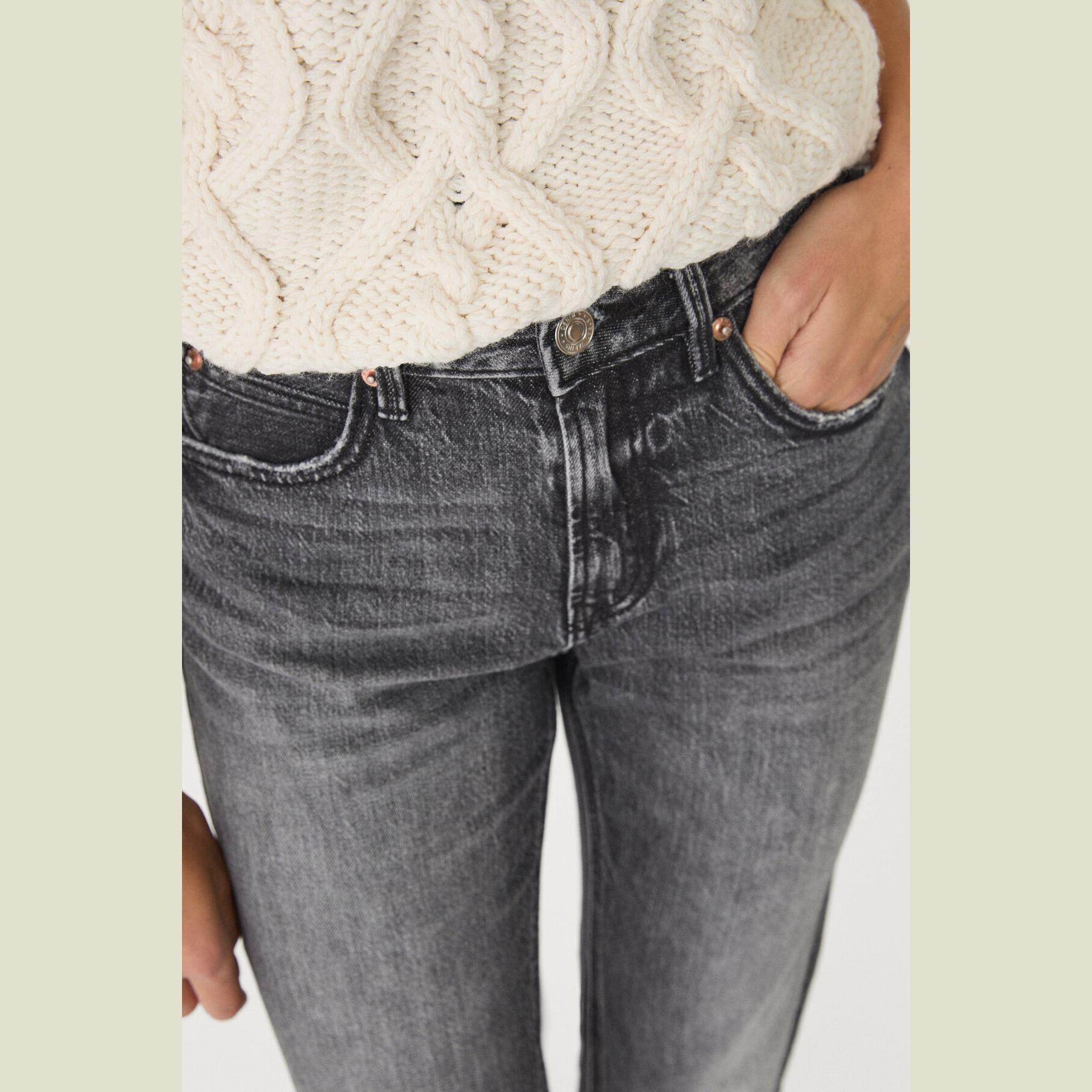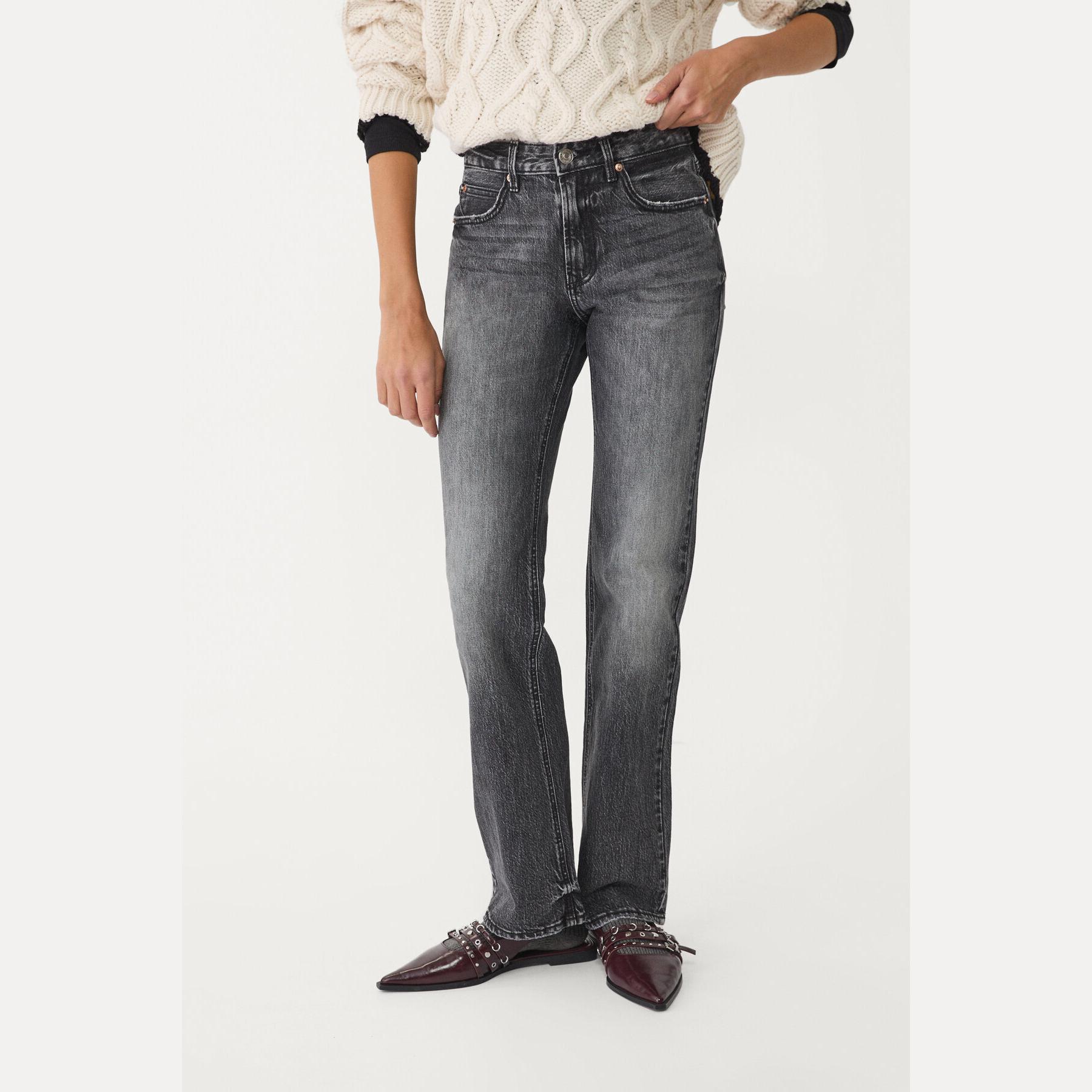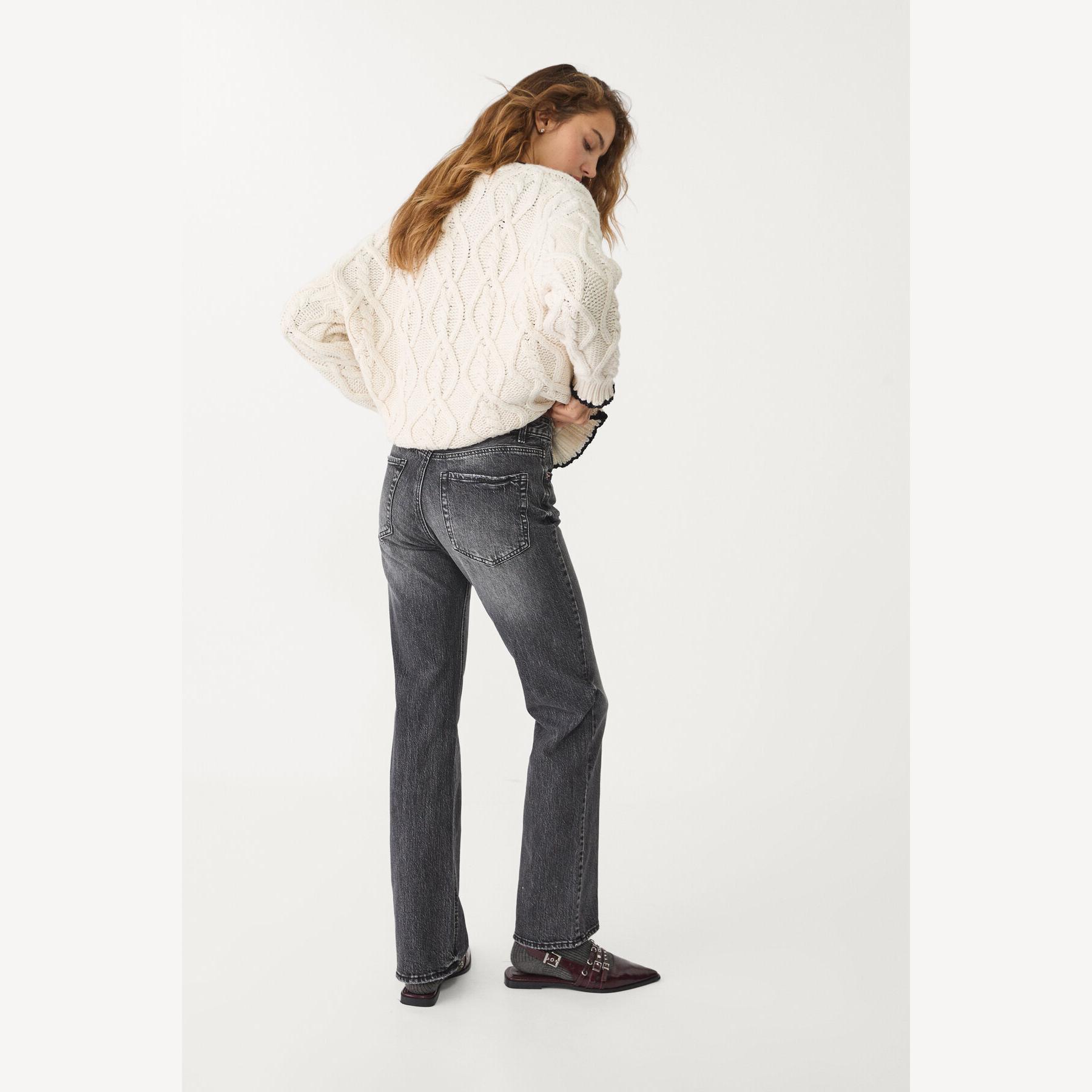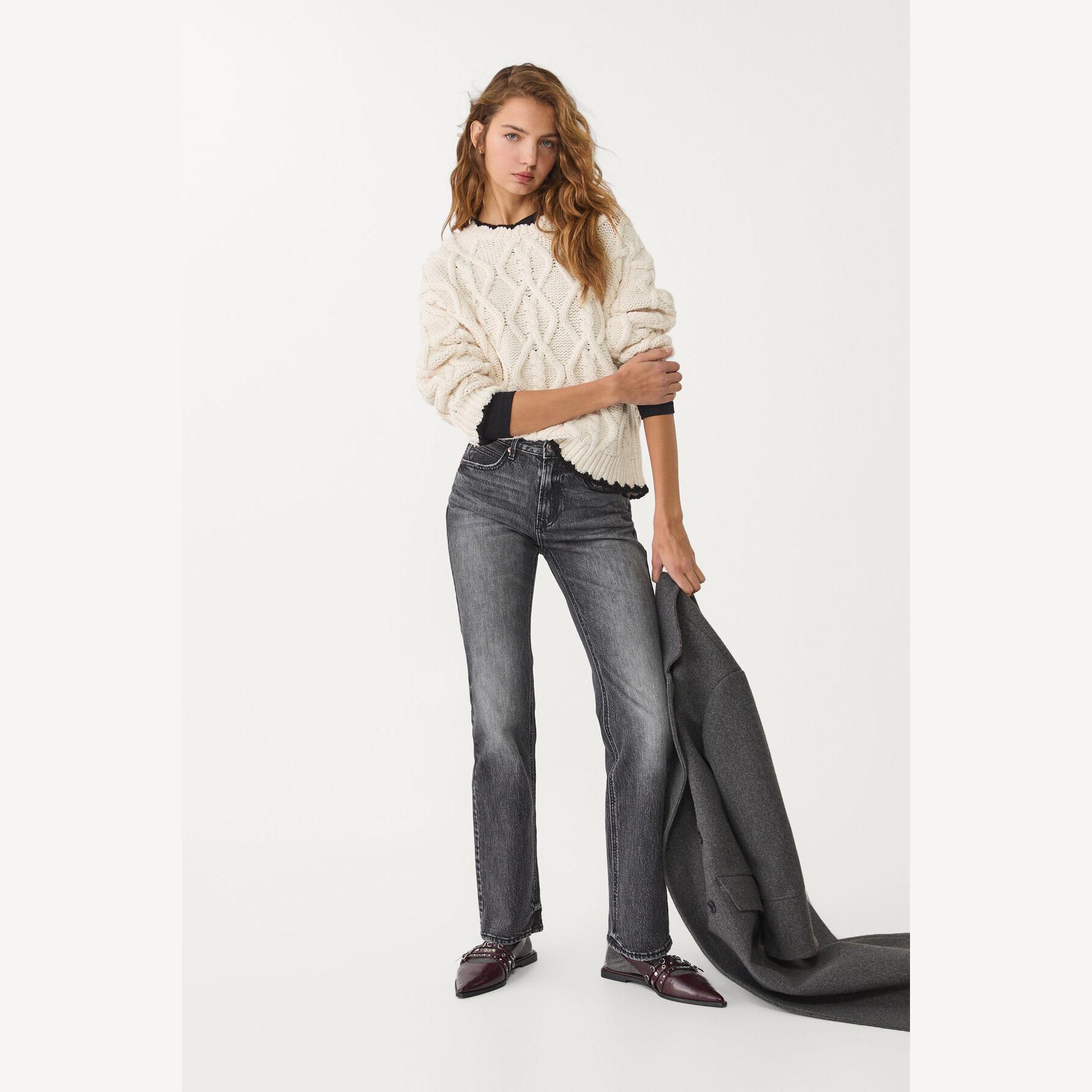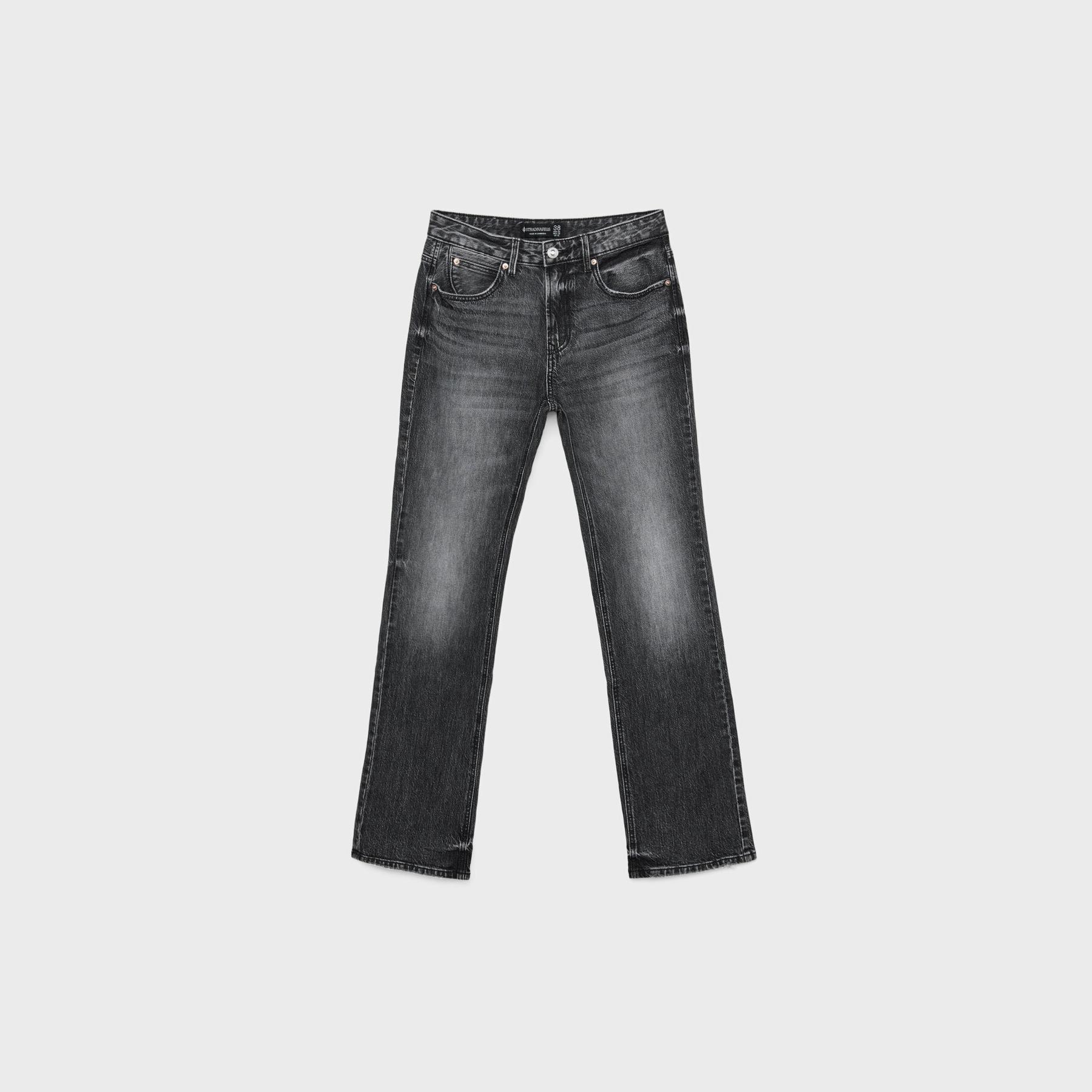 بنطال جينز أنيق من Stradivarius بلون أسود مغسول، مصنوع من خامة قطنية مريحة بلمسة Vintage، يتميز بقصة مستقيمة (Straight Fit) وخصر متوسط الارتفاع، مزود بإغلاق أمامي بسحاب وزر معدني، تصميم بخمسة جيوب عملية، بدون حزام، مثالي للتنسيق مع توبات قصيرة أو جاكيتات لإطلالة كاجوال مريحة وعصرية.
