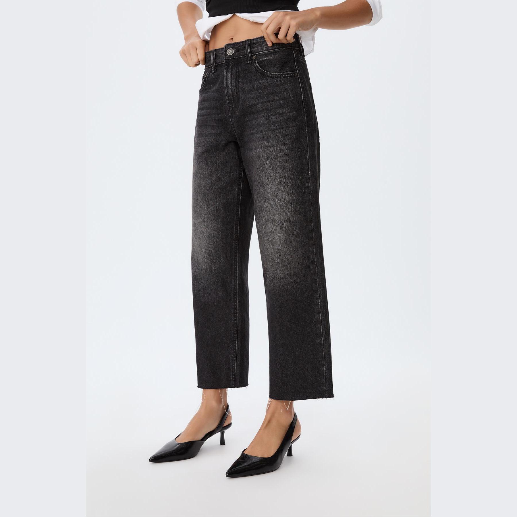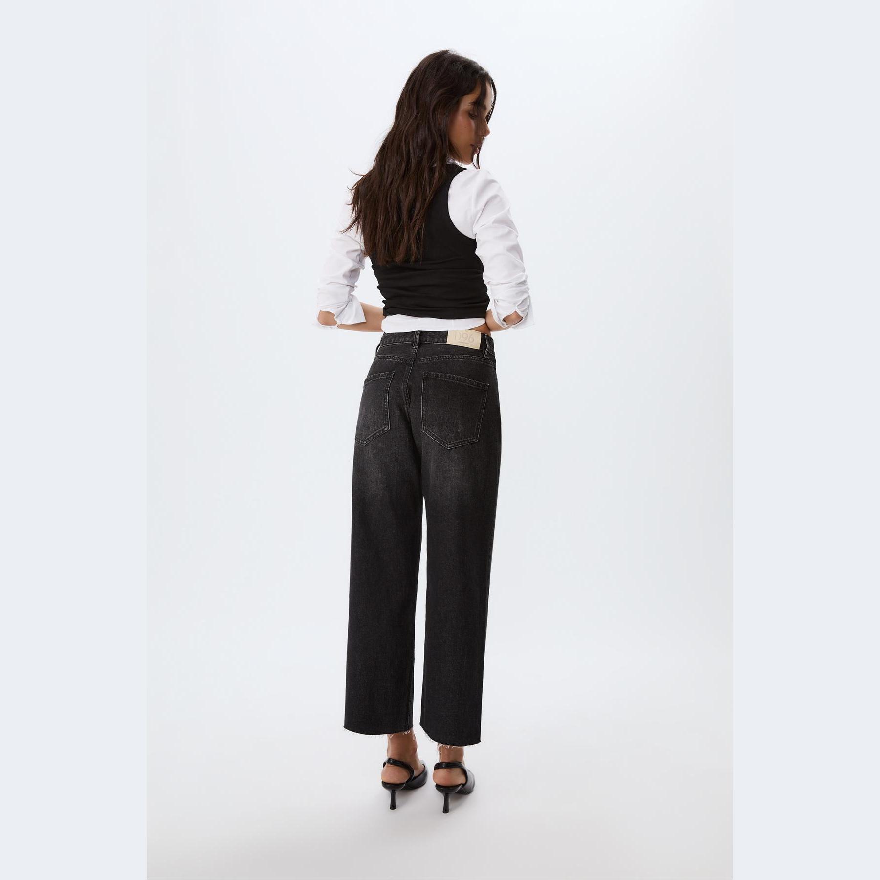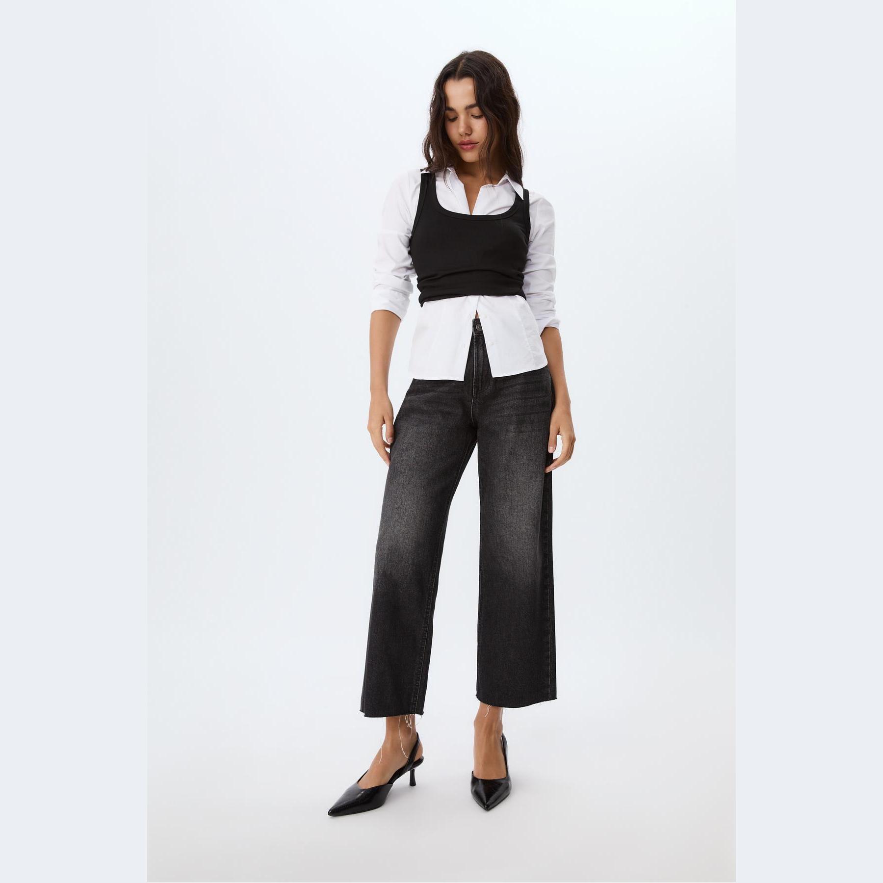 بنطال جينز أنيق من Stradivarius بلون رمادي مغسول، مصنوع من خامة قطنية 100%، يتميز بقصة مستقيمة (Straight Fit) وبطول الكاحل، بخصر متوسط الارتفاع، مزود بإغلاق أمامي بسحاب وزر معدني، تصميم بخمسة جيوب عملية، مزود بحلقات حزام، وأطراف سفلية بتشطيب خفيف يوحي بالاهتراء، مثالي للتنسيق مع توبات قصيرة أو جاكيتات لإطلالة كاجوال مريحة وعصرية.