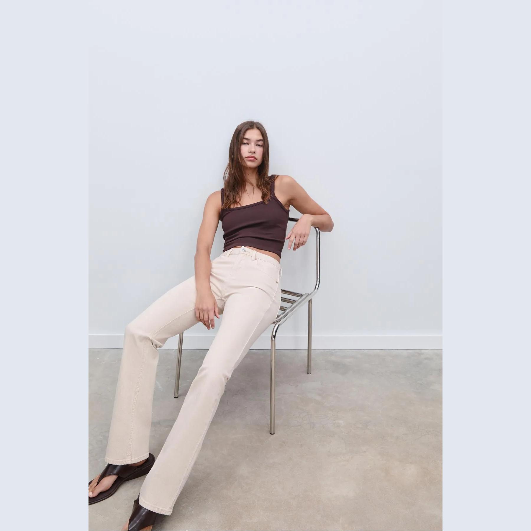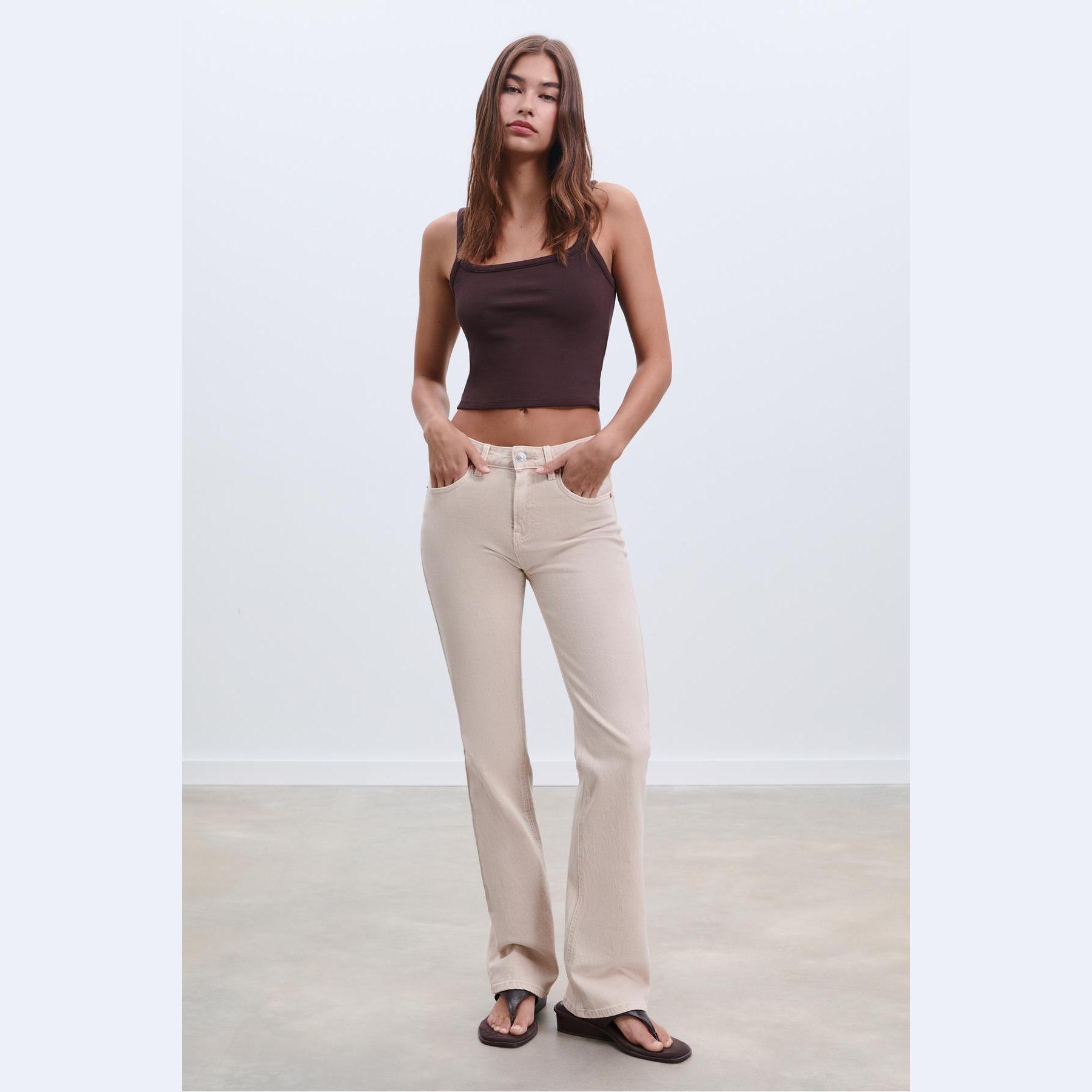 بنطال جينز أنيق من Stradivarius بلون كريمي هادئ، مصنوع من خامة Comfort Denim بتركيبة مرنة، يتميز بقصة مستقيمة (Straight Fit) وخصر متوسط الارتفاع، مزود بإغلاق أمامي بسحاب وزر معدني، تصميم بخمسة جيوب عملية، بدون حزام، مثالي للتنسيق مع توبات قصيرة أو قطع بألوان ترابية لإطلالة كاجوال مريحة وعصرية.