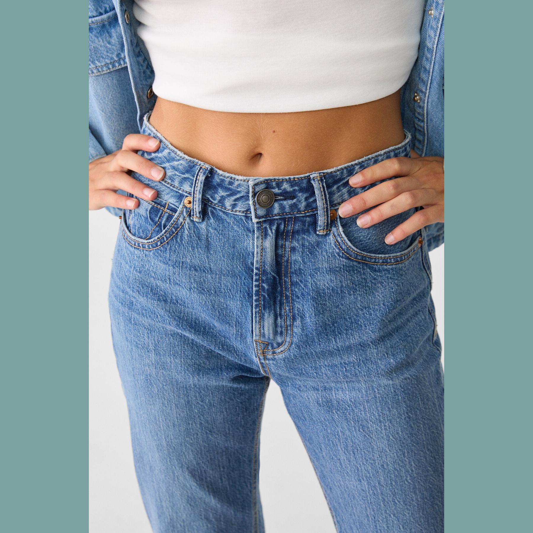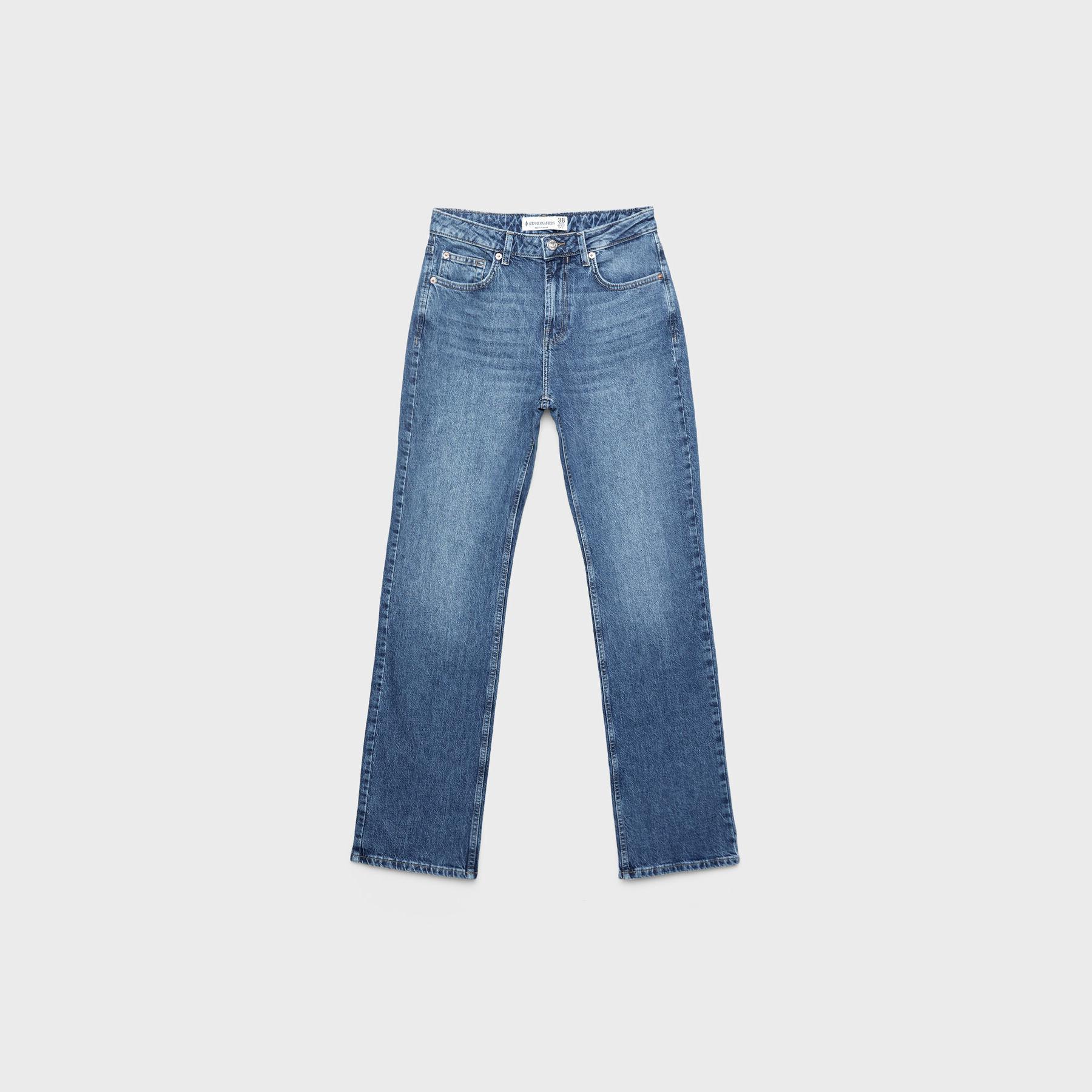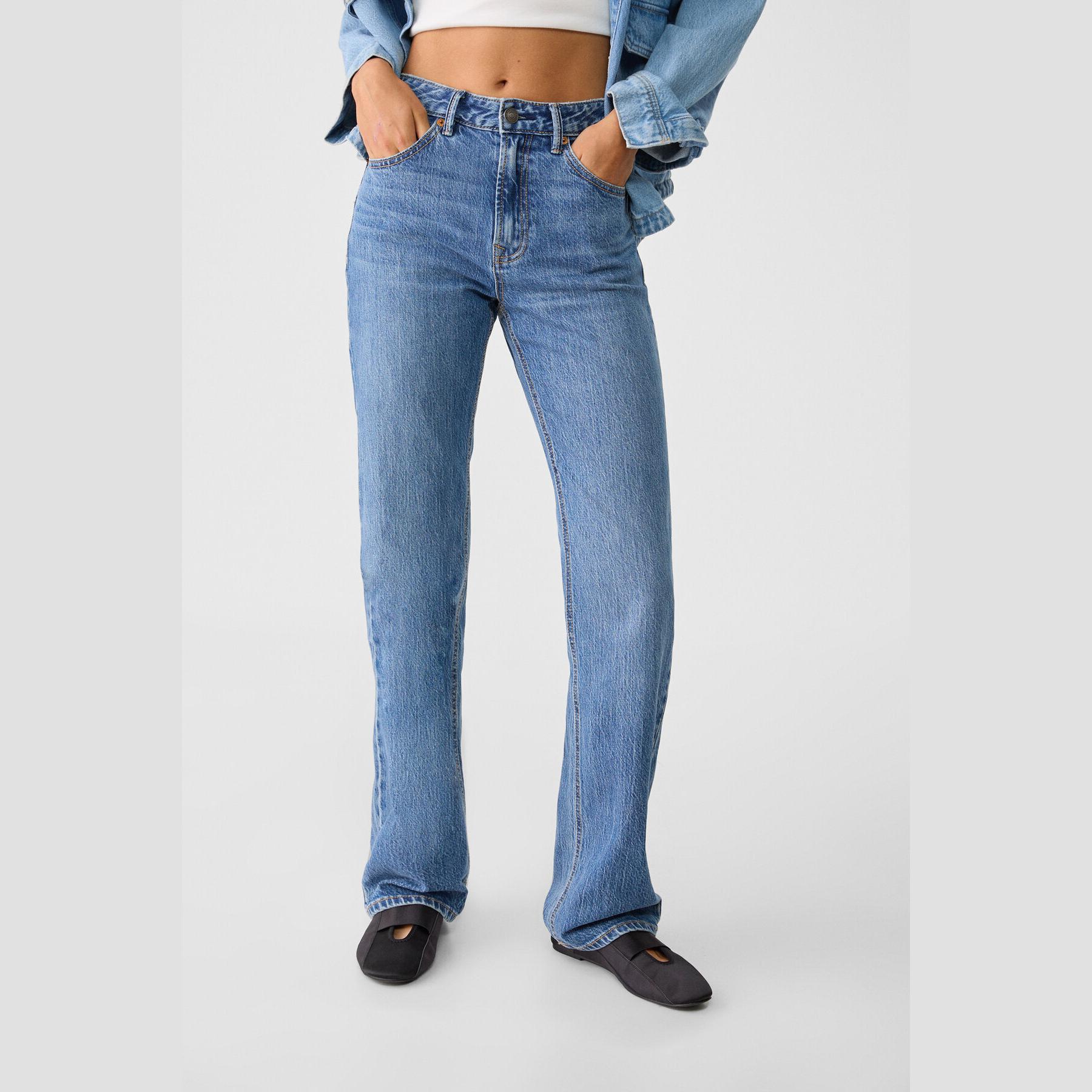 بنطال جينز أنيق من Stradivarius بلون أزرق دنيم مغسول، مصنوع من خامة Comfort Denim بتركيبة مرنة، يتميز بقصة مستقيمة (Straight Fit) وخصر عالي يغطي منطقة السرة، مزود بإغلاق أمامي بسحاب وزر معدني، تصميم بخمسة جيوب عملية، بدون حزام، مثالي للتنسيق مع توبات قصيرة أو جاكيتات لإطلالة كاجوال مريحة وعصرية.
