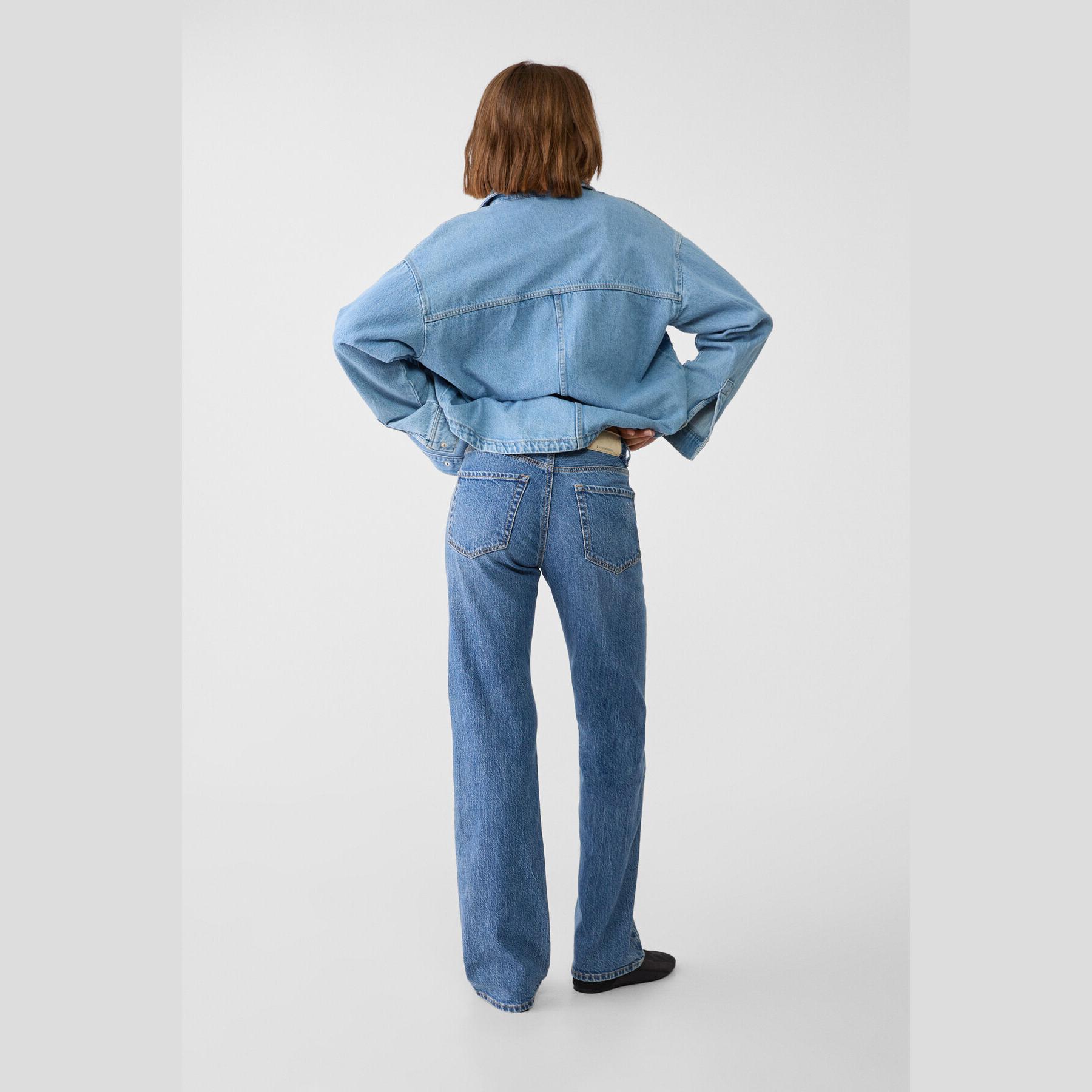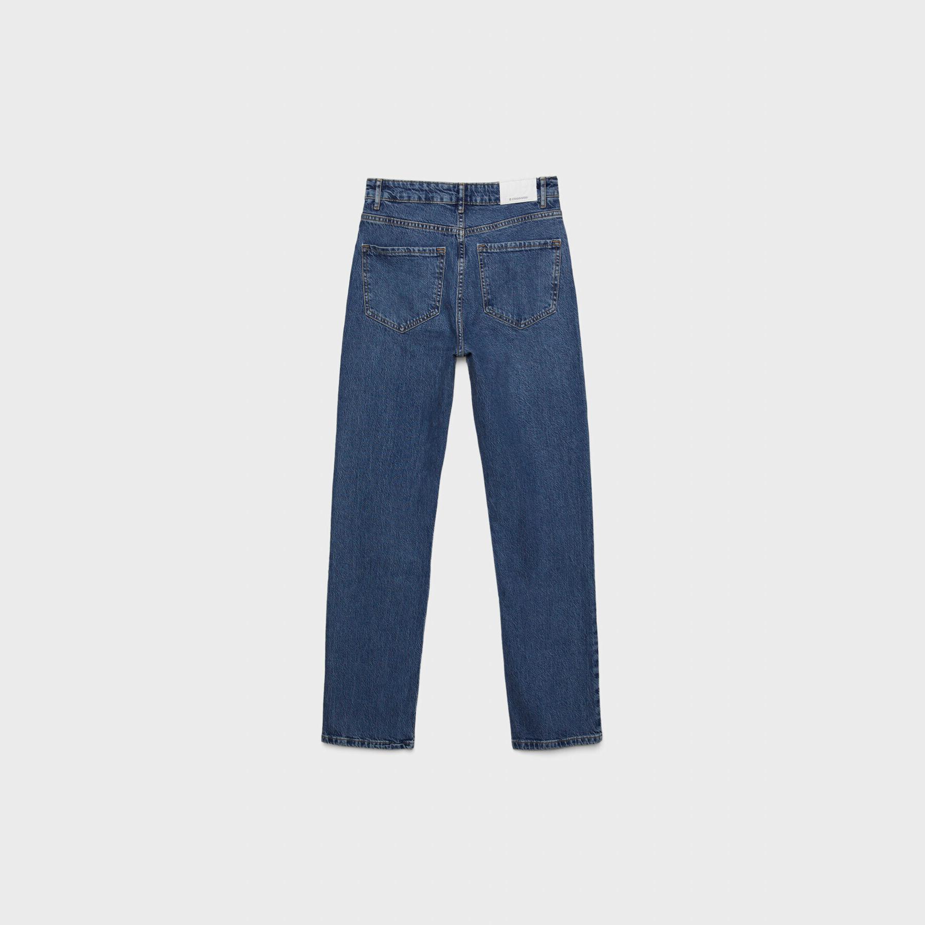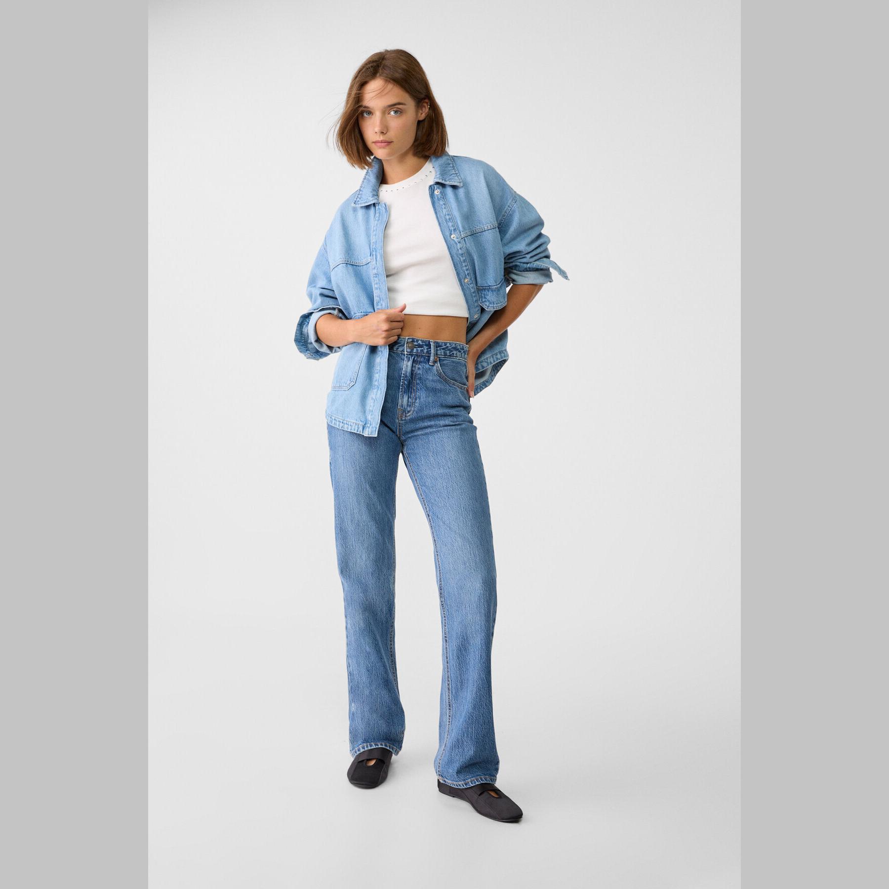 بنطال جينز أنيق من Stradivarius بلون أزرق دنيم مغسول، مصنوع من خامة Comfort Denim بتركيبة مرنة، يتميز بقصة مستقيمة (Straight Fit) وخصر عالي يغطي منطقة السرة، مزود بإغلاق أمامي بسحاب وزر معدني، تصميم بخمسة جيوب عملية، بدون حزام، مثالي للتنسيق مع توبات قصيرة أو جاكيتات لإطلالة كاجوال مريحة وعصرية.