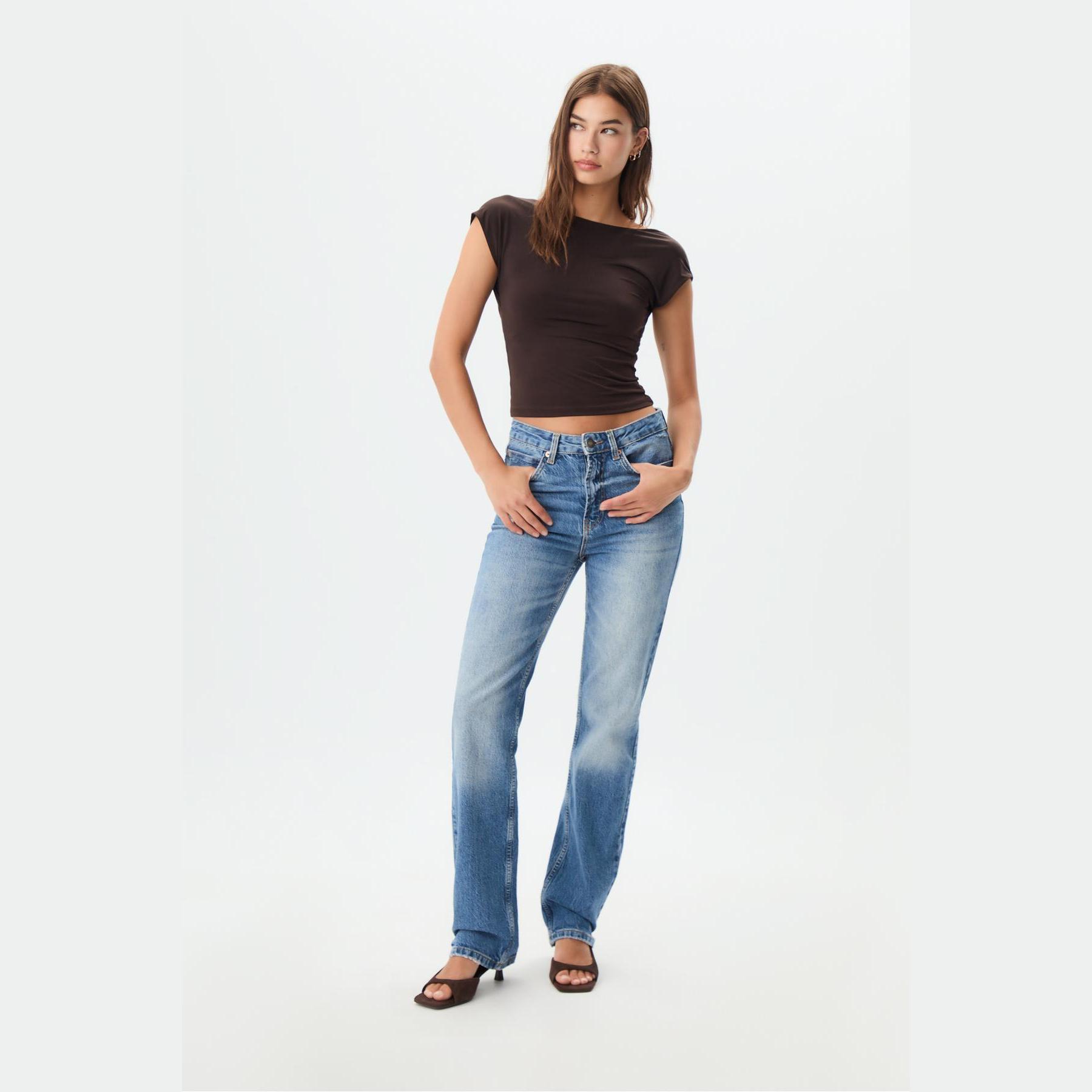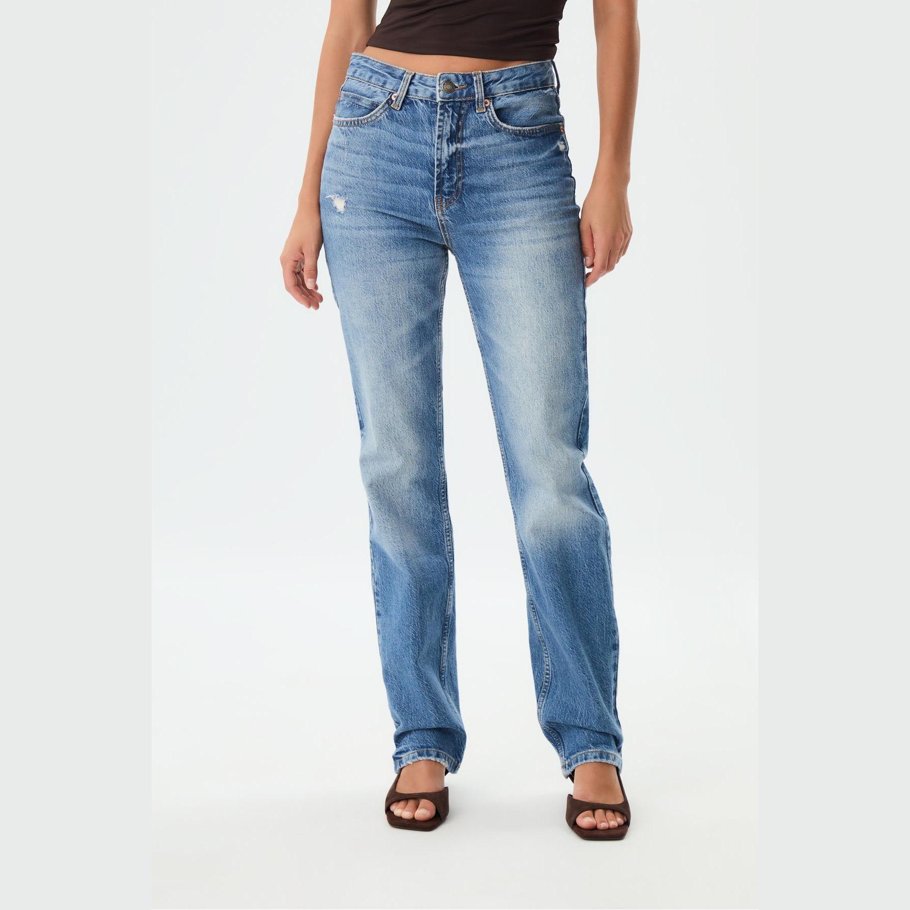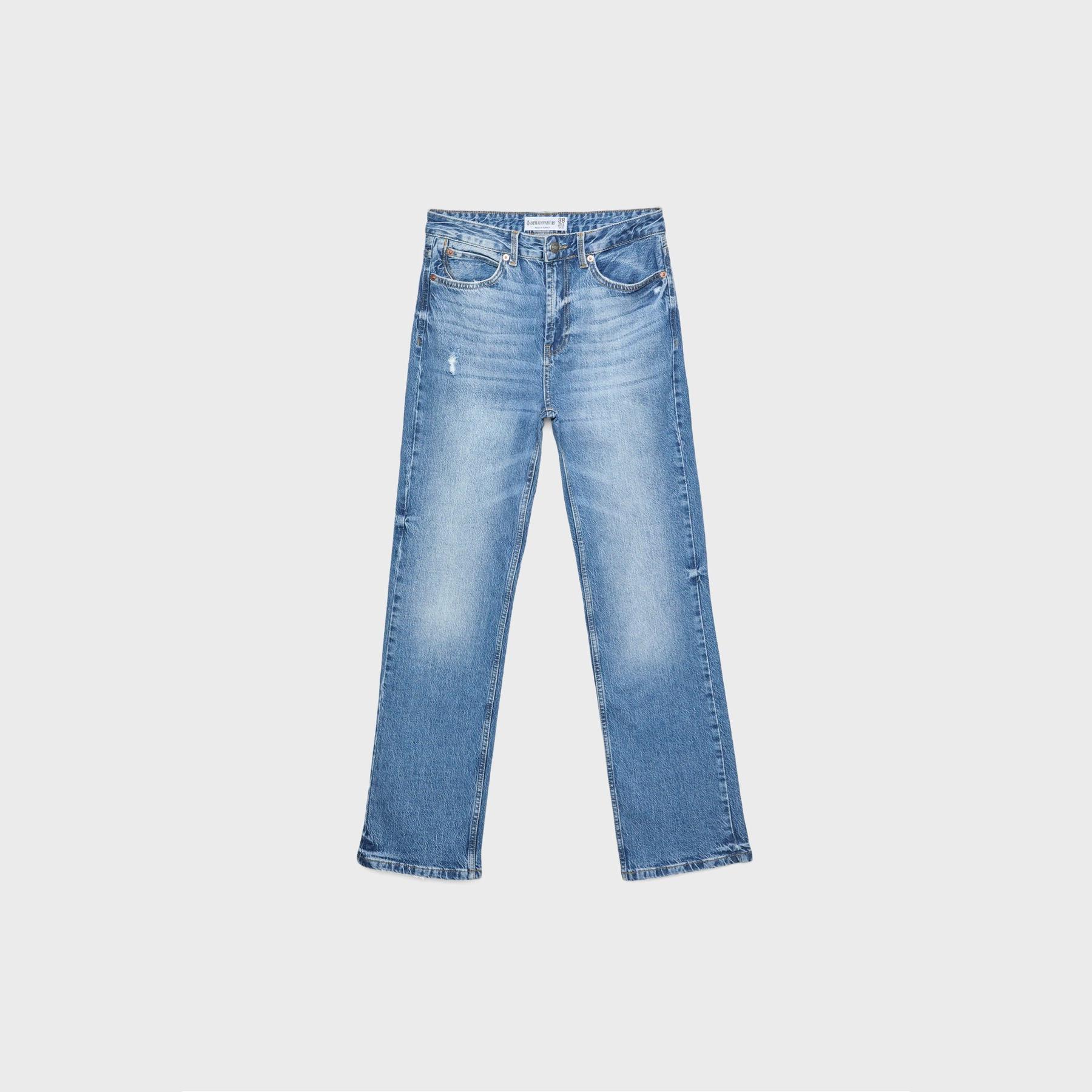 بنطال جينز أنيق من Stradivarius بلون أزرق دنيم مغسول، مصنوع من خامة Comfort Denim بتركيبة مريحة، يتميز بقصة مستقيمة (Straight Fit) وخصر متوسط الارتفاع، مزود بإغلاق أمامي بسحاب وزر معدني، تصميم بخمسة جيوب عملية، بدون حزام، مثالي للتنسيق مع توبات قصيرة أو جاكيتات لإطلالة كاجوال مريحة وعصرية.