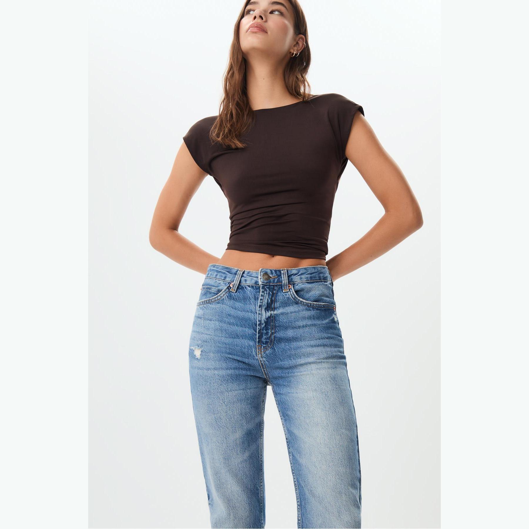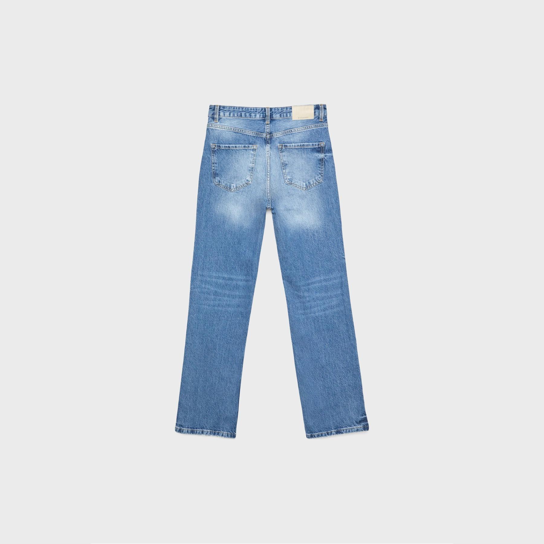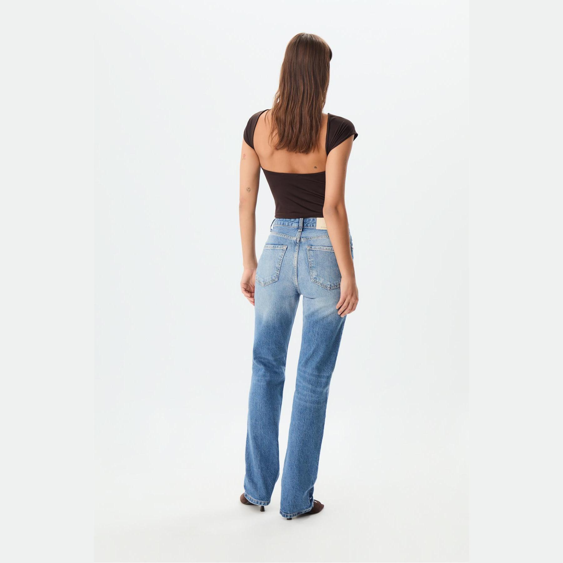 بنطال جينز أنيق من Stradivarius بلون أزرق دنيم مغسول، مصنوع من خامة Comfort Denim بتركيبة مريحة، يتميز بقصة مستقيمة (Straight Fit) وخصر متوسط الارتفاع، مزود بإغلاق أمامي بسحاب وزر معدني، تصميم بخمسة جيوب عملية، بدون حزام، مثالي للتنسيق مع توبات قصيرة أو جاكيتات لإطلالة كاجوال مريحة وعصرية.