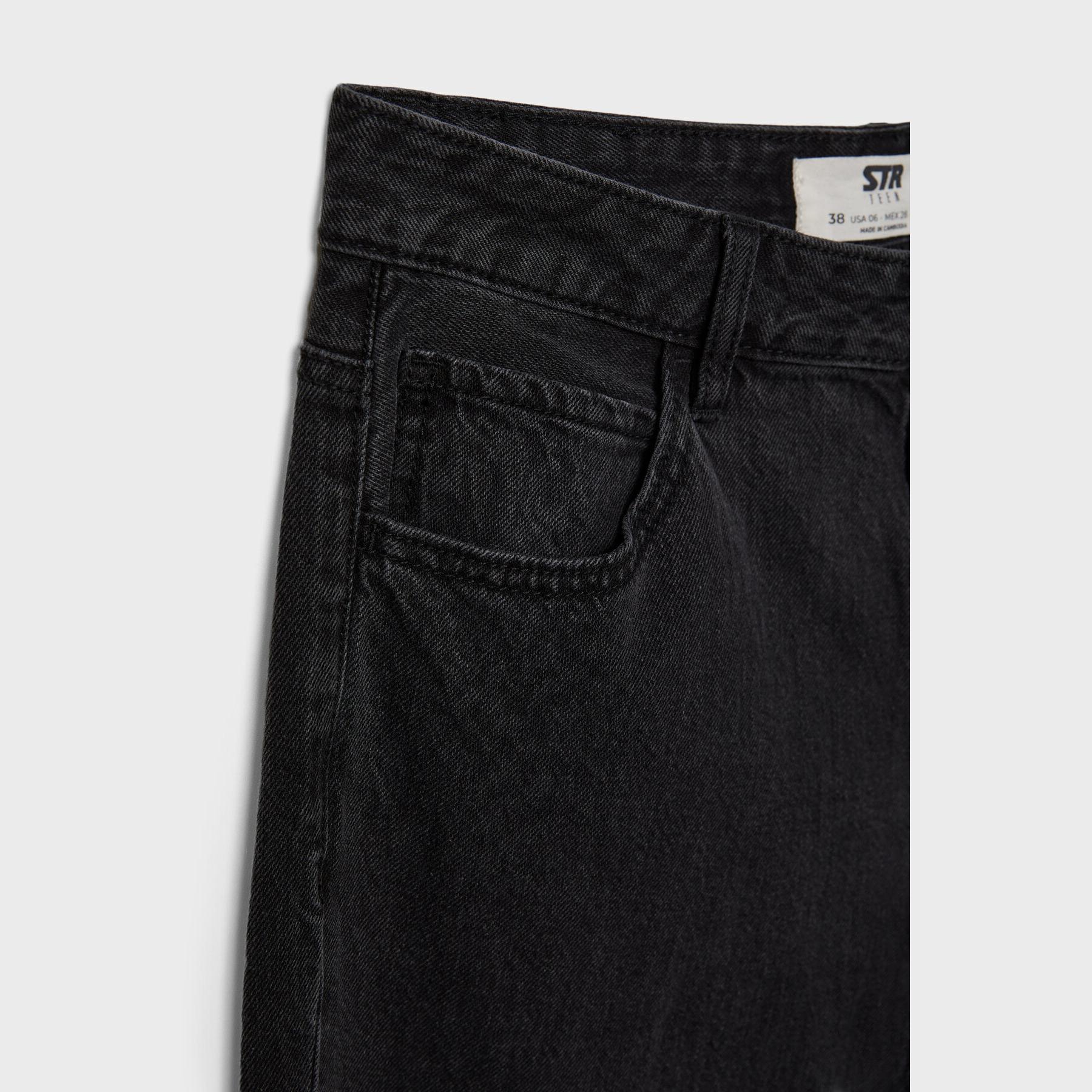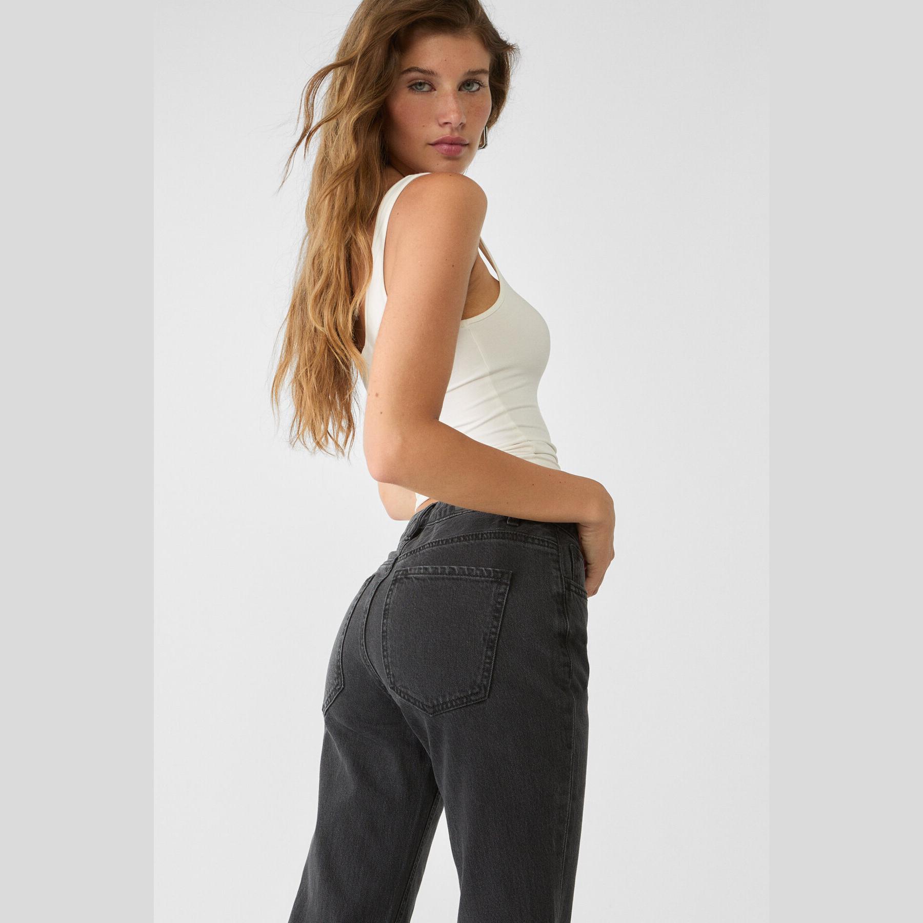 بنطال جينز أنيق من Stradivarius بلون أسود كلاسيكي، مصنوع من خامة Denim قطنية مريحة، يتميز بقصة إسبانيول واسعة من الأسفل، بخصر عالي يغطي منطقة السرة، مزود بإغلاق أمامي بسحاب وزر معدني، تصميم بخمسة جيوب عملية، بدون حزام، وأطراف بطول قياسي، مثالي للتنسيق مع توبات قصيرة أو جاكيتات لإطلالة كاجوال مريحة وعصرية.