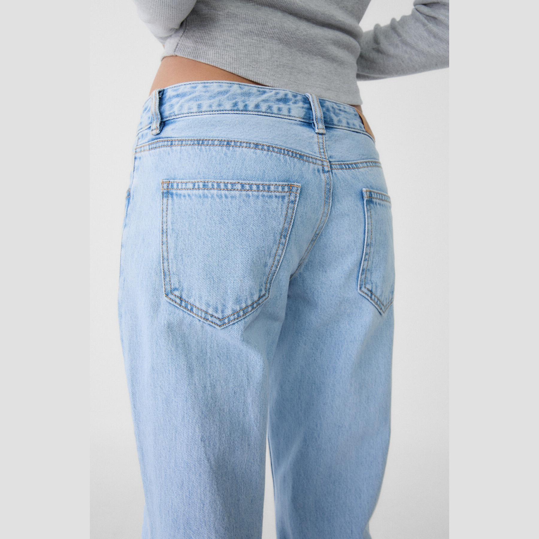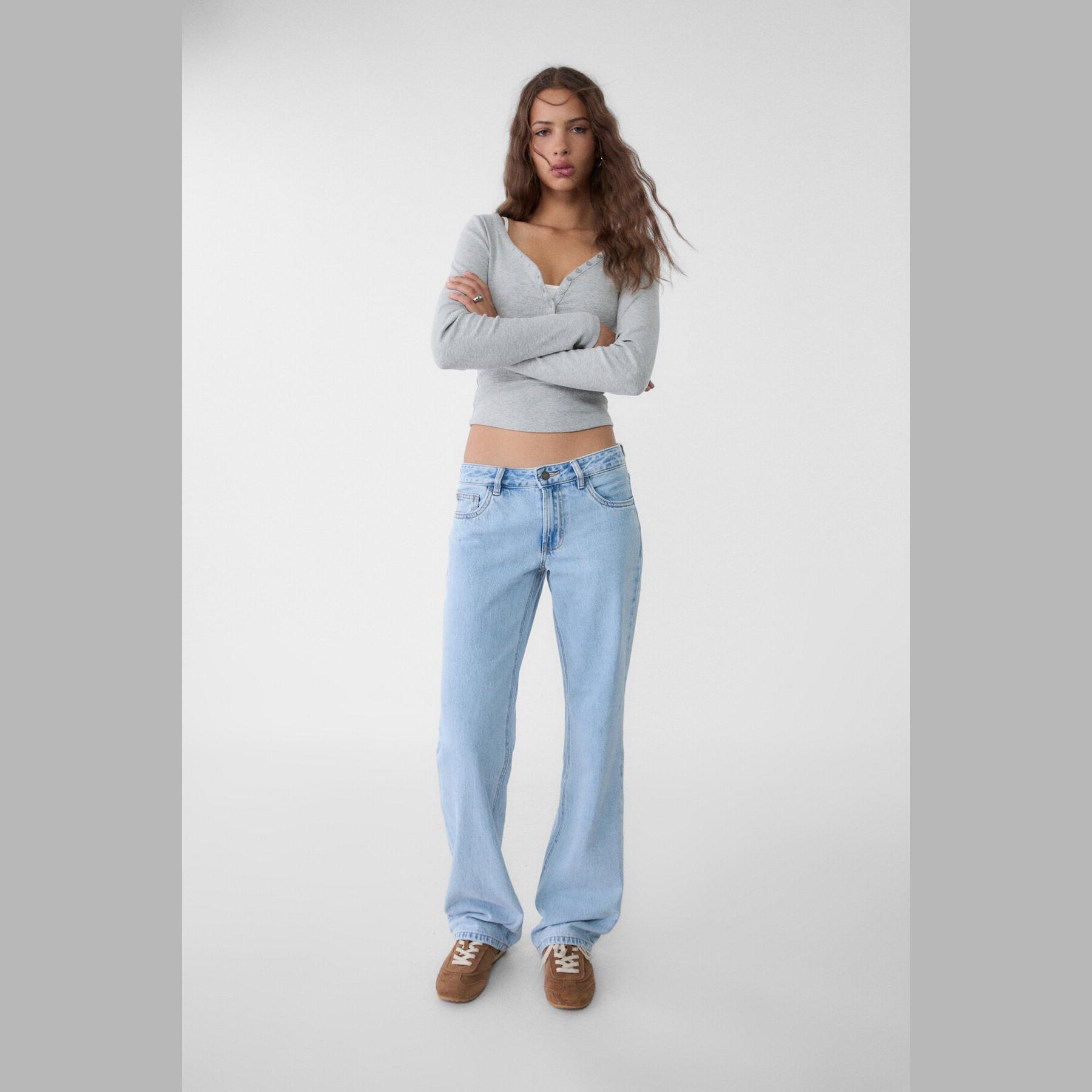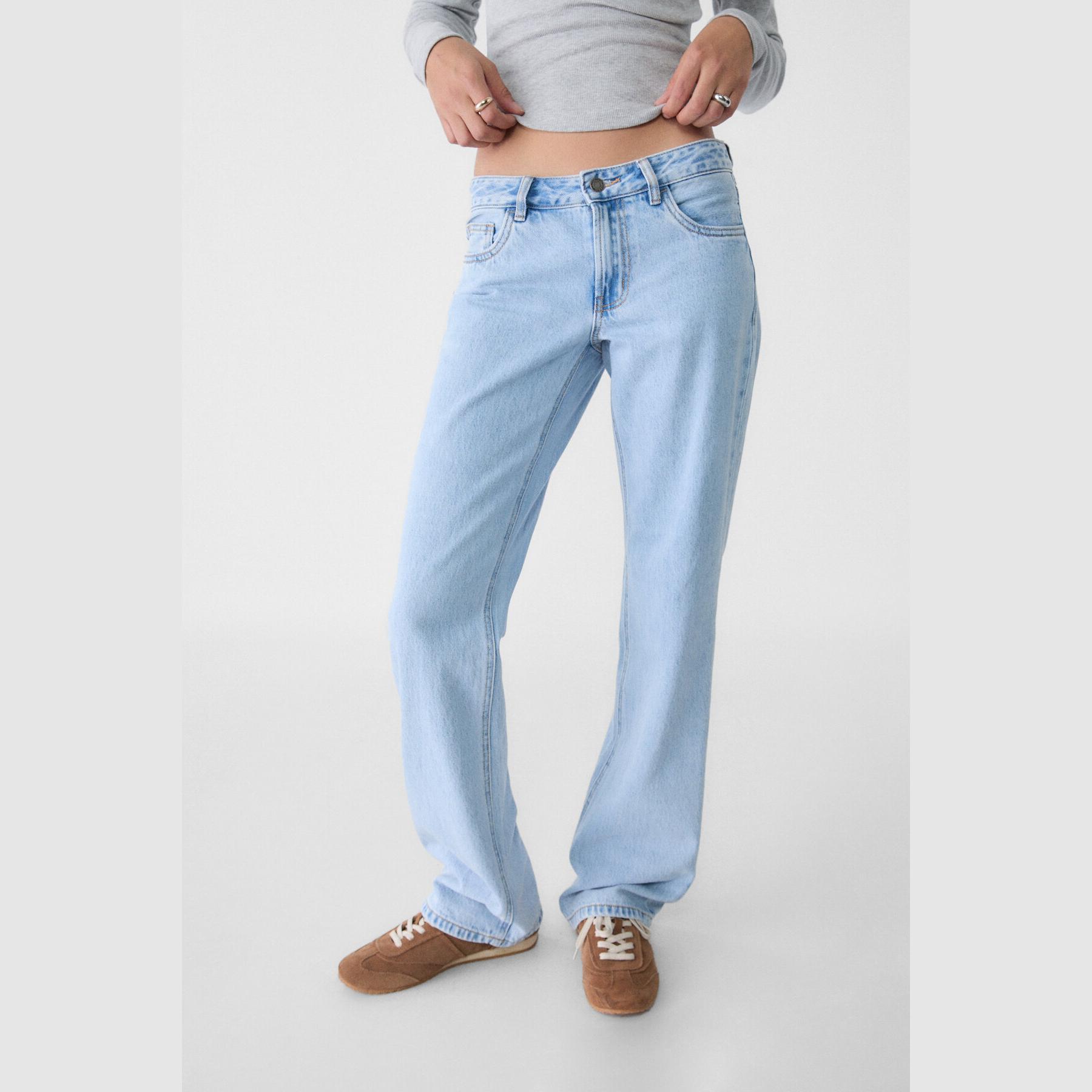 بنطال جينز أنيق من Stradivarius بلون أزرق فاتح دنيم، مصنوع من خامة قطنية 100%، يتميز بقصة مستقيمة (Straight Fit) وخصر منخفض يمنحك مظهرًا عصريًا، مزود بإغلاق أمامي بسحاب وزر معدني، تصميم بخمسة جيوب عملية، بدون حزام، وأطراف بطول كامل، مثالي للتنسيق مع توبات قصيرة أو جاكيتات لإطلالة كاجوال مريحة وعصرية.