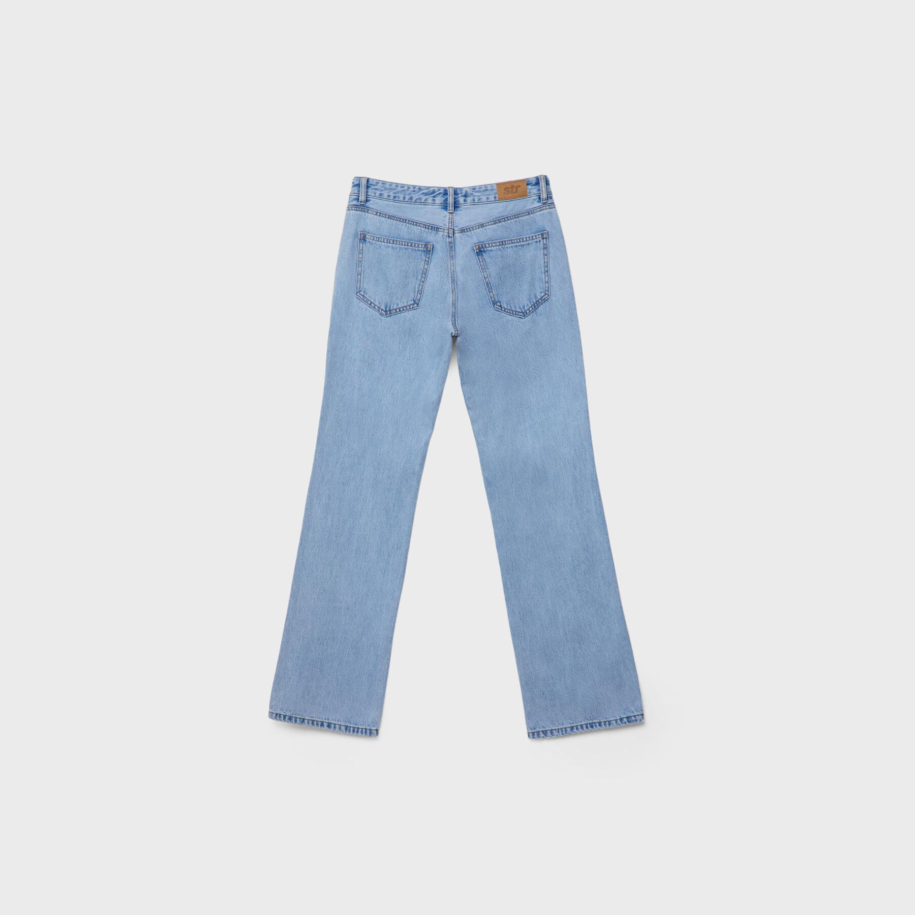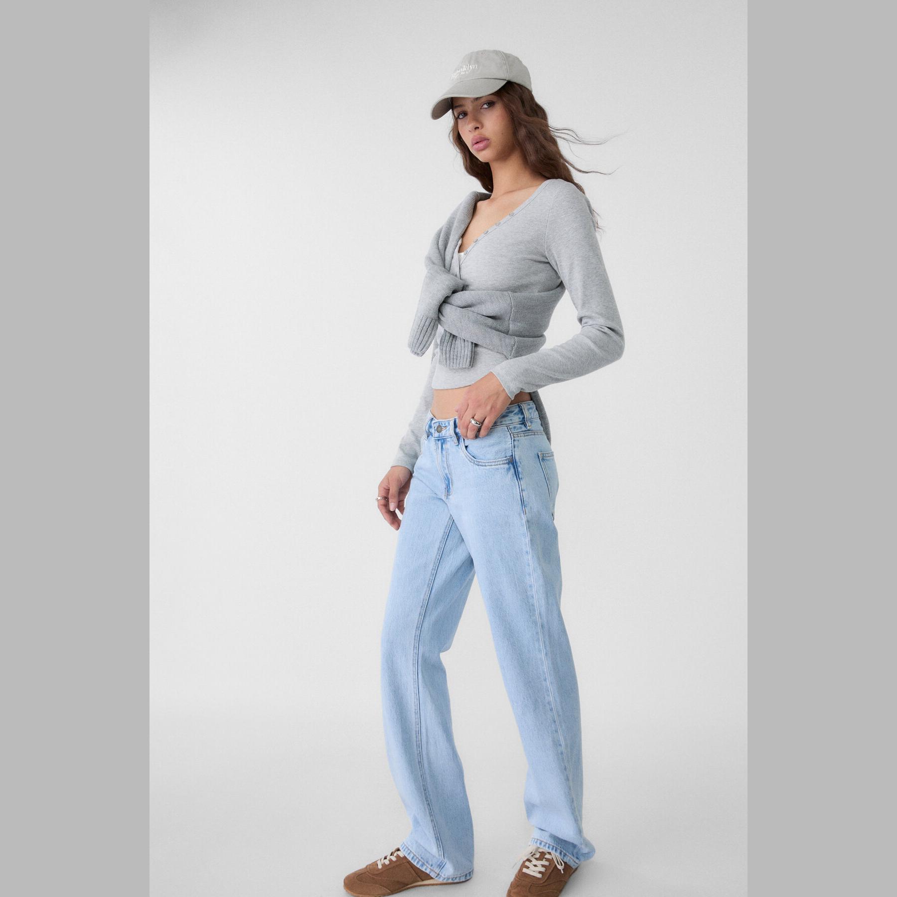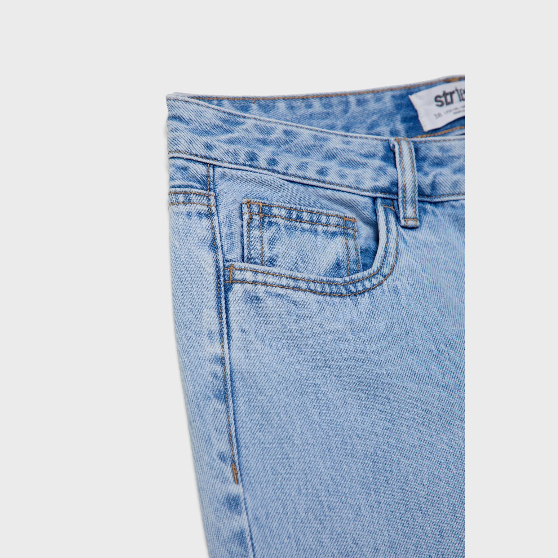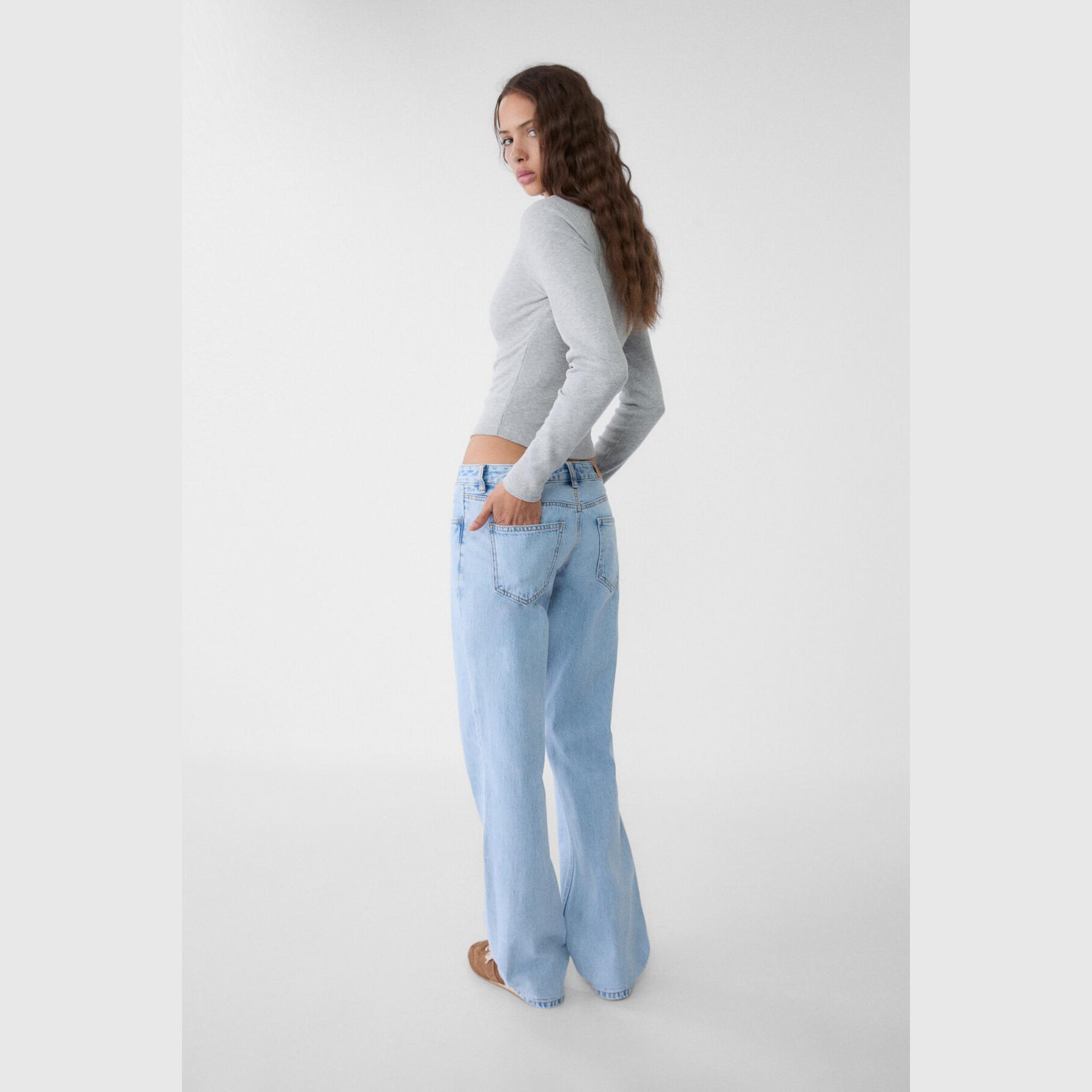 بنطال جينز أنيق من Stradivarius بلون أزرق فاتح دنيم، مصنوع من خامة قطنية 100%، يتميز بقصة مستقيمة (Straight Fit) وخصر منخفض يمنحك مظهرًا عصريًا، مزود بإغلاق أمامي بسحاب وزر معدني، تصميم بخمسة جيوب عملية، بدون حزام، وأطراف بطول كامل، مثالي للتنسيق مع توبات قصيرة أو جاكيتات لإطلالة كاجوال مريحة وعصرية.