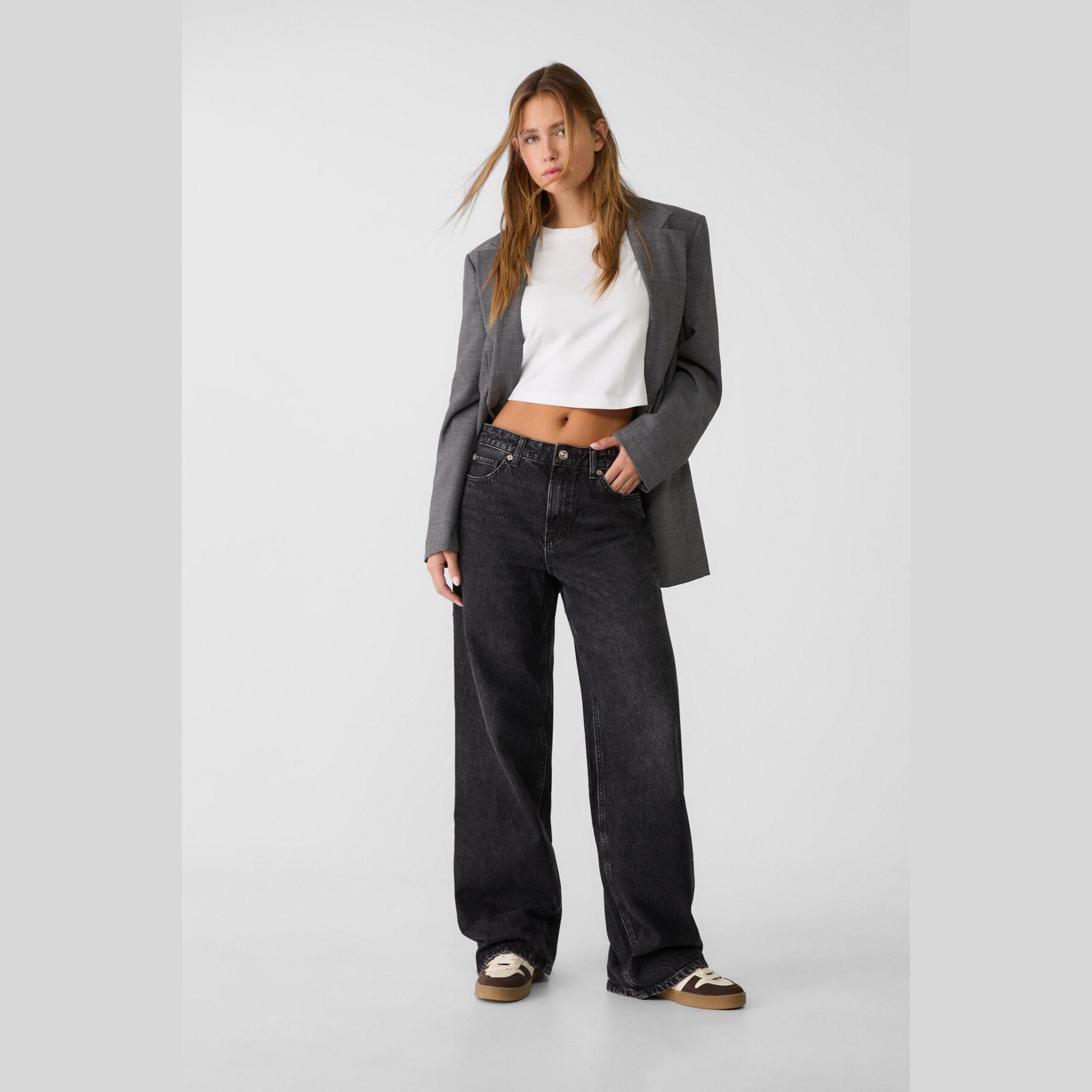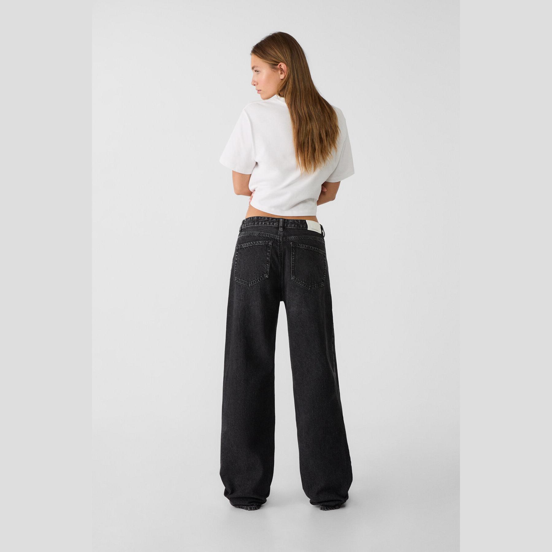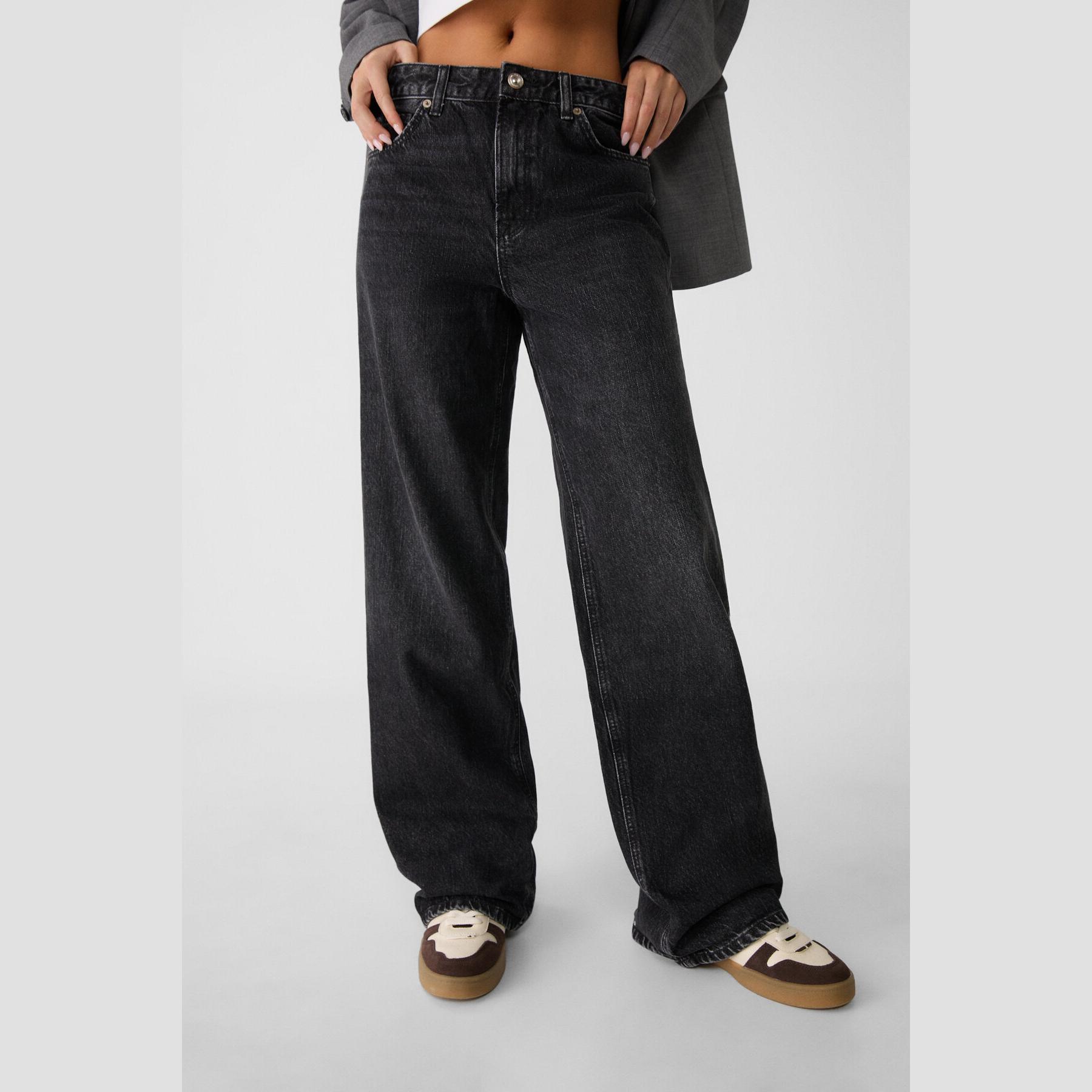 بنطال جينز أنيق من Stradivarius بلون أسود مغسول، مصنوع من خامة قطنية 100% بملمس مريح، يتميز بقصة مستقيمة واسعة (Straight Wide Fit) وخصر عادي يغطي منطقة السرة، مزود بإغلاق أمامي بسحاب وزر معدني، تصميم بخمسة جيوب عملية، بدون حزام، وأطراف بطول قياسي، مثالي للتنسيق مع توبات قصيرة أو جاكيتات لإطلالة كاجوال مريحة وعصرية.