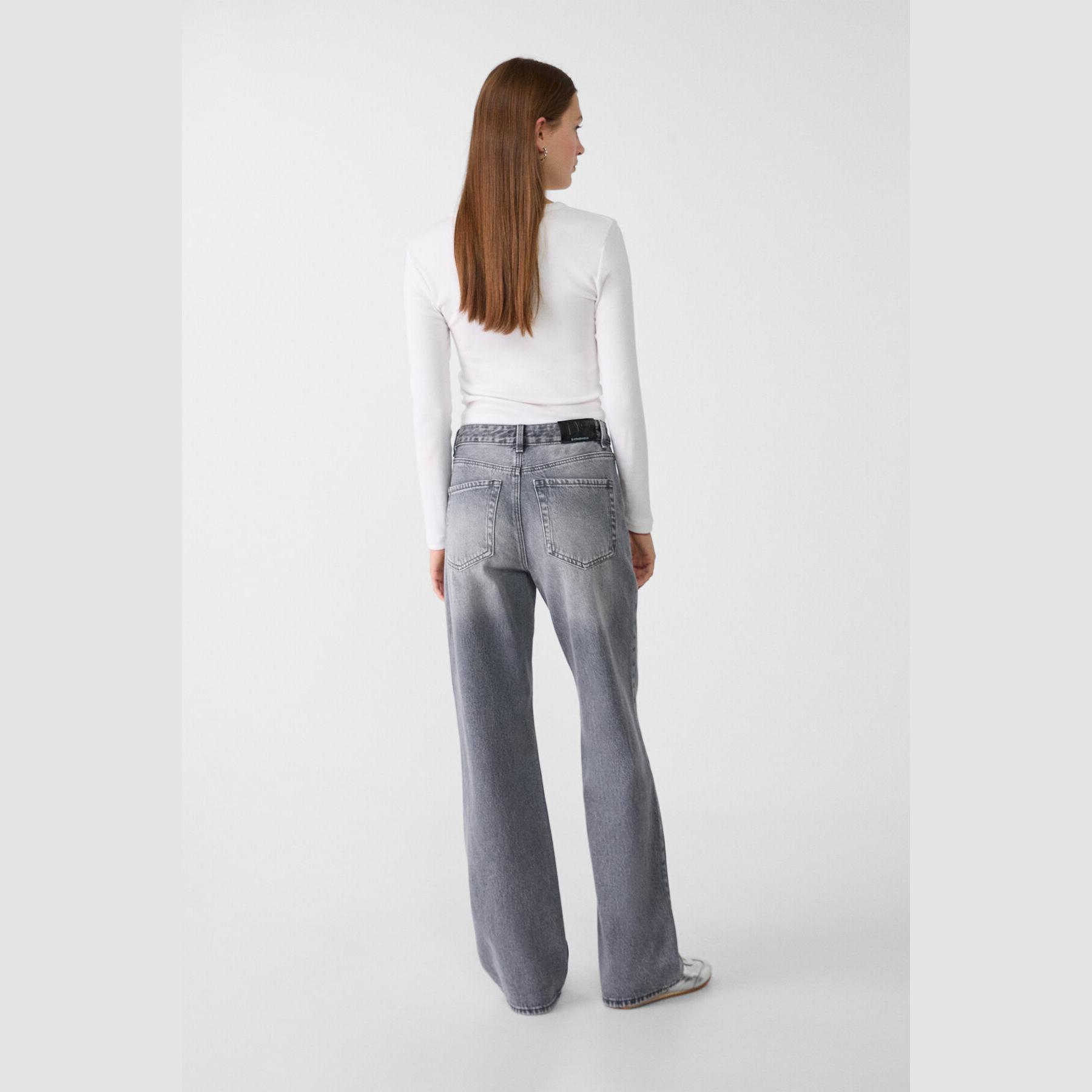 بنطال جينز أنيق من Stradivarius بلون رمادي فاتح دنيم، مصنوع من خامة قطنية 100% بملمس مريح، يتميز بقصة مستقيمة واسعة (Straight Wide Fit) وخصر عادي يغطي منطقة السرة، مزود بإغلاق أمامي بسحاب وزر معدني، تصميم بخمسة جيوب عملية، بدون حزام، وأطراف بطول قياسي، مثالي للتنسيق مع توبات قصيرة أو جاكيتات لإطلالة كاجوال مريحة وعصرية.
