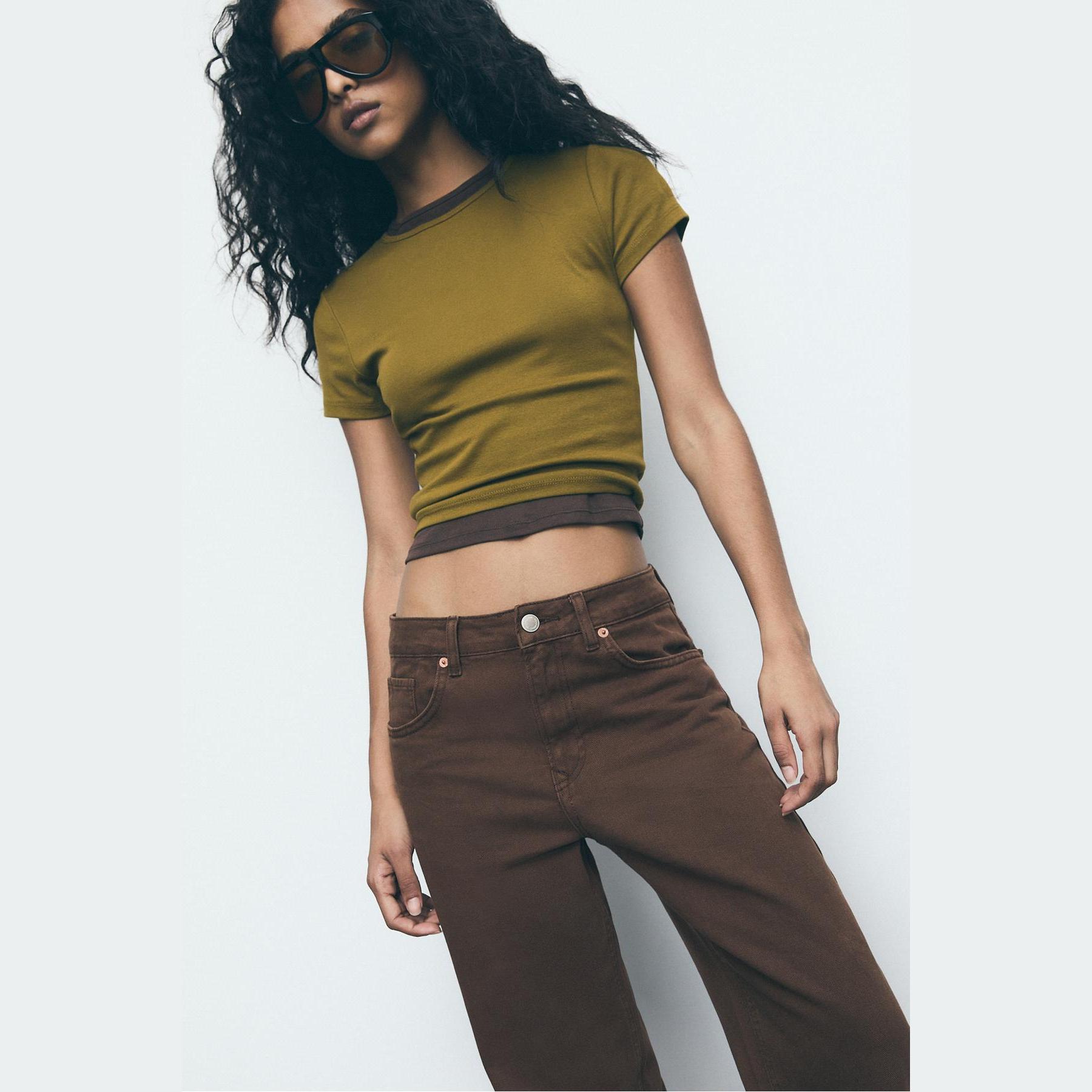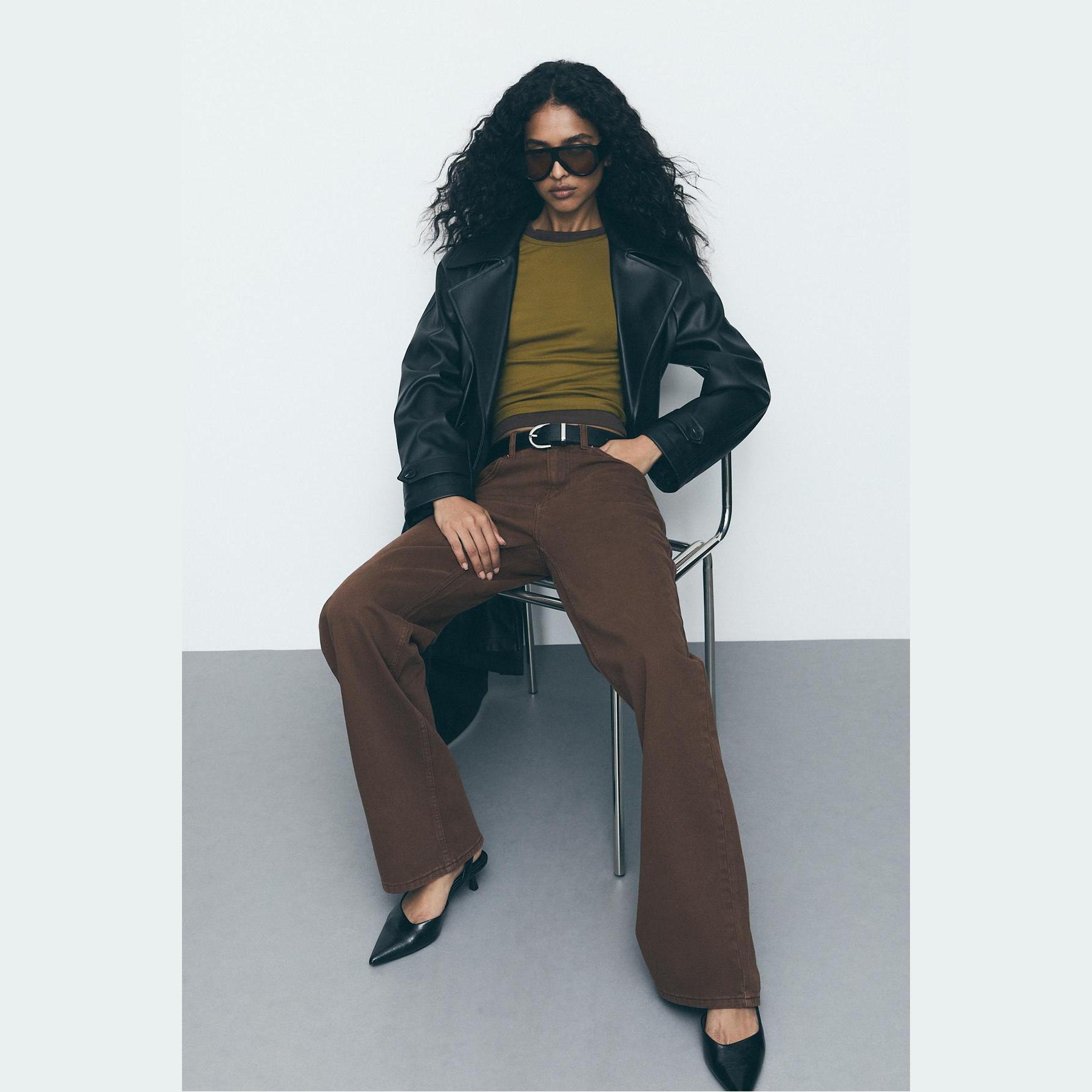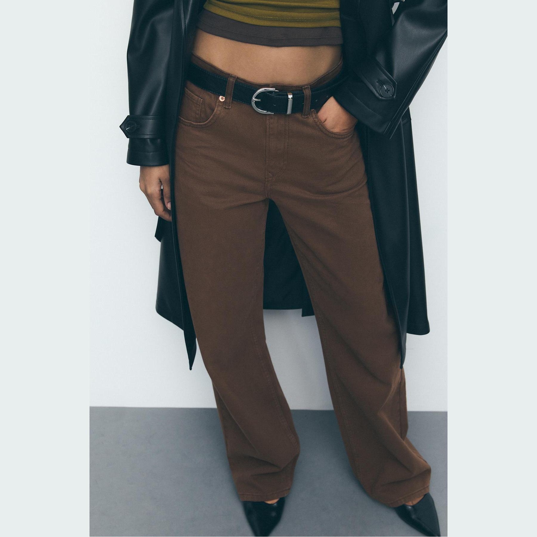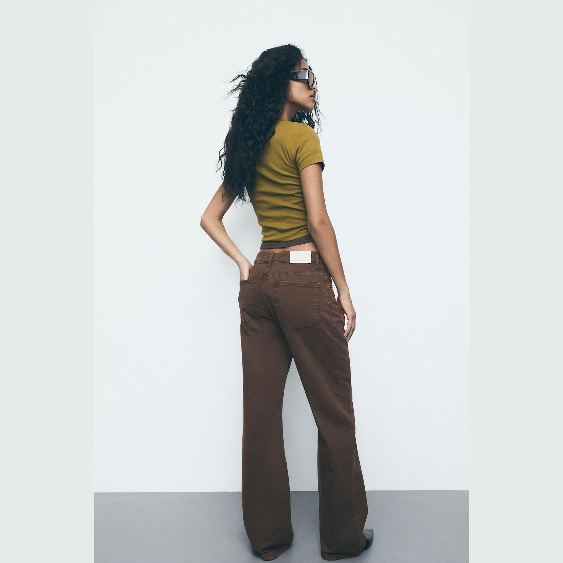 بنطال جينز أنيق من Stradivarius بلون بني فاتح مغسول، مصنوع من خامة قطنية 100% بملمس مريح، يتميز بقصة مستقيمة واسعة (Straight Wide Fit) وخصر عادي يغطي منطقة السرة، مزود بإغلاق أمامي بسحاب وزر معدني، تصميم بخمسة جيوب عملية، بدون حزام، وأطراف بطول قياسي، مثالي للتنسيق مع توبات قصيرة أو جاكيتات لإطلالة كاجوال مريحة وعصرية.