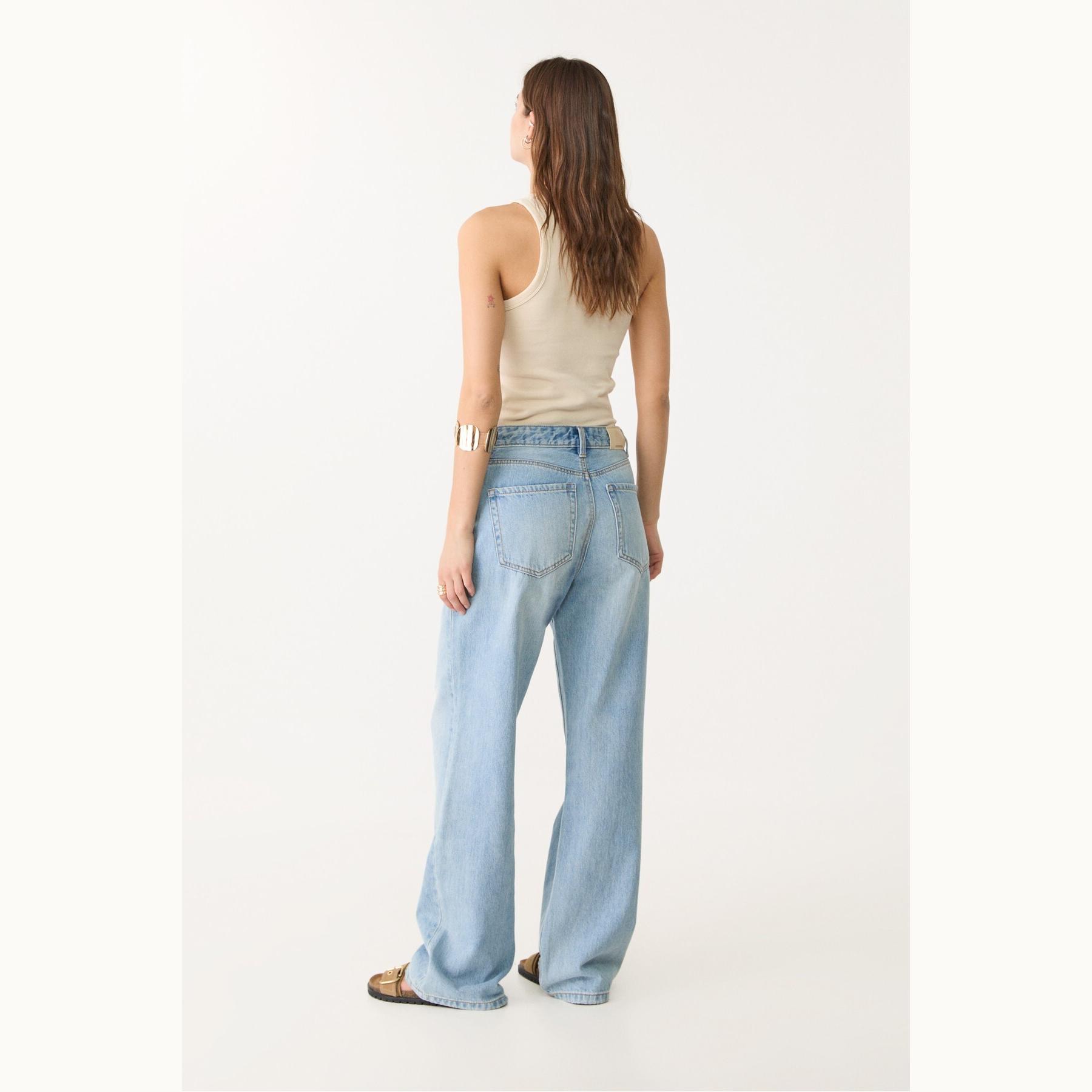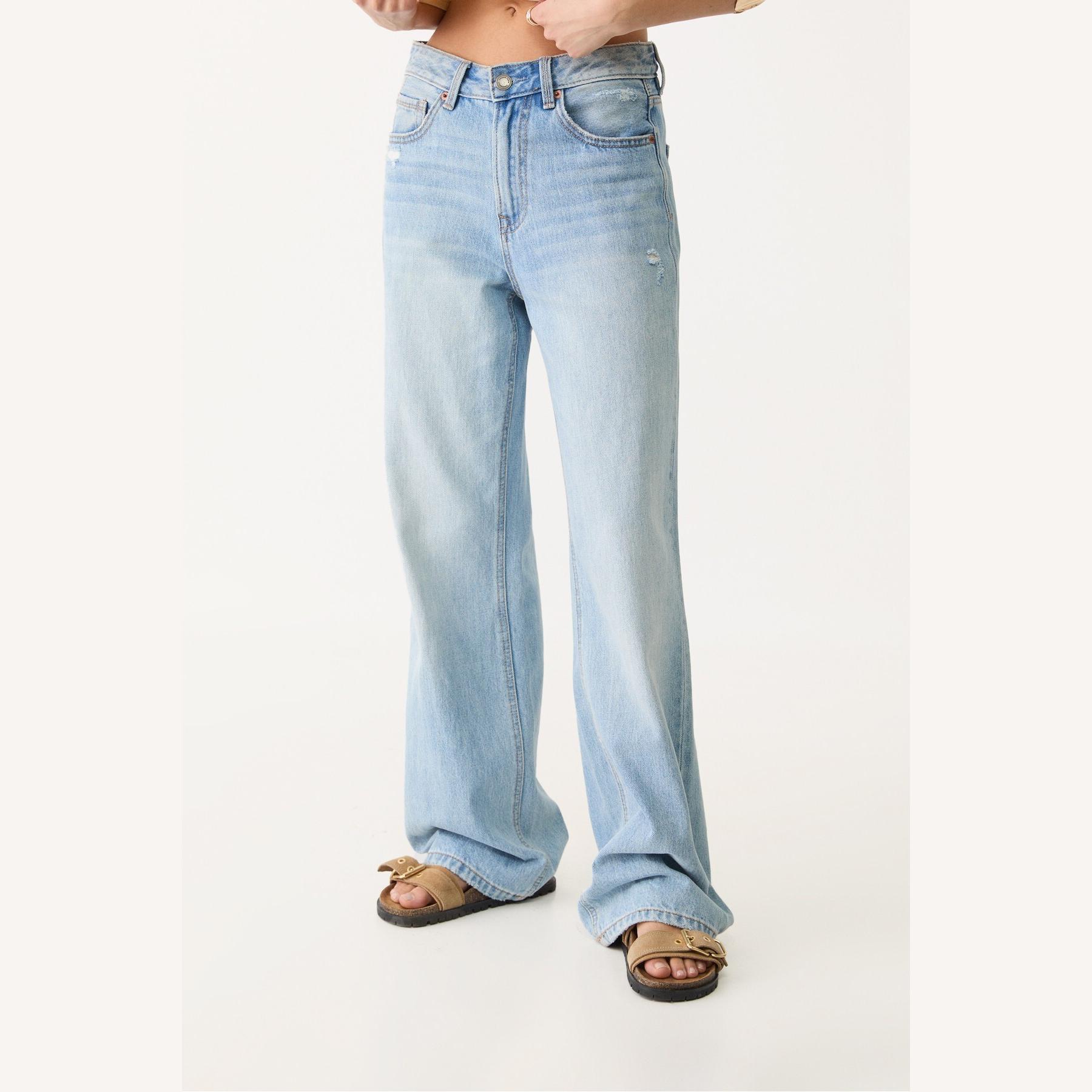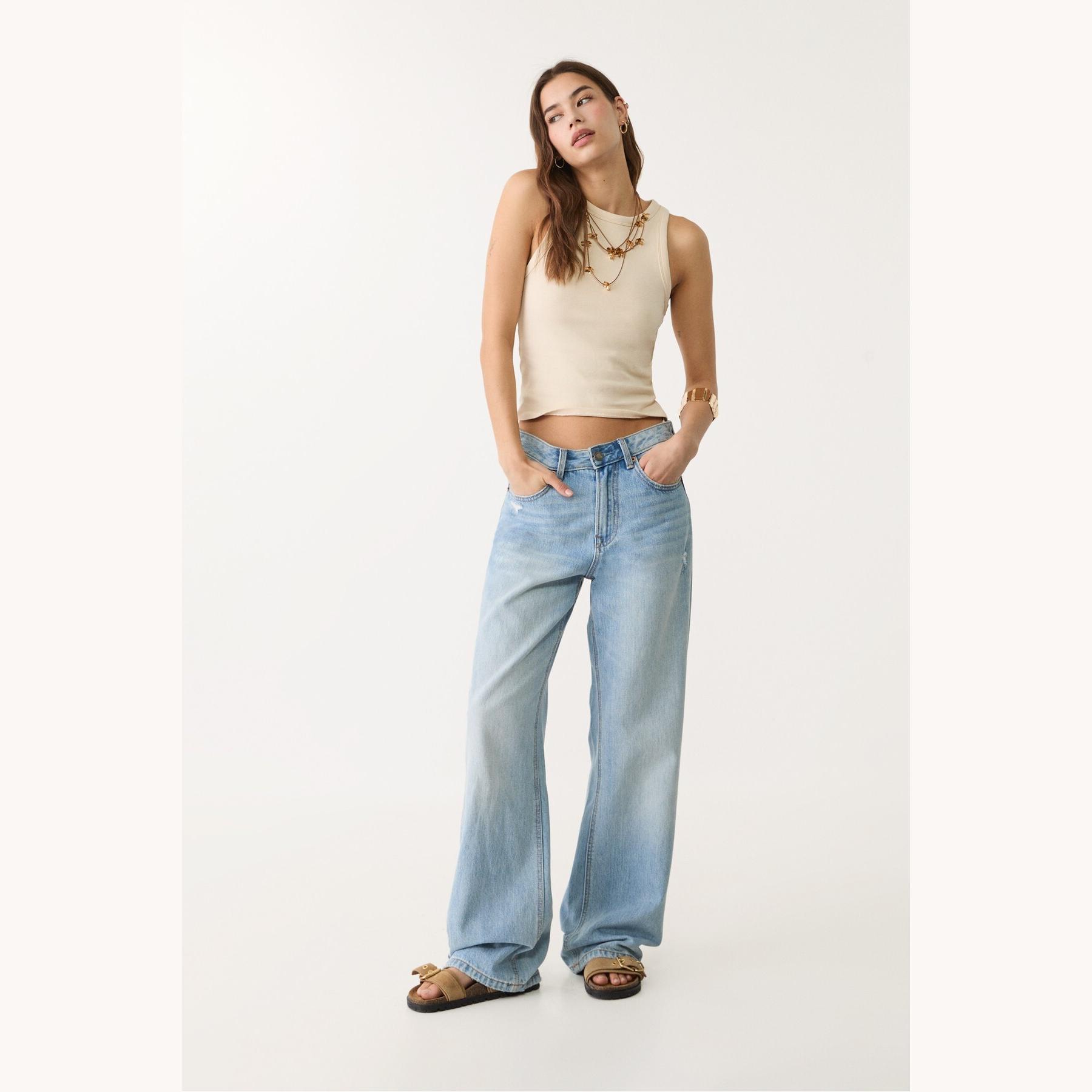 بنطال جينز أنيق من Stradivarius بلون أزرق فاتح دنيم، مصنوع من خامة قطنية 100% بملمس مريح، يتميز بقصة مستقيمة واسعة (Straight Wide Fit) وخصر عادي يغطي منطقة السرة، مزود بإغلاق أمامي بسحاب وزر معدني، تصميم بخمسة جيوب عملية، بدون حزام، وأطراف بطول قياسي، مثالي للتنسيق مع توبات قصيرة أو جاكيتات لإطلالة كاجوال مريحة وعصرية.