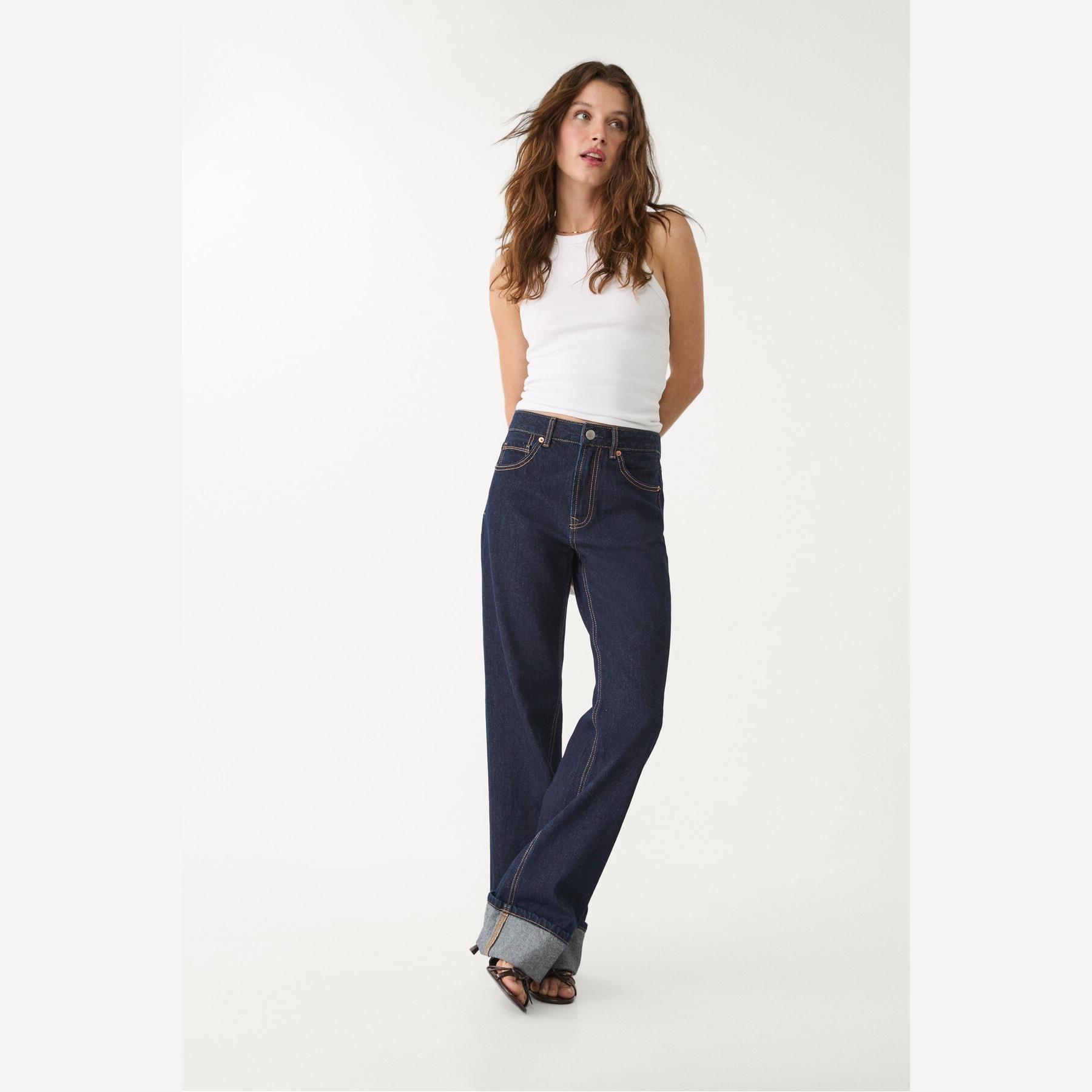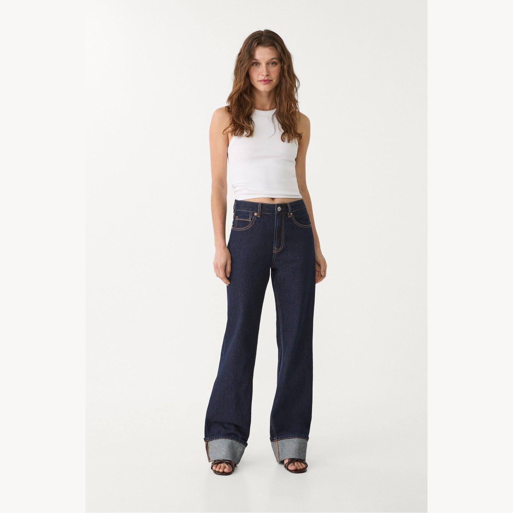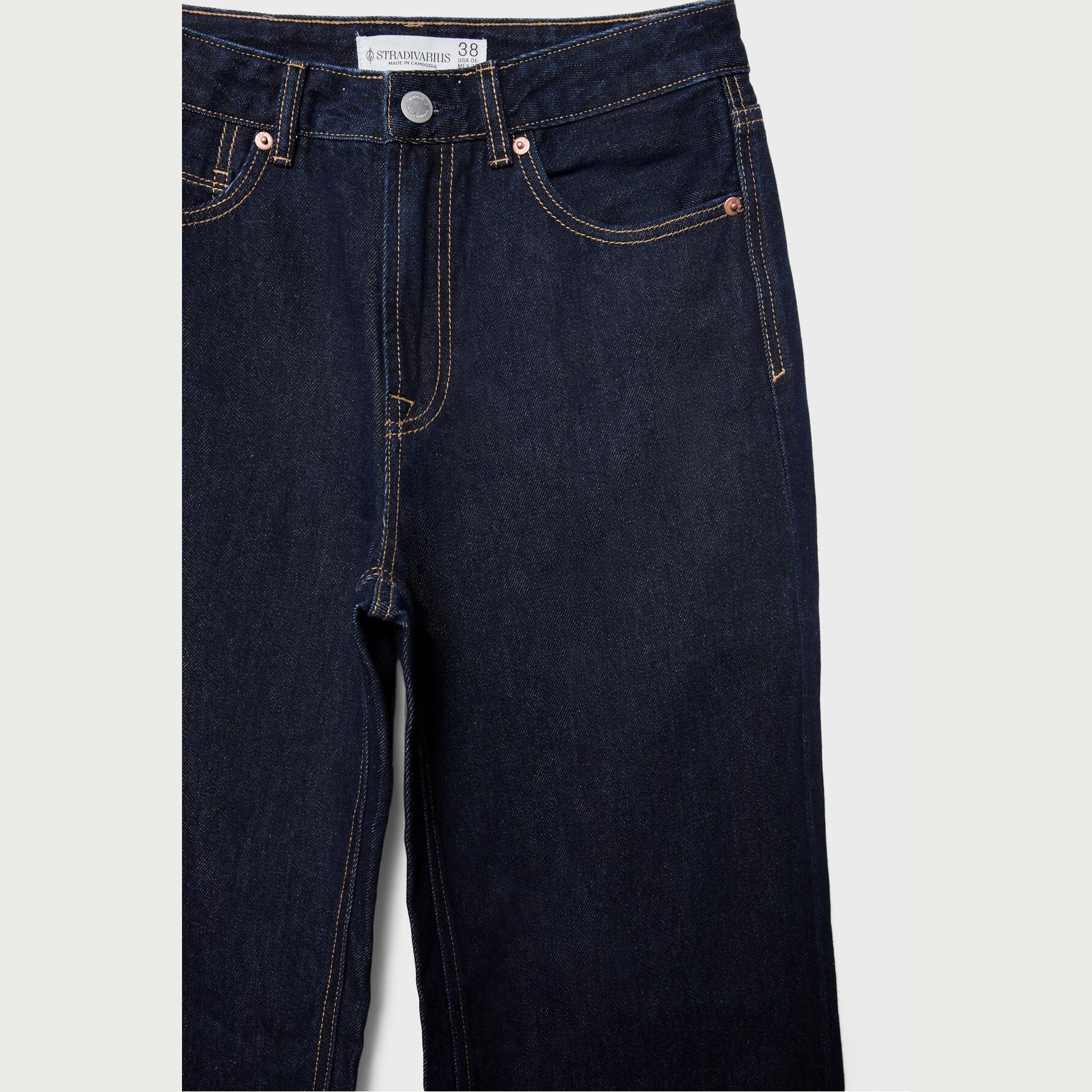 بنطال جينز أنيق من Stradivarius بلون كحلي مغسول، مصنوع من خامة قطنية 100% بملمس مريح، يتميز بقصة مستقيمة واسعة (Straight Wide Fit) وخصر عالي يغطي منطقة السرة، مزود بإغلاق أمامي بسحاب وزر معدني، تصميم بخمسة جيوب عملية، بدون حزام، وأطراف بطول قياسي، مثالي للتنسيق مع توبات قصيرة أو جاكيتات لإطلالة كاجوال مريحة وعصرية.