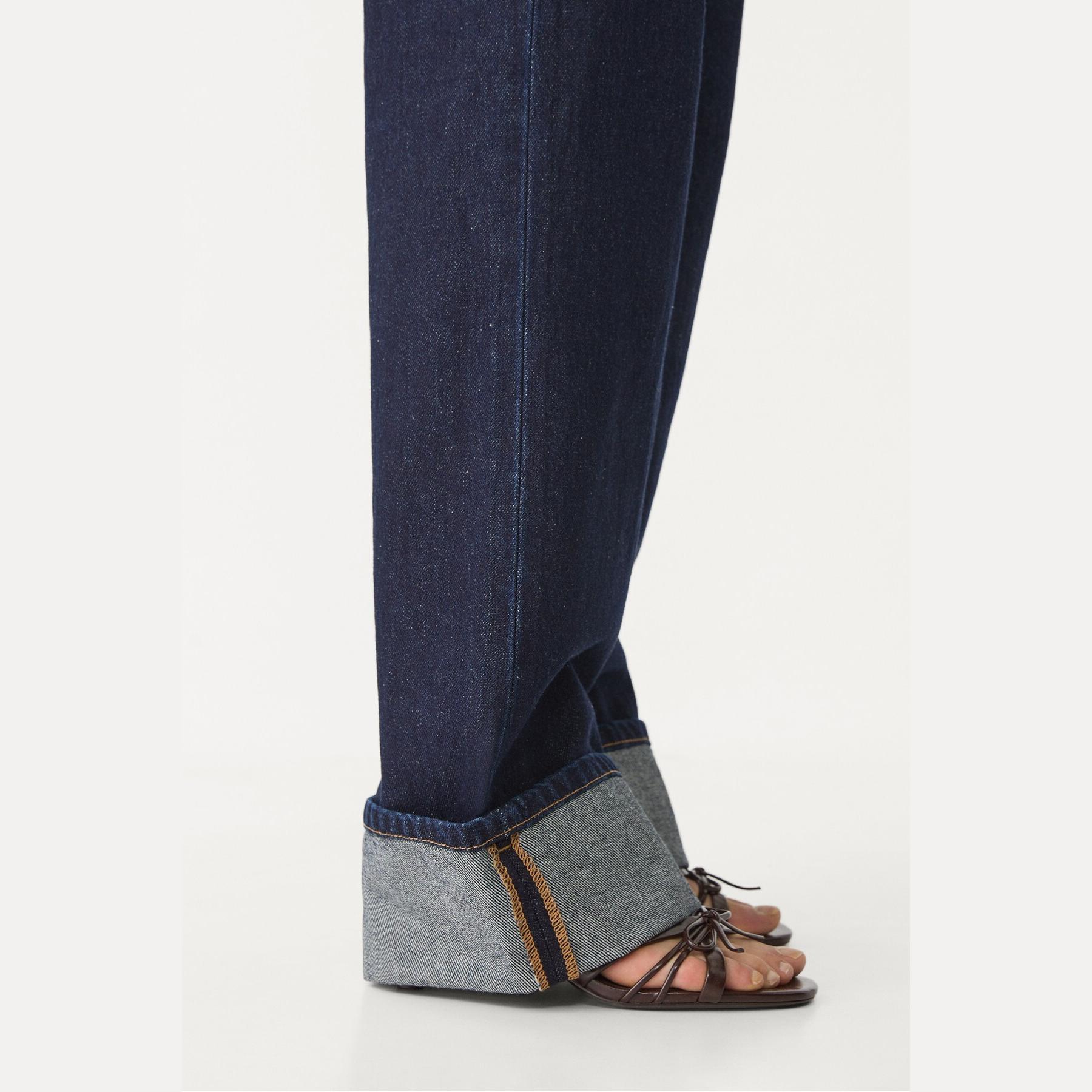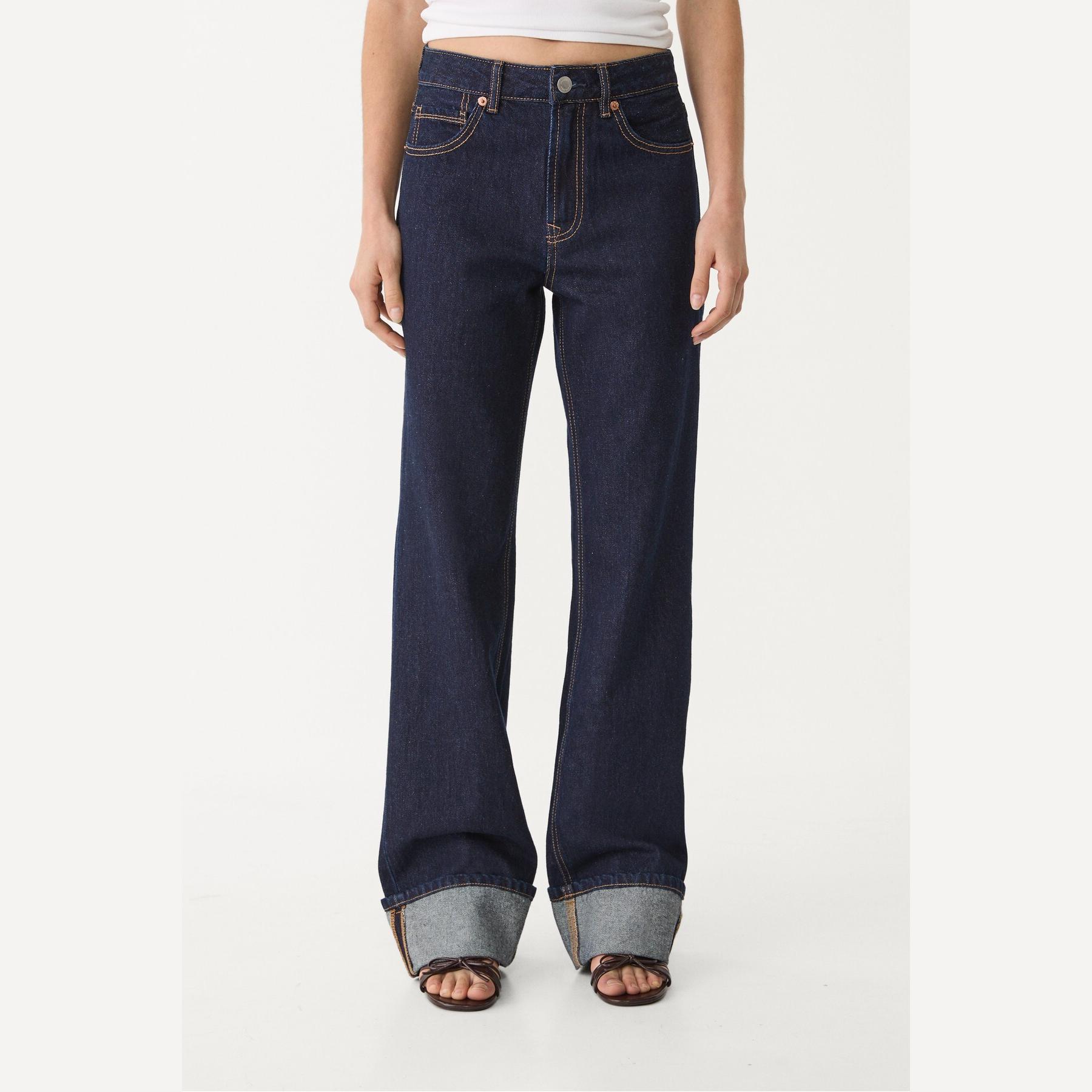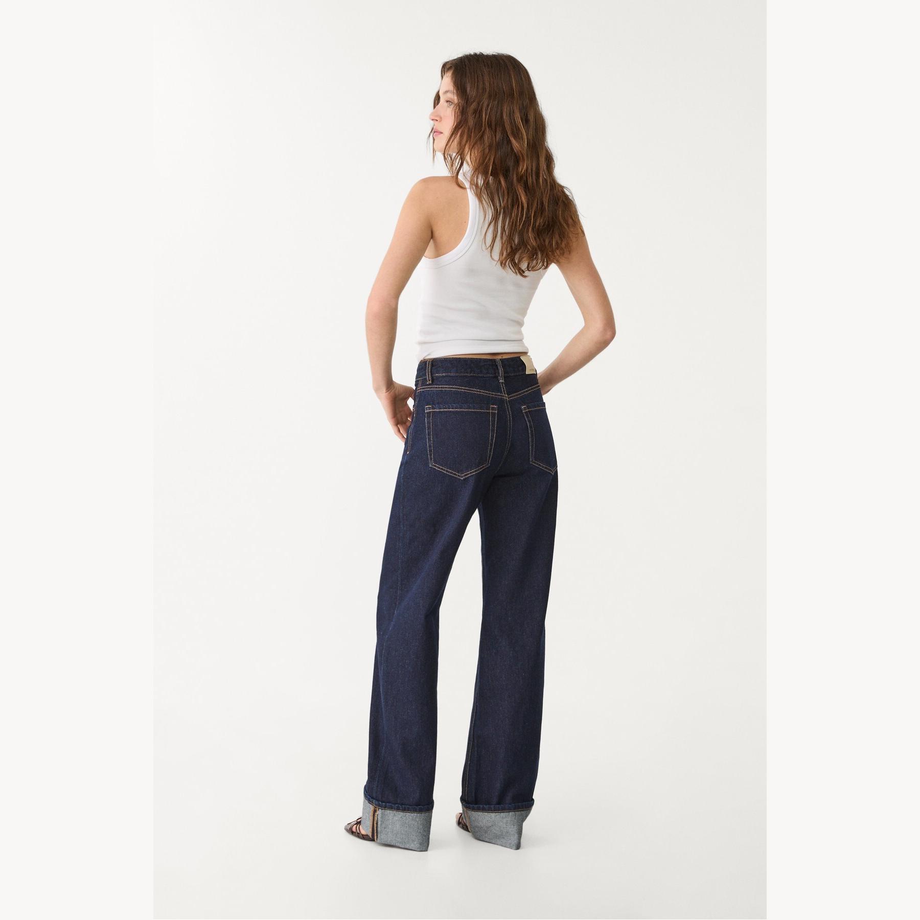 بنطال جينز أنيق من Stradivarius بلون كحلي مغسول، مصنوع من خامة قطنية 100% بملمس مريح، يتميز بقصة مستقيمة واسعة (Straight Wide Fit) وخصر عالي يغطي منطقة السرة، مزود بإغلاق أمامي بسحاب وزر معدني، تصميم بخمسة جيوب عملية، بدون حزام، وأطراف بطول قياسي، مثالي للتنسيق مع توبات قصيرة أو جاكيتات لإطلالة كاجوال مريحة وعصرية.