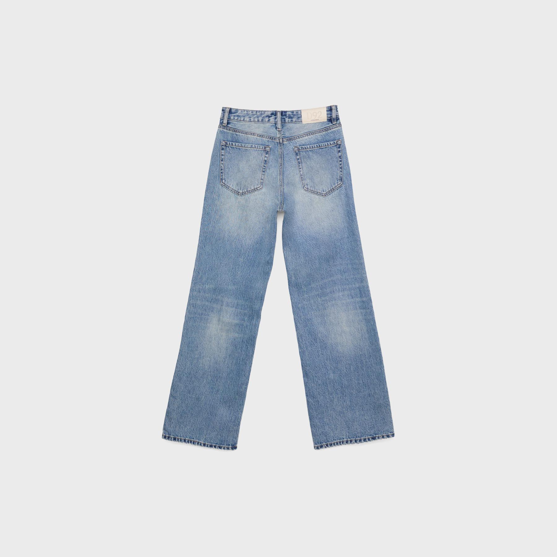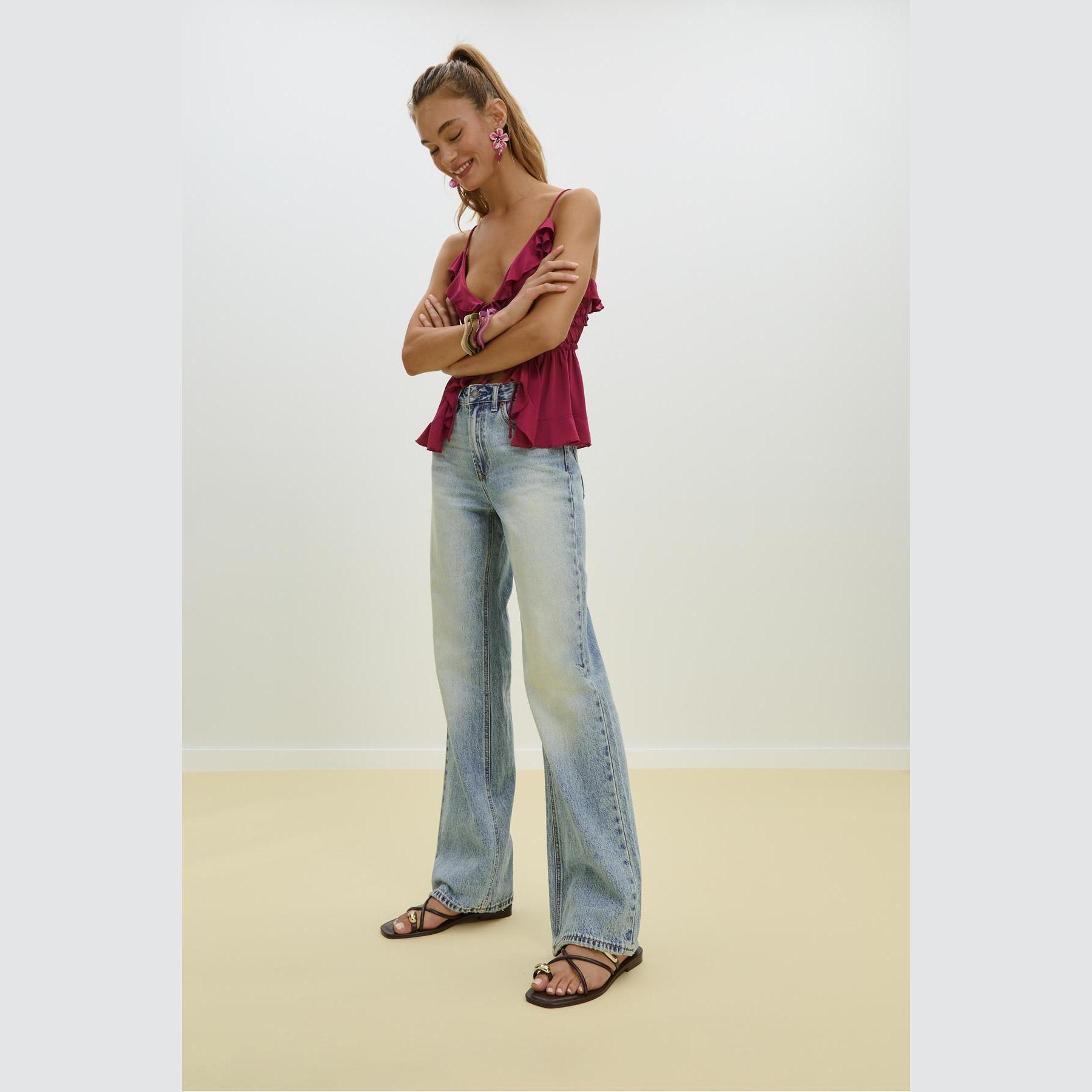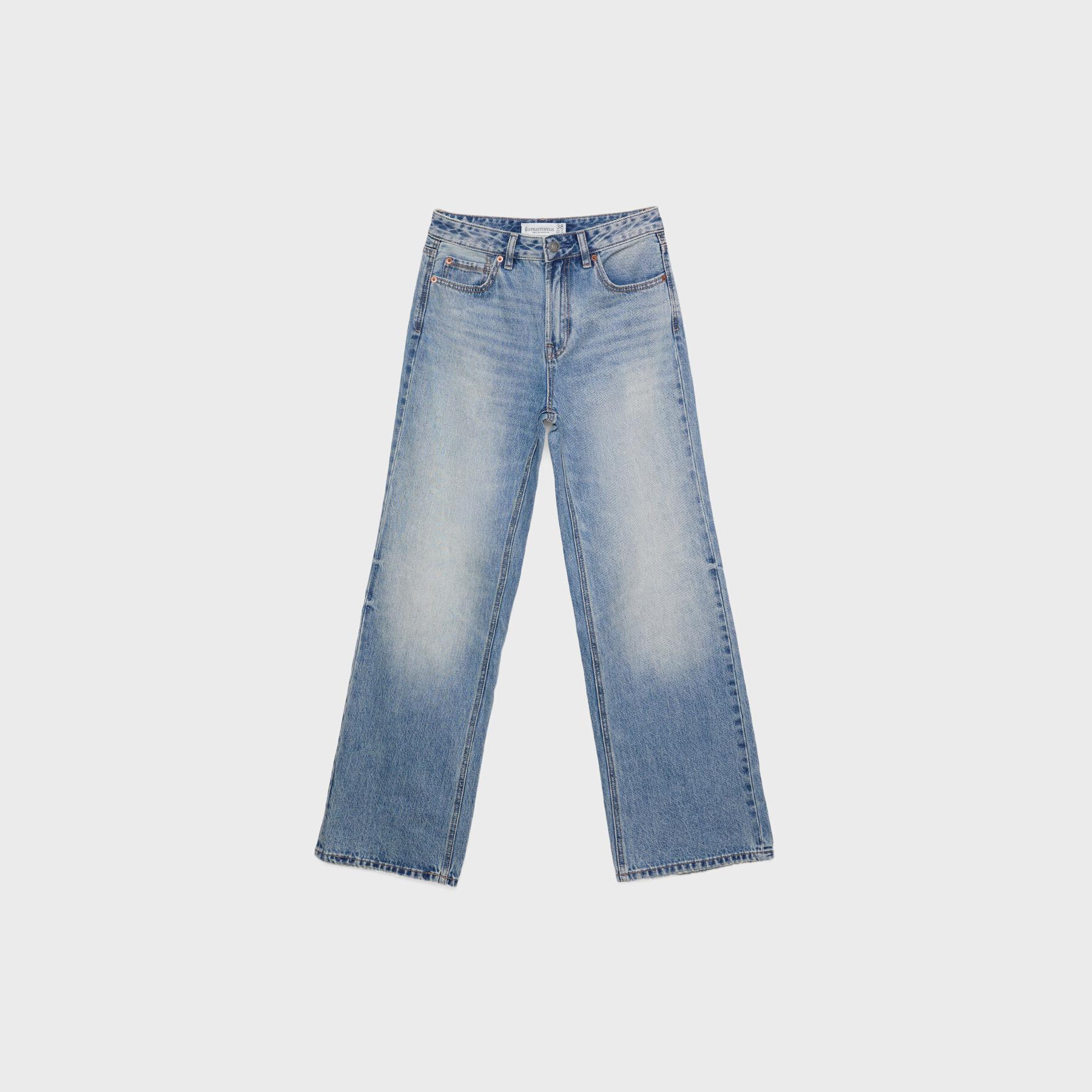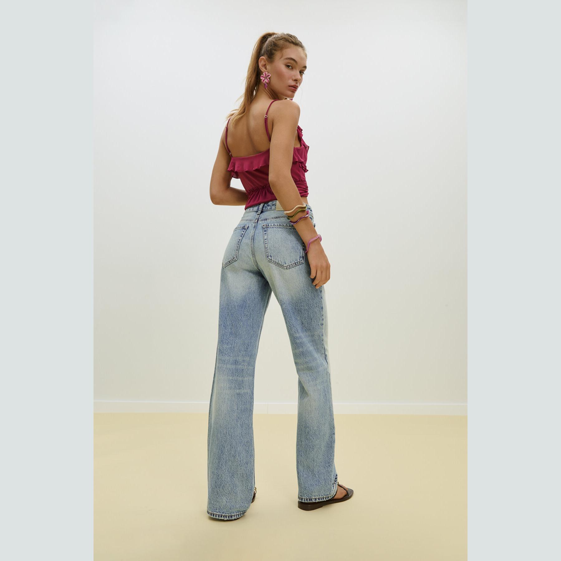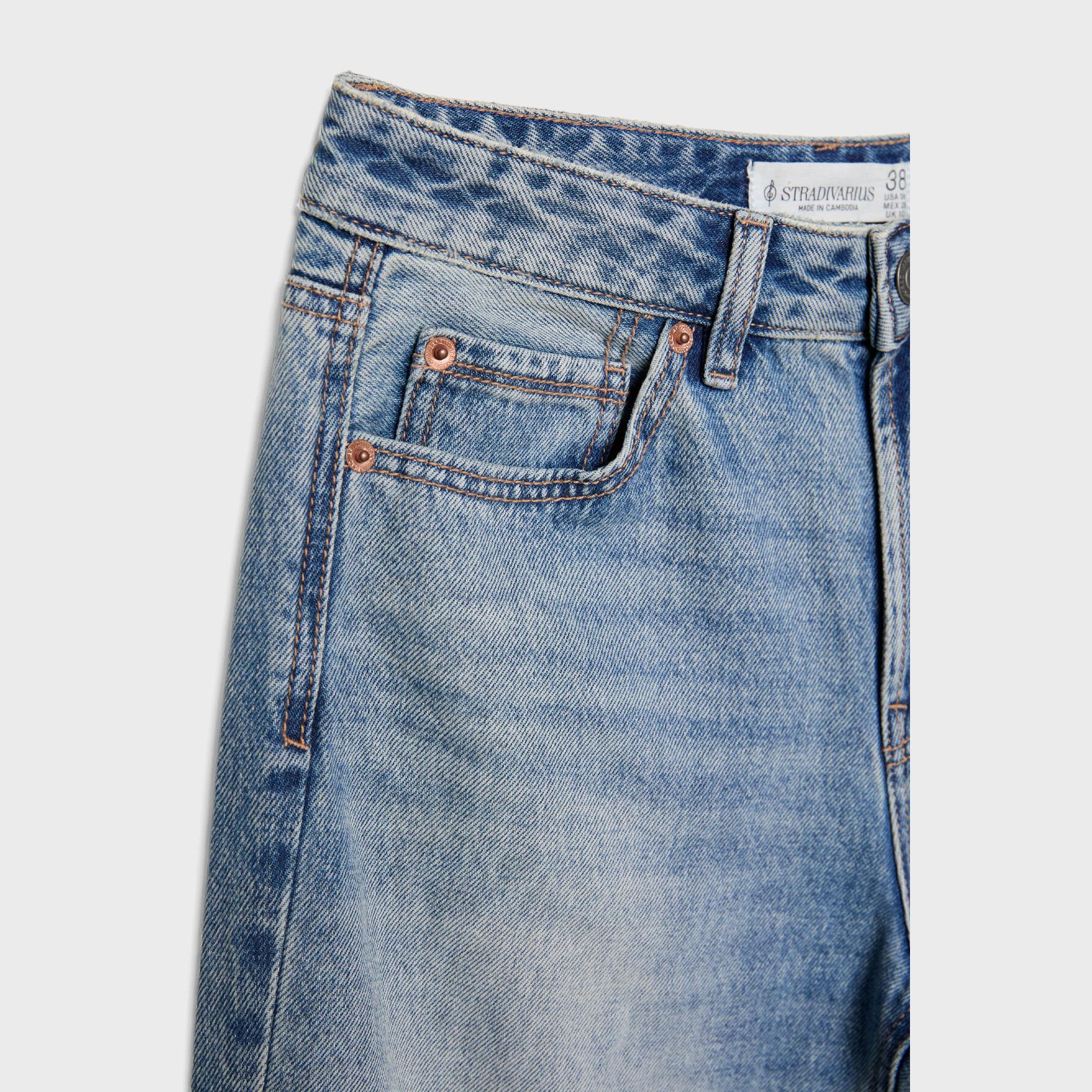 بنطال جينز أنيق من Stradivarius بلون أزرق متوسط مغسول، مصنوع من خامة قطنية 100% بملمس مريح، يتميز بقصة مستقيمة واسعة (Straight Wide Fit) وخصر عالي يغطي منطقة السرة، مزود بإغلاق أمامي بسحاب وزر معدني، تصميم بخمسة جيوب عملية، بدون حزام، وأطراف بطول قياسي، مثالي للتنسيق مع توبات قصيرة أو جاكيتات لإطلالة كاجوال مريحة وعصرية.