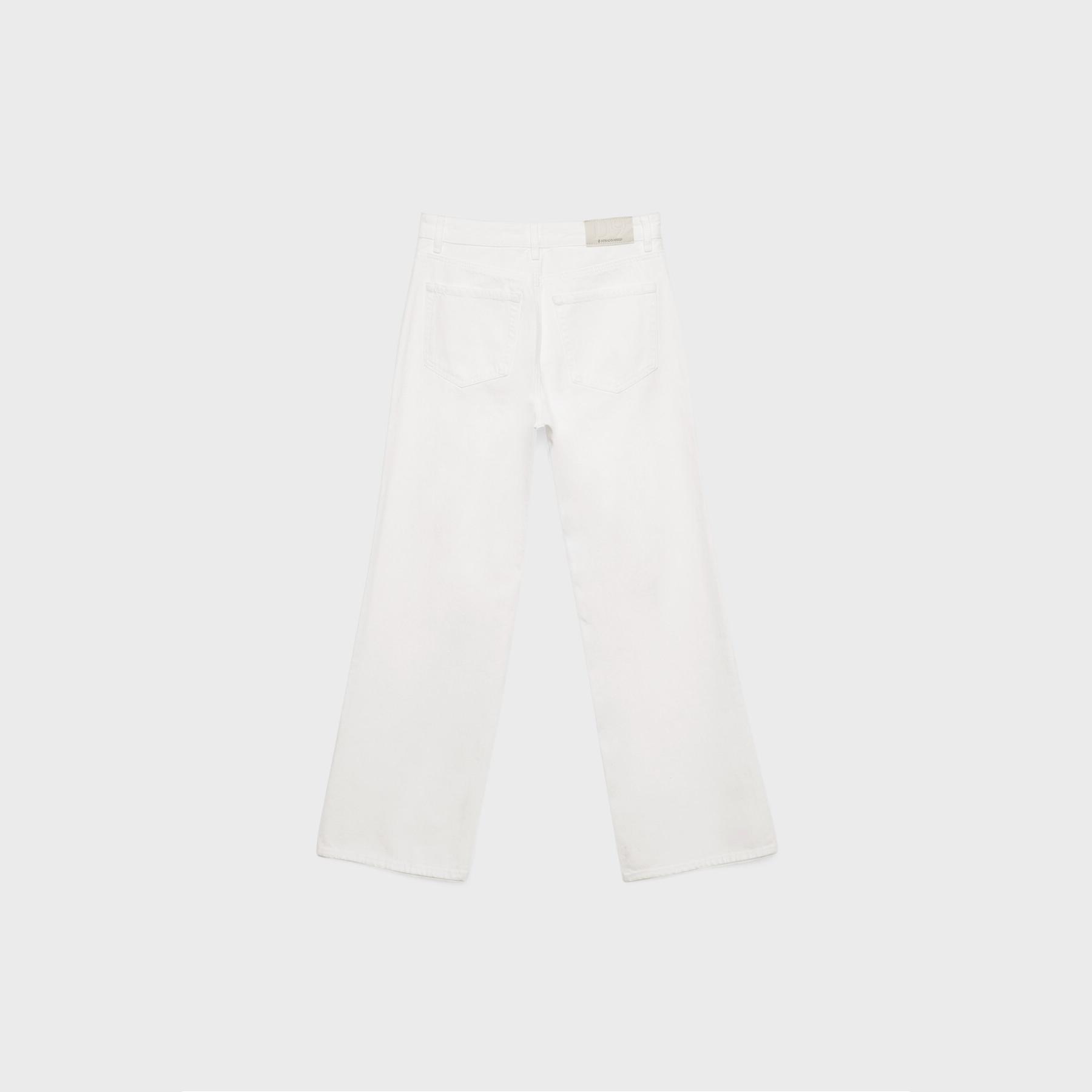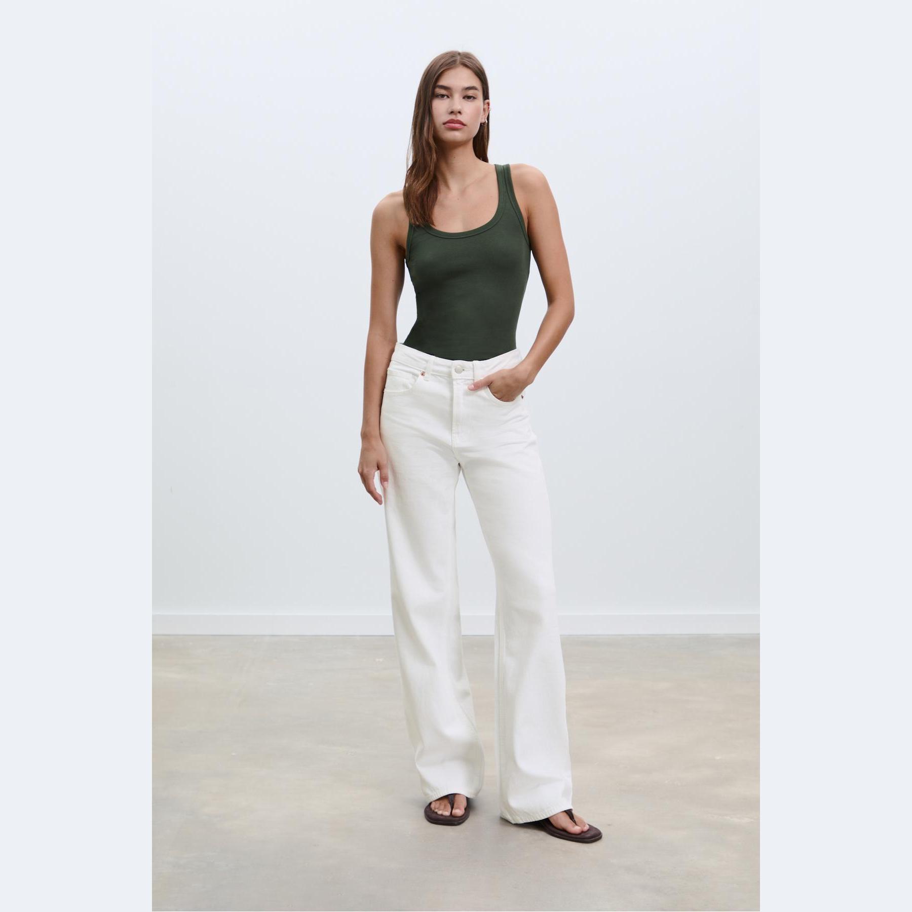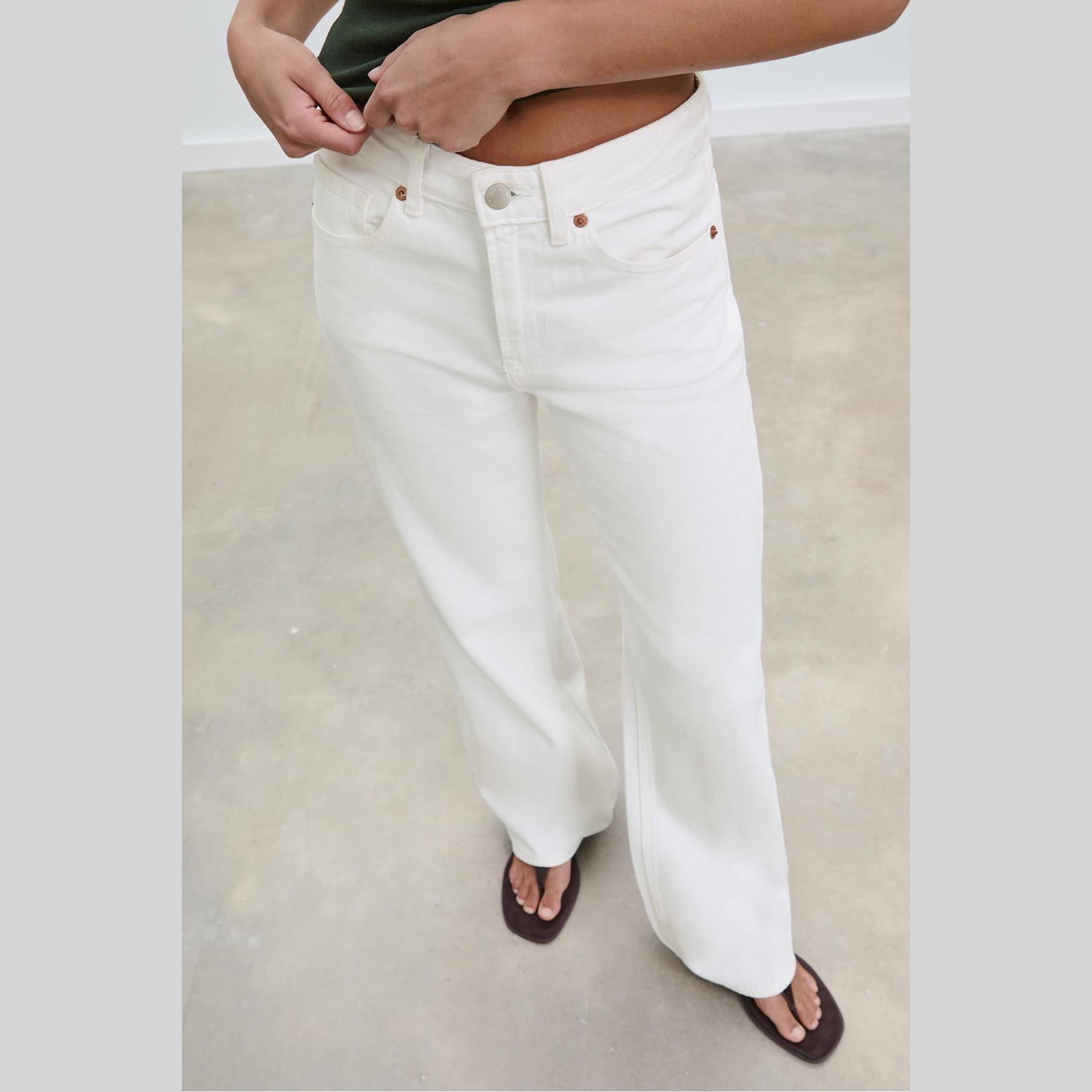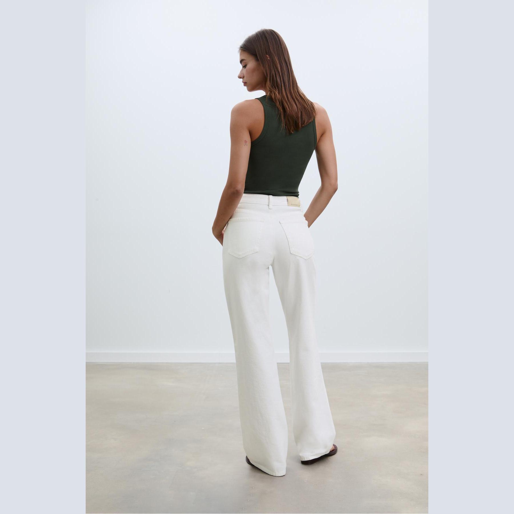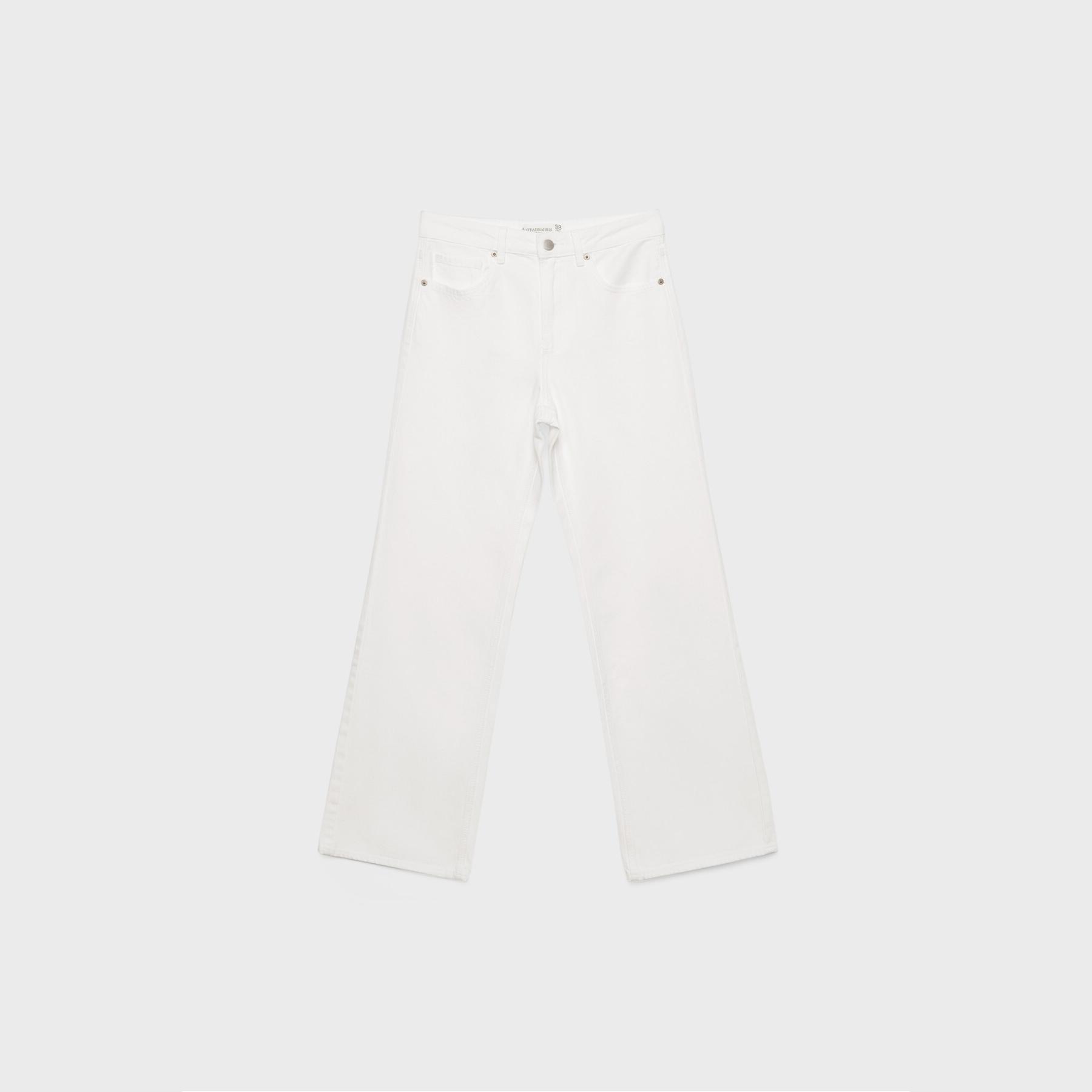 بنطال جينز أنيق من Stradivarius بلون أبيض نقي، مصنوع من خامة قطنية 100% بملمس مريح، يتميز بقصة مستقيمة واسعة (Straight Wide Fit) وخصر عادي يغطي منطقة السرة، مزود بإغلاق أمامي بسحاب وزر معدني، تصميم بخمسة جيوب عملية، بدون حزام، وأطراف بطول قياسي، مثالي للتنسيق مع توبات قصيرة أو قمصان مطبعة لإطلالة كاجوال صيفية وعصرية.