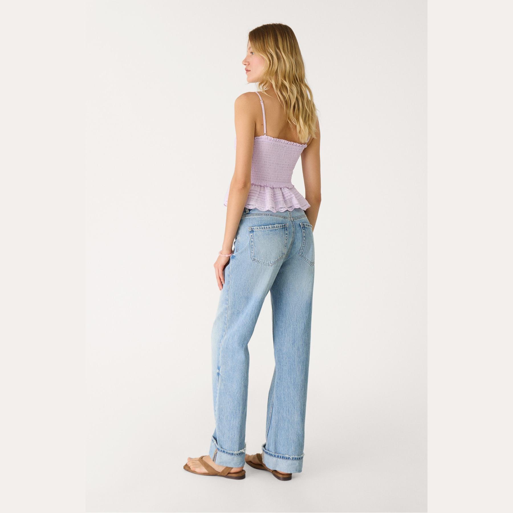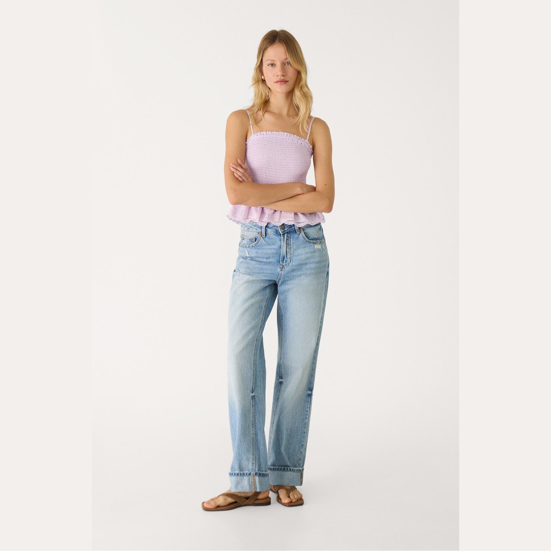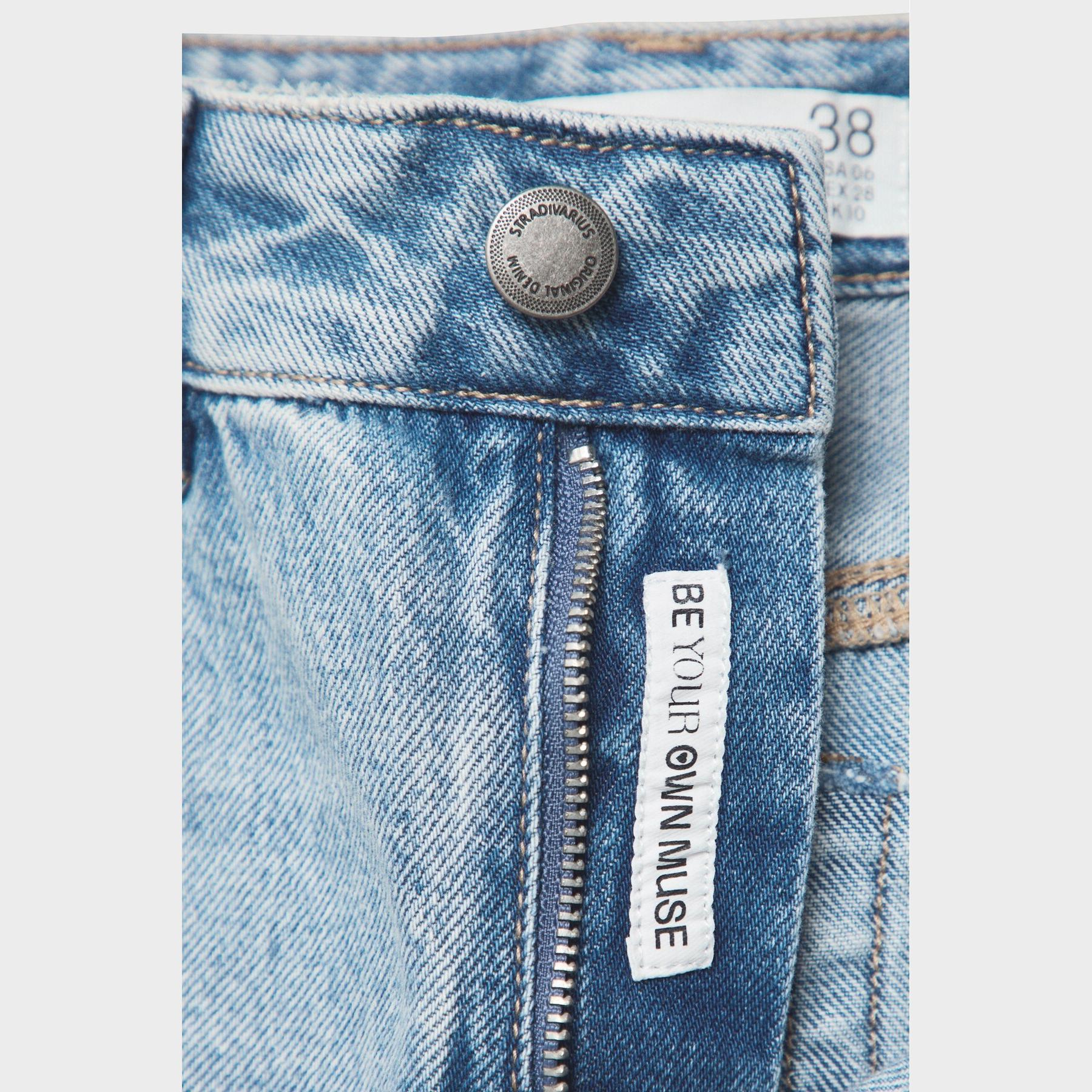 بنطال جينز أنيق من Stradivarius بلون أزرق فاتح دنيم، مصنوع من خامة قطنية 100% بملمس مريح، يتميز بقصة مستقيمة واسعة (Straight Wide Fit) وخصر عالي يغطي منطقة السرة، مزود بإغلاق أمامي بسحاب وزر معدني، تصميم بخمسة جيوب عملية، بدون حزام، وأطراف بطول قياسي، مثالي للتنسيق مع توبات قصيرة أو جاكيتات لإطلالة كاجوال مريحة وعصرية.