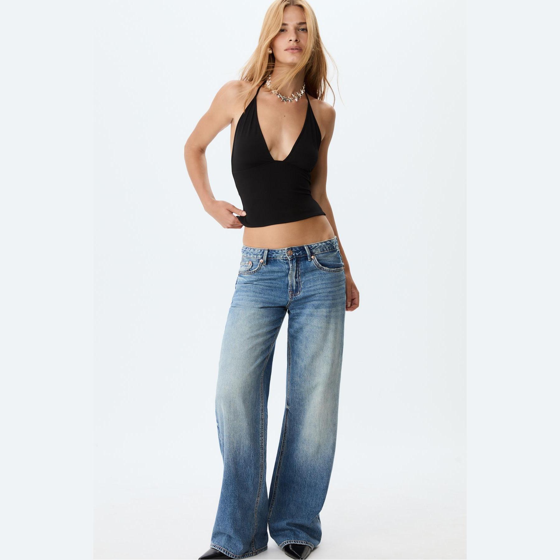 بنطال جينز أنيق من Stradivarius بلون أزرق متوسط مغسول، مصنوع من خامة قطنية 100%، يتميز بقصة مستقيمة واسعة (Straight Fit Wide Leg) وخصر منخفض يمنحك مظهرًا عصريًا، مزود بإغلاق أمامي بسحاب وزر معدني، تصميم بخمسة جيوب عملية (أمامية وخلفية)، وحلقات حزام، مثالي للتنسيق مع توبات قصيرة أو جاكيتات لإطلالة كاجوال مريحة وعصرية.