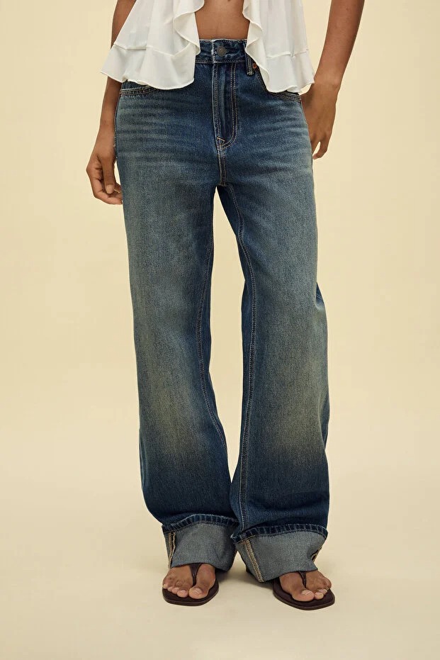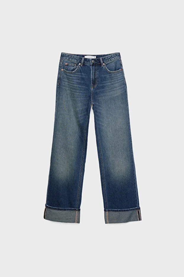 بنطال جينز أنيق من Stradivarius بلون ازرق، مصنوع من خامة قطنية 100% بملمس مريح، يتميز بقصة مستقيمة واسعة (Straight Wide Fit) وخصر عالي يغطي منطقة السرة، مزود بإغلاق أمامي بسحاب وزر معدني، تصميم بخمسة جيوب عملية، بدون حزام، وأطراف بطول قياسي، مثالي للتنسيق مع توبات قصيرة أو جاكيتات لإطلالة كاجوال مريحة وعصرية.