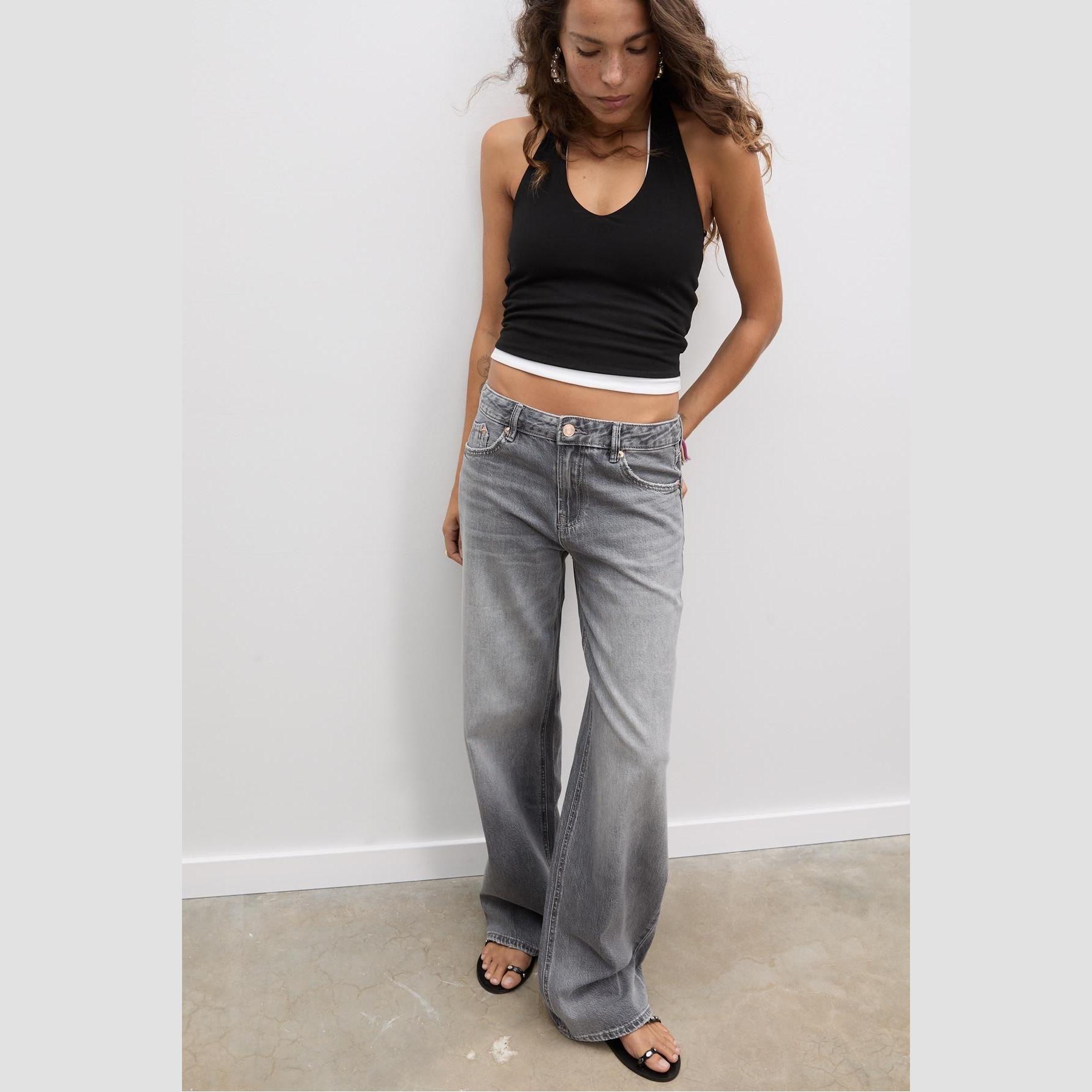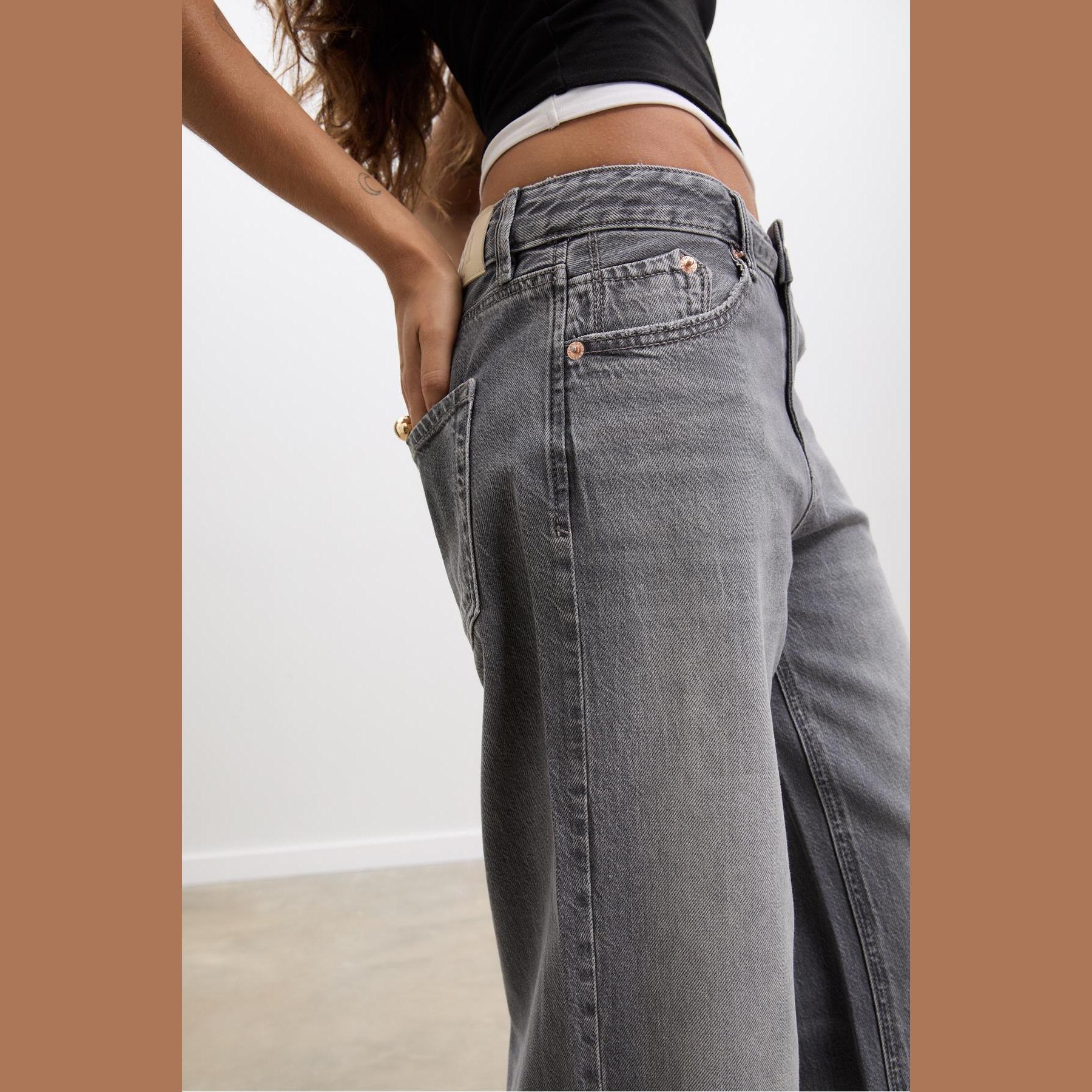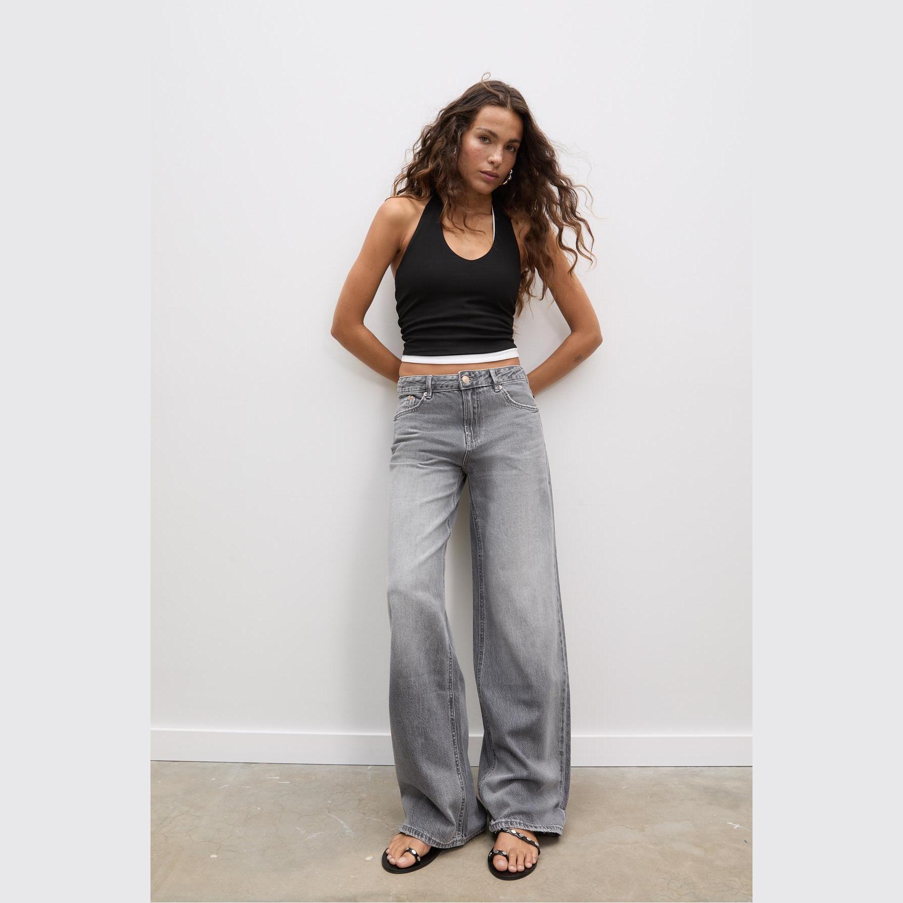 بنطال جينز أنيق من Stradivarius بلون رمادي مغسول، مصنوع من خامة قطنية 100%، يتميز بقصة مستقيمة واسعة (Straight Fit Wide Leg) وخصر منخفض يمنحك مظهرًا عصريًا، مزود بإغلاق أمامي بسحاب وزر معدني، تصميم بخمسة جيوب عملية (أمامية وخلفية)، وحلقات حزام، مثالي للتنسيق مع توبات قصيرة أو جاكيتات لإطلالة كاجوال مريحة وعصرية.