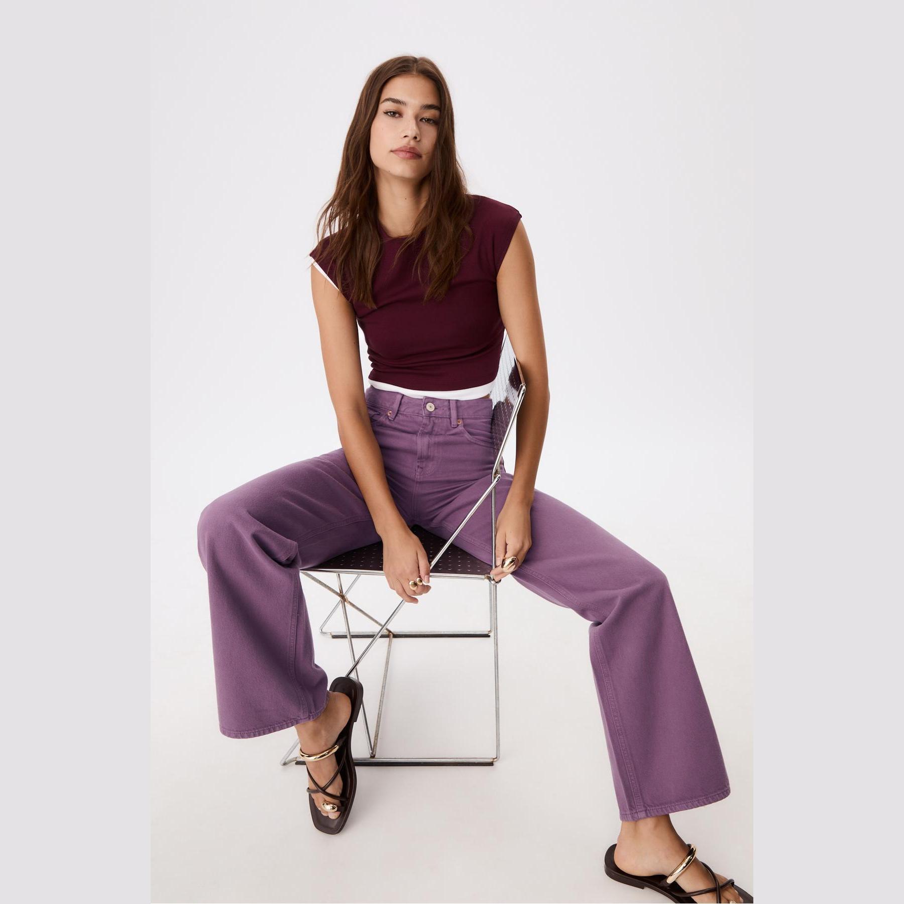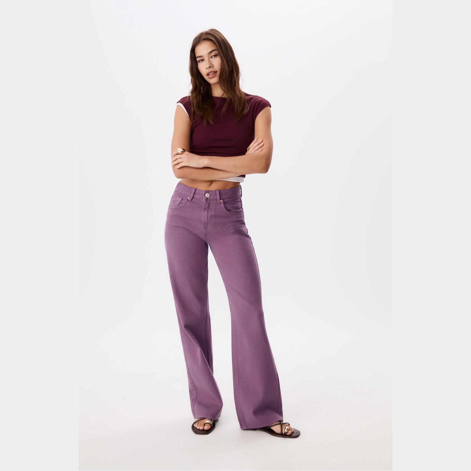 بنطال جينز أنيق من Stradivarius بلون بنفسجي مغسول غير لامع، مصنوع من خامة قطنية 100% بملمس Vintage، يتميز بقصة مستقيمة واسعة (Straight Wide Fit) وخصر عادي يغطي منطقة السرة، مزود بإغلاق أمامي بسحاب وزر معدني، تصميم بخمسة جيوب عملية، بدون حزام، وأطراف بطول قياسي، مثالي للتنسيق مع توبات قصيرة أو جاكيتات لإطلالة كاجوال مريحة وعصرية.