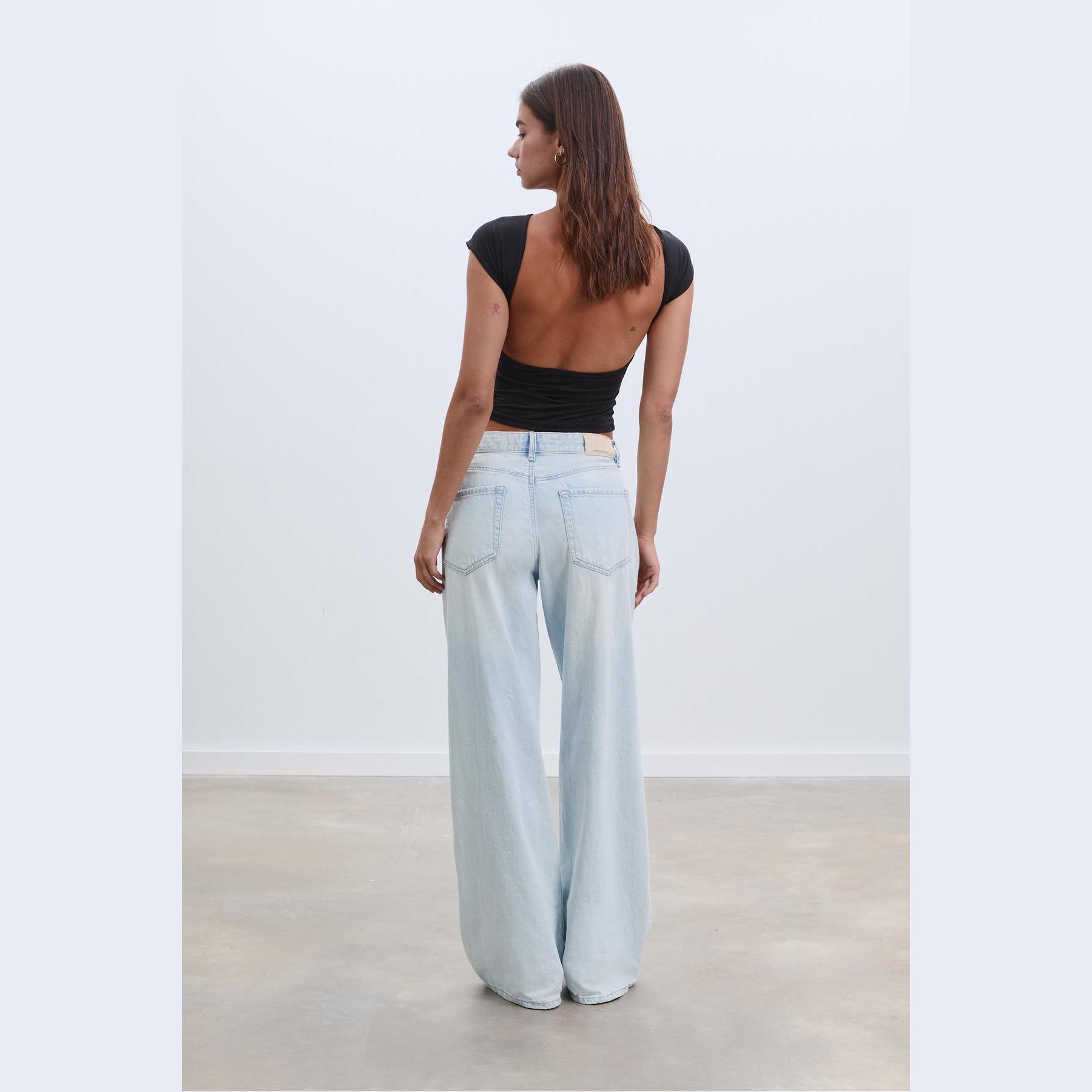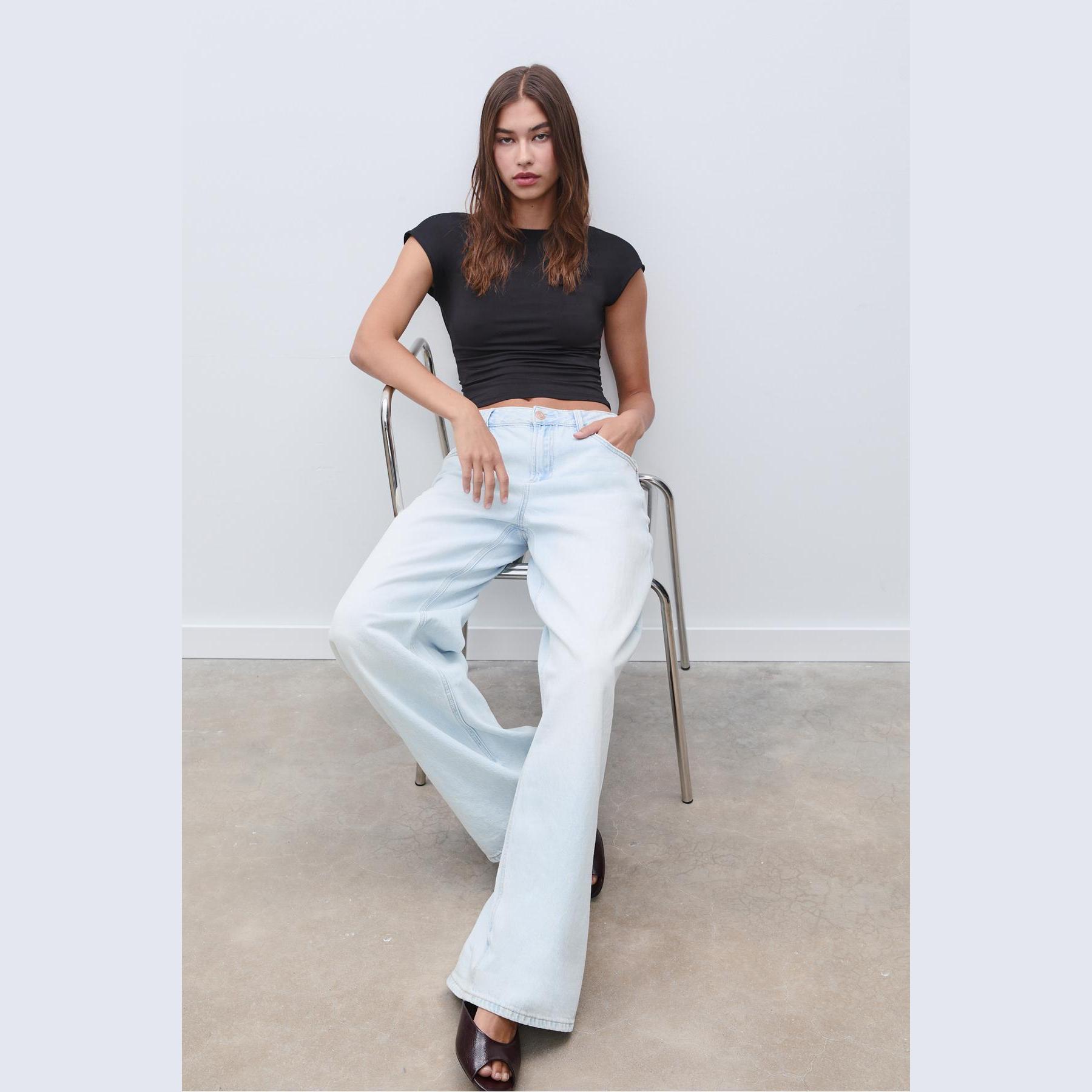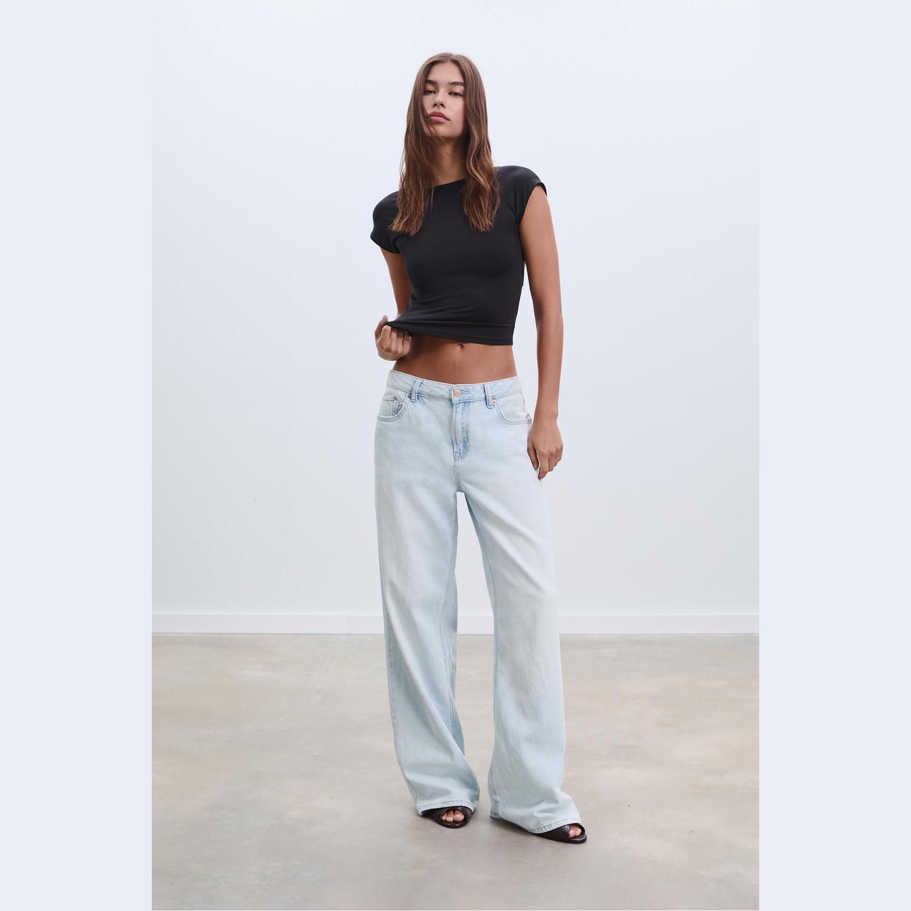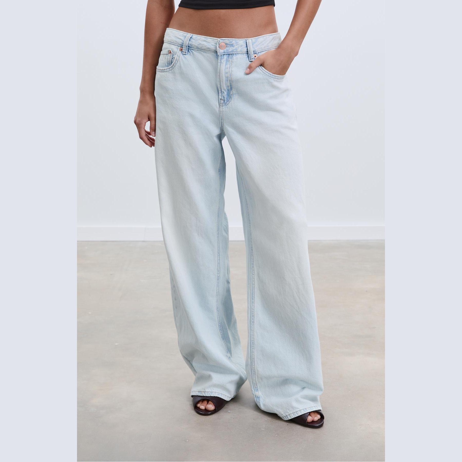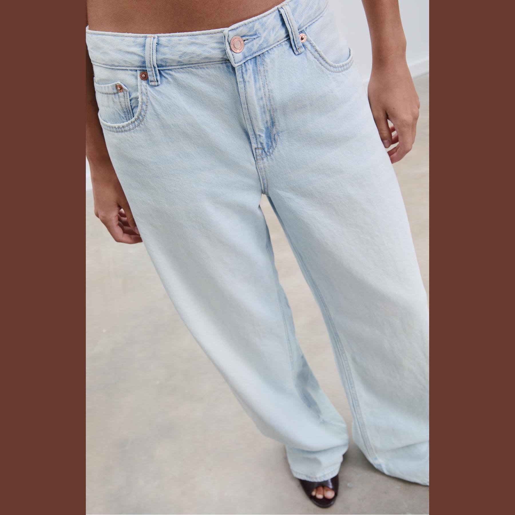بنطال جينز أنيق من Stradivarius بلون أزرق فاتح دنيم، مصنوع من خامة قطنية 100%، يتميز بقصة مستقيمة واسعة (Straight Fit Wide Leg) وخصر منخفض يمنحك مظهرًا عصريًا، مزود بإغلاق أمامي بسحاب وزر معدني، تصميم بخمسة جيوب عملية (أمامية + خلفية)، وحلقات حزام، مثالي للتنسيق مع توبات قصيرة أو جاكيتات لإطلالة كاجوال مريحة وعصرية.