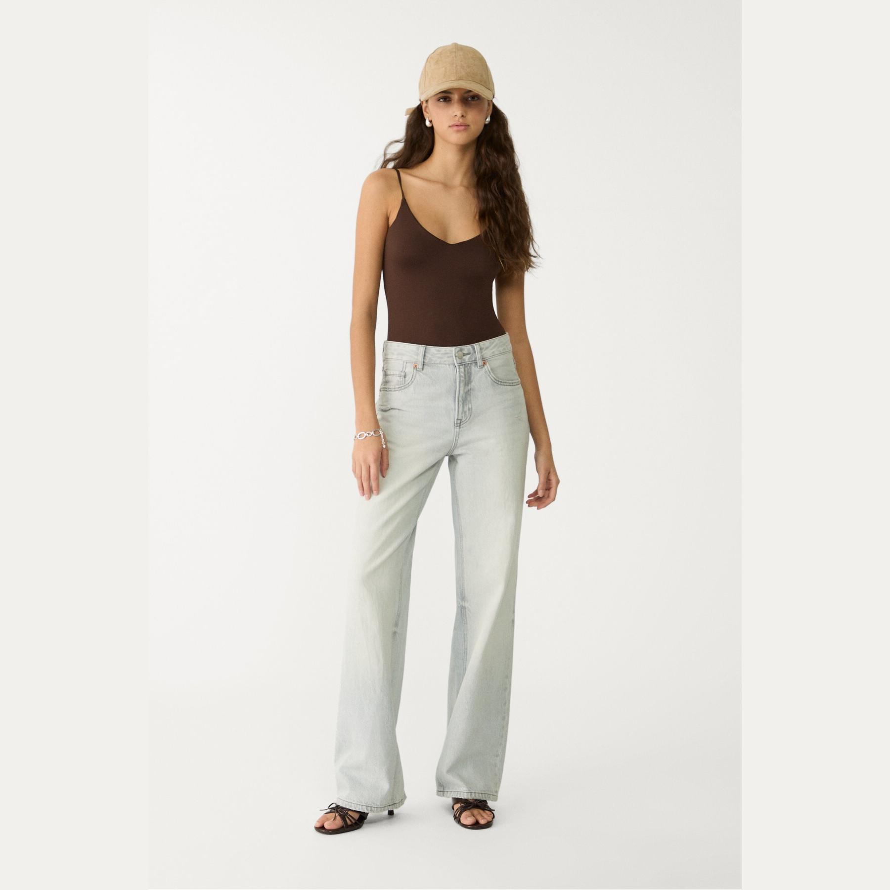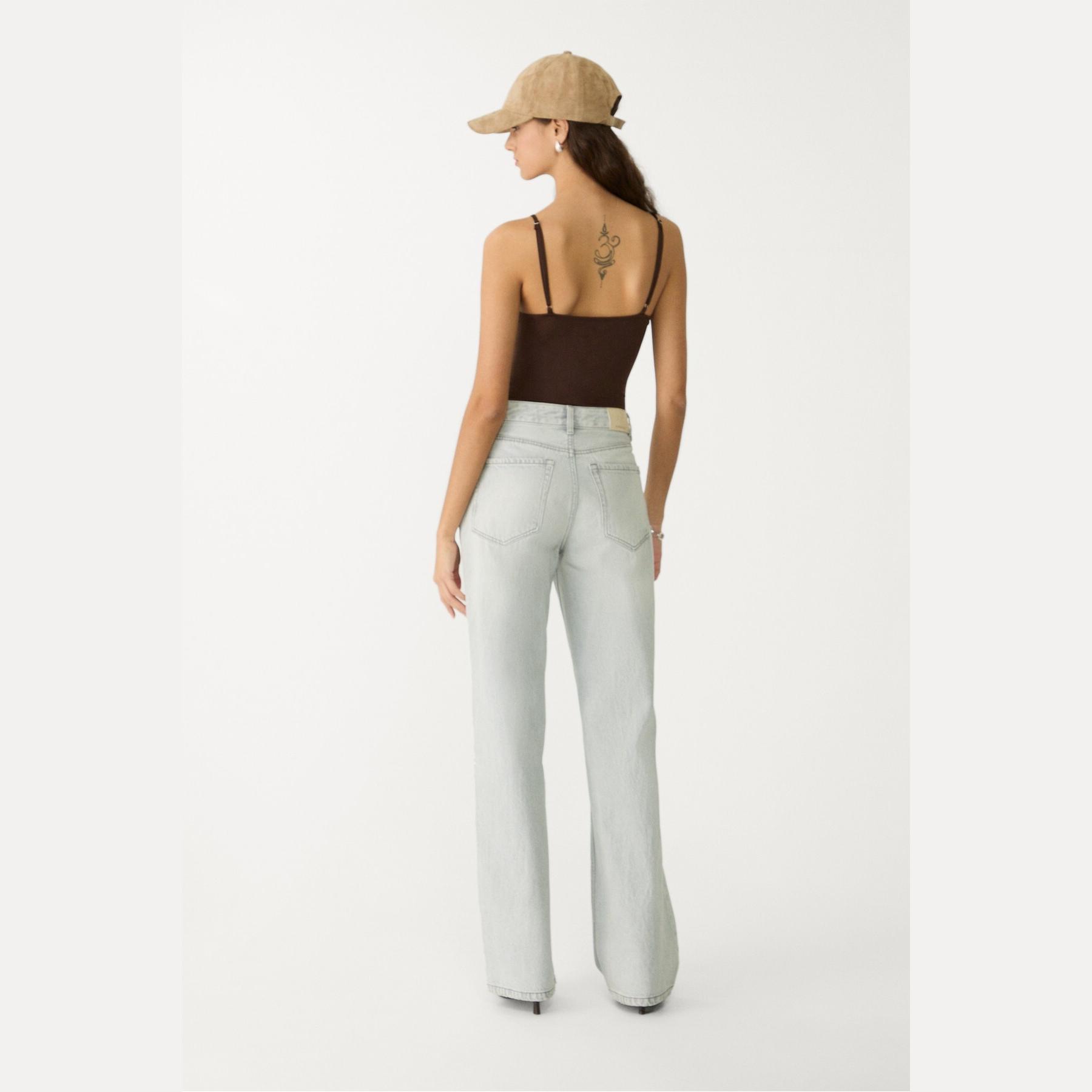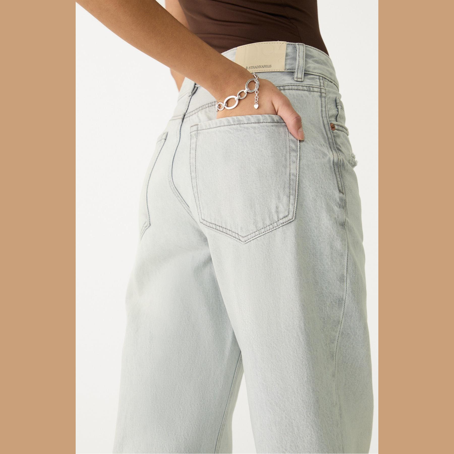 بنطال جينز أنيق من Stradivarius بلون رمادي مغسول، مصنوع من خامة قطنية 100% بملمس Vintage، يتميز بقصة مستقيمة واسعة (Straight Wide Fit) وخصر عادي يغطي منطقة السرة، مزود بإغلاق أمامي بسحاب وزر معدني، تصميم بخمسة جيوب عملية، بدون حزام، وأطراف بطول قياسي، مثالي للتنسيق مع توبات قصيرة أو جاكيتات لإطلالة كاجوال مريحة وعصرية.