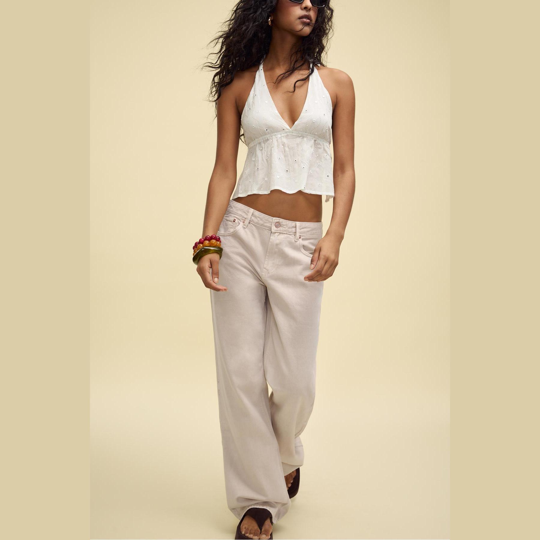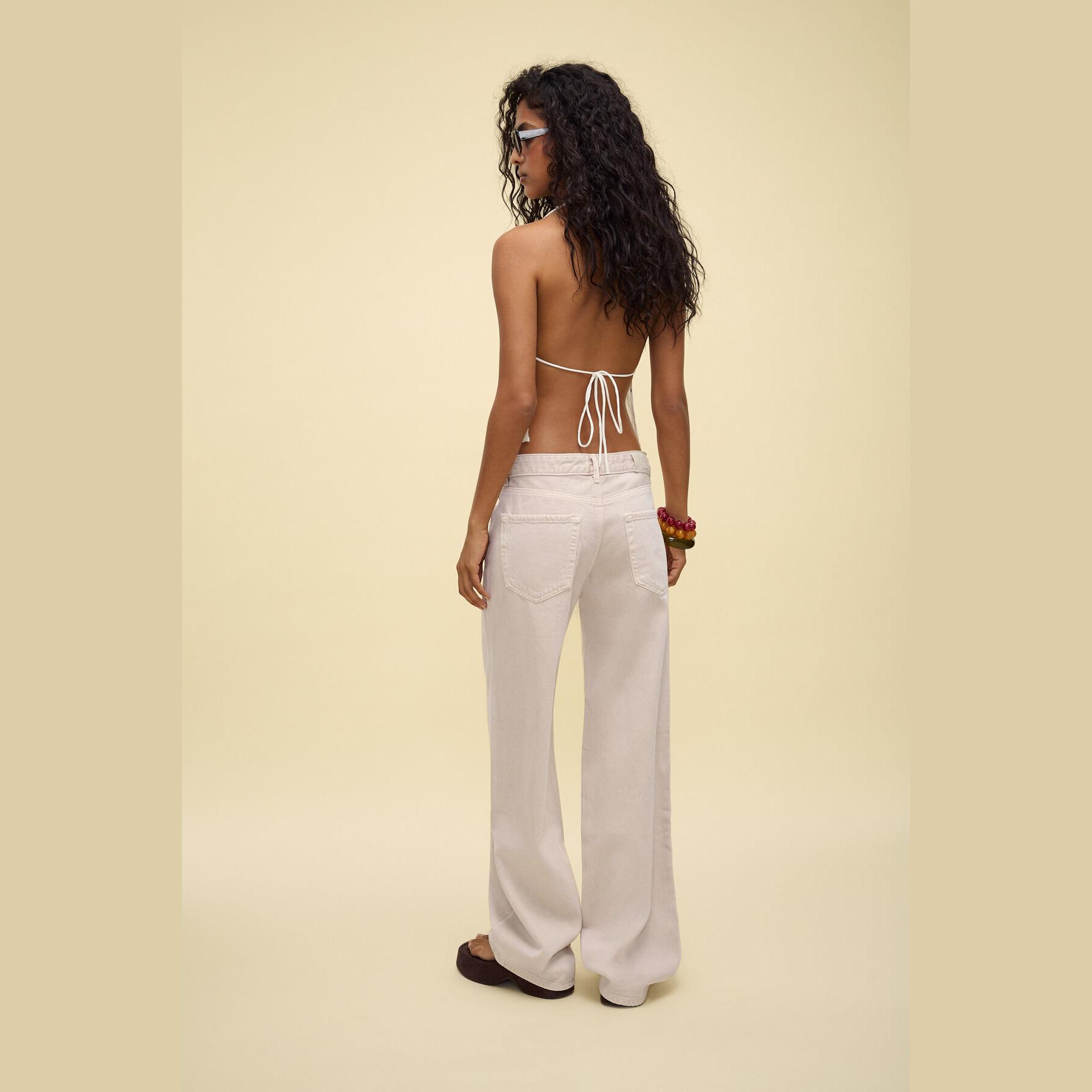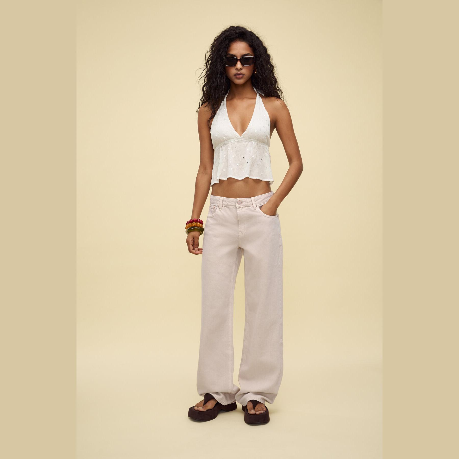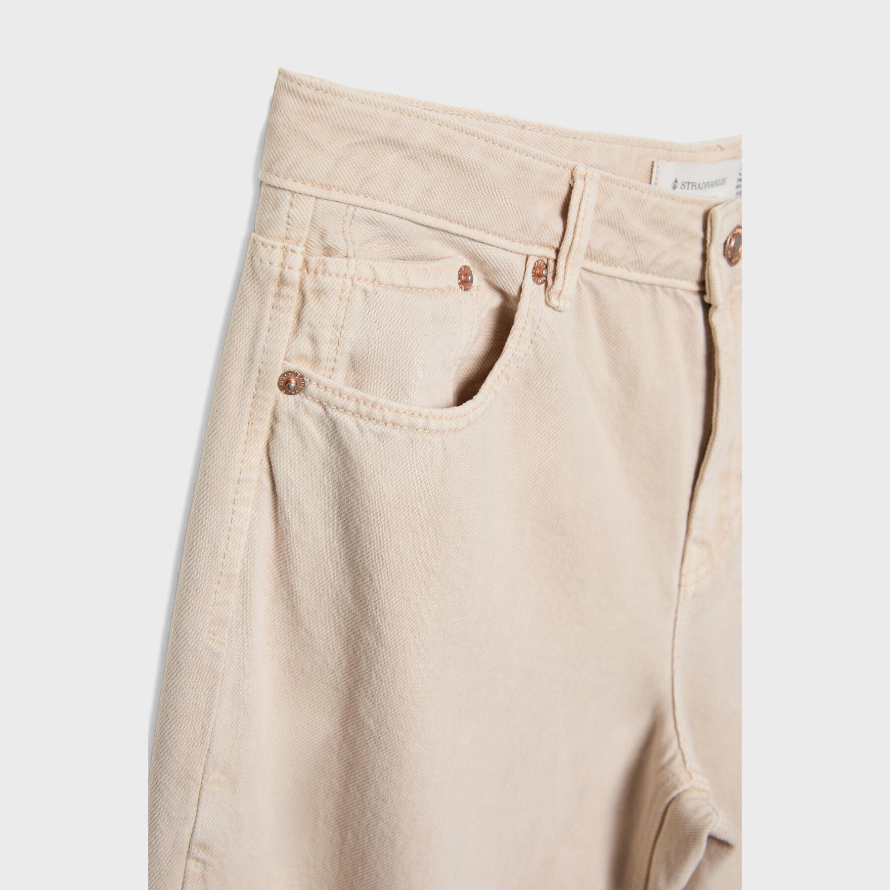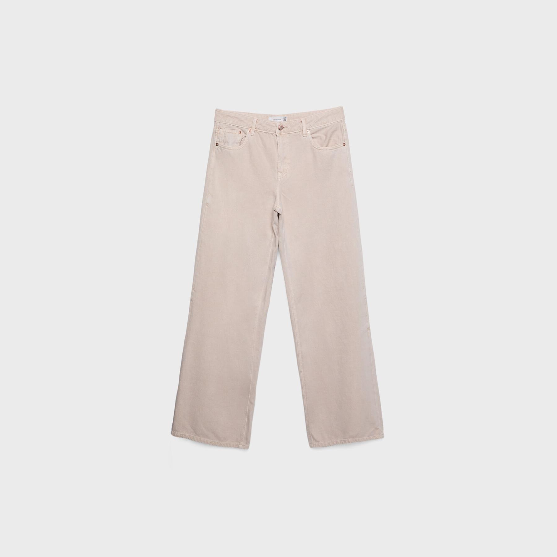 بنطال جينز أنيق من Stradivarius بلون كريمي غير لامع، مصنوع من خامة قطنية 100% مضلعة (Fitilli Dokuma)، يتميز بقصة مستقيمة واسعة (Straight Fit Wide Leg) وخصر منخفض يمنحك مظهرًا عصريًا، مزود بإغلاق أمامي بسحاب وزر معدني، تصميم بخمسة جيوب عملية (أمامية وخلفية)، وحلقات حزام، مثالي للتنسيق مع توبات قصيرة أو جاكيتات لإطلالة كاجوال مريحة وعصرية.